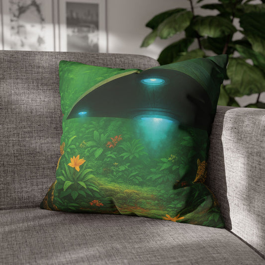 Faux Suede Square Pillowcase - UFO and Jaguars in Rainforest