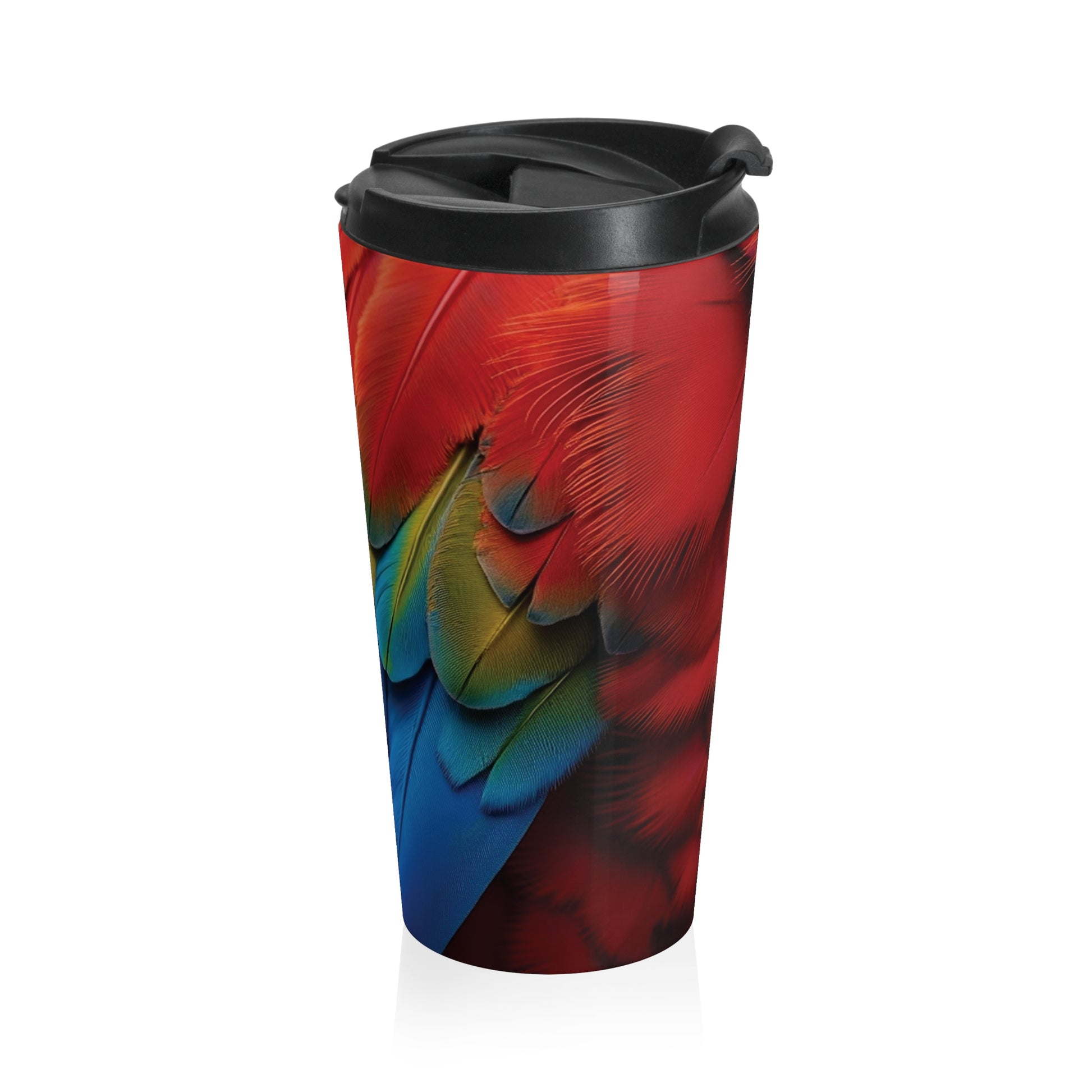 Enjoy your favorite beverages on the go with this stylish Stainless Steel Travel Mug. Crafted with design of colorful macaw parrot feathers, it adds a touch of paradise to your daily routine. Whether you're commuting to work, hitting the gym, or enjoying a leisurely stroll, this travel mug fits seamlessly into any lifestyle. Perfect for coffee lovers, tea enthusiasts, or anyone who needs to stay hydrated. Elevate your daily ritual with this must-have accessory!