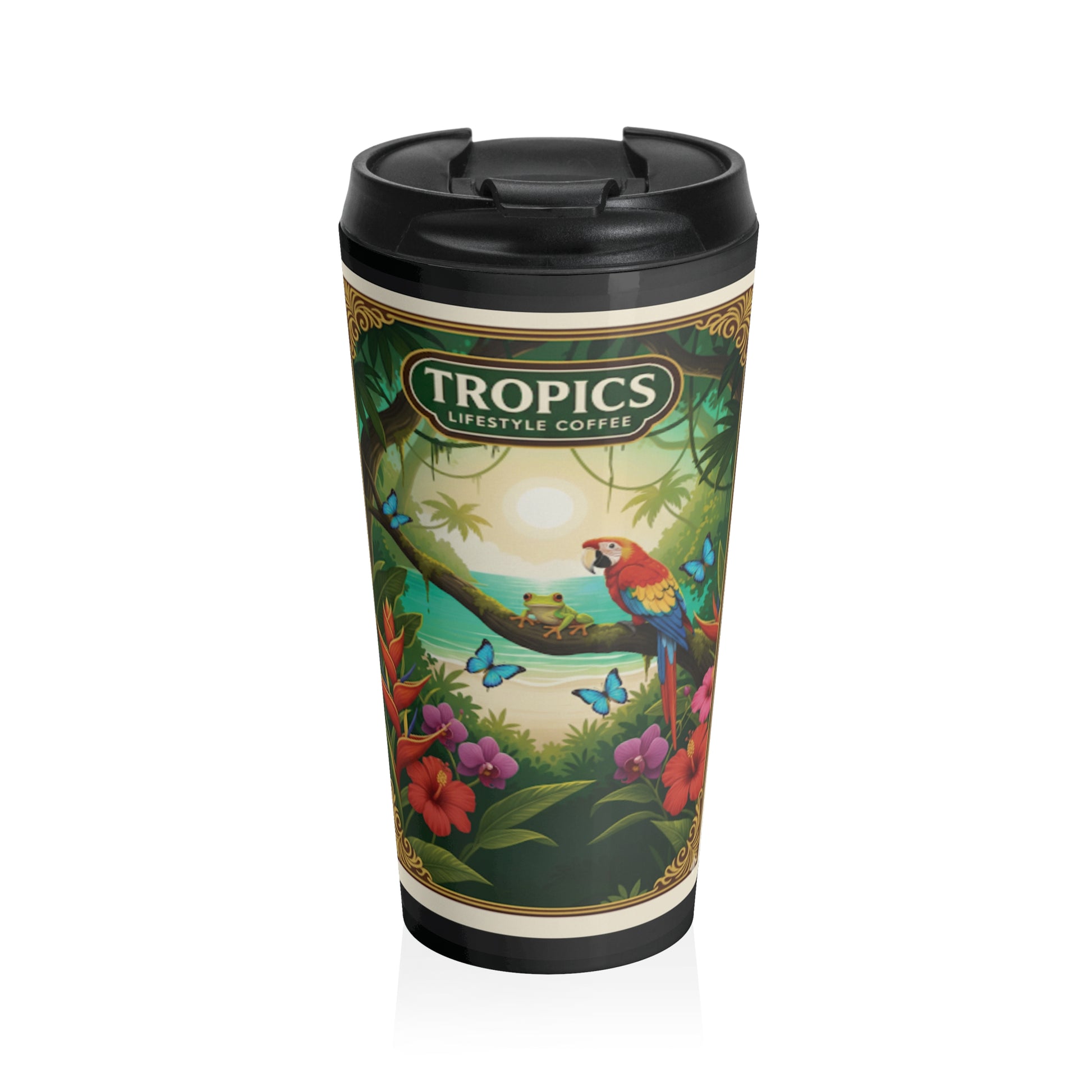 Enjoy your favorite beverages on the go with this stylish Stainless Steel Travel Mug. Crafted with design of rainforest parrot, frog and butterflies near the shore, it adds a touch of paradise to your daily routine. Whether you're commuting to work, hitting the gym, or enjoying a leisurely stroll, this travel mug fits seamlessly into any lifestyle. Perfect for coffee lovers, tea enthusiasts, or anyone who needs to stay hydrated. Elevate your daily ritual with this must-have accessory!
