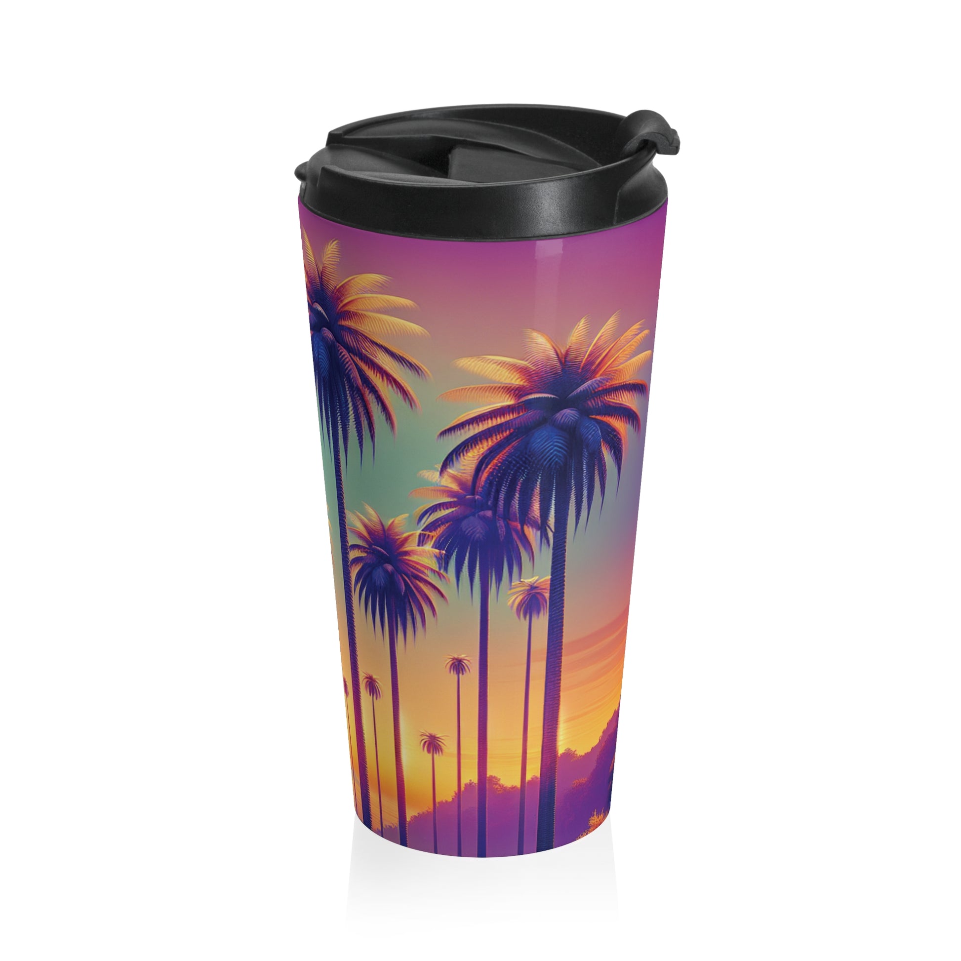 Enjoy your favorite beverages on the go with this stylish Stainless Steel Travel Mug. Crafted with design of palm trees along a boulevard at sunset, it adds a touch of paradise to your daily routine. Whether you're commuting to work, hitting the gym, or enjoying a leisurely stroll, this travel mug fits seamlessly into any lifestyle. Perfect for coffee lovers, tea enthusiasts, or anyone who needs to stay hydrated. Elevate your daily ritual with this must-have accessory!