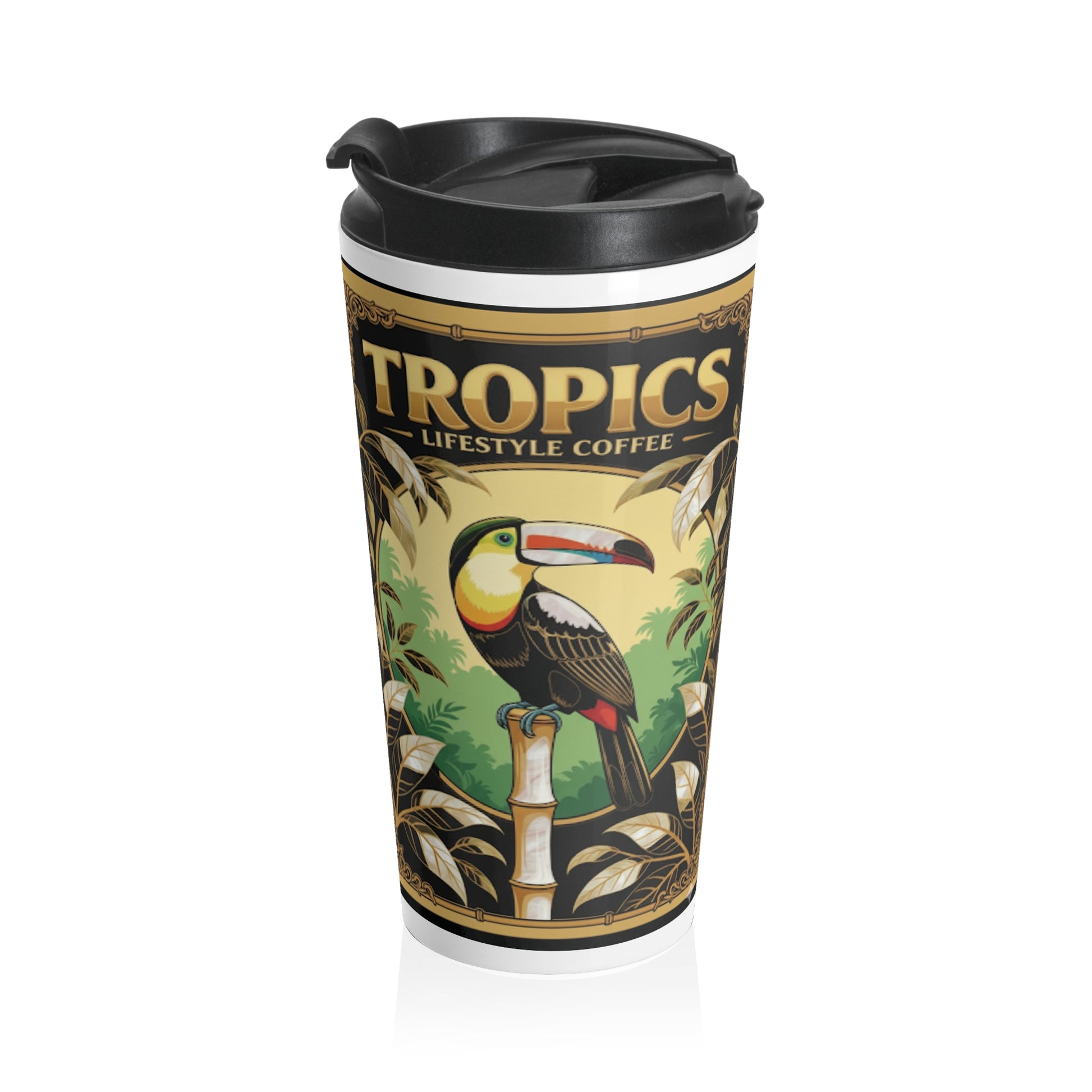Enjoy your favorite beverages on the go with this stylish Stainless Steel Travel Mug. Crafted with a vibrant tropical parrot design, it adds a touch of paradise to your daily routine. Whether you're commuting to work, hitting the gym, or enjoying a leisurely stroll, this travel mug fits seamlessly into any lifestyle. Perfect for coffee lovers, tea enthusiasts, or anyone who needs to stay hydrated. Elevate your daily ritual with this must-have accessory!