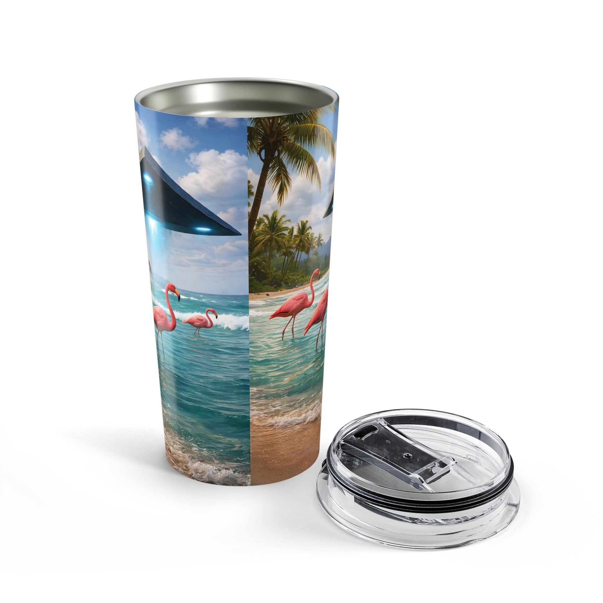 island vibes with everyday practicality. The wraparound glossy print brings a UFO, palms, turquoise surf, and a whimsical flock of flamingos into each moment—like a brief escape between errands, desk work, or a morning commute. Its vacuum-insulated body locks in temperature so your cold drinks stay crisp and your hot beverages remain comforting. The clear push-on lid with a rubber gasket keeps splashes at bay while letting the artwork shine. Lightweight and durable, it fits most cup holders and slides easily into tote bags for beach runs, road trips, or relaxed mornings on the porch.