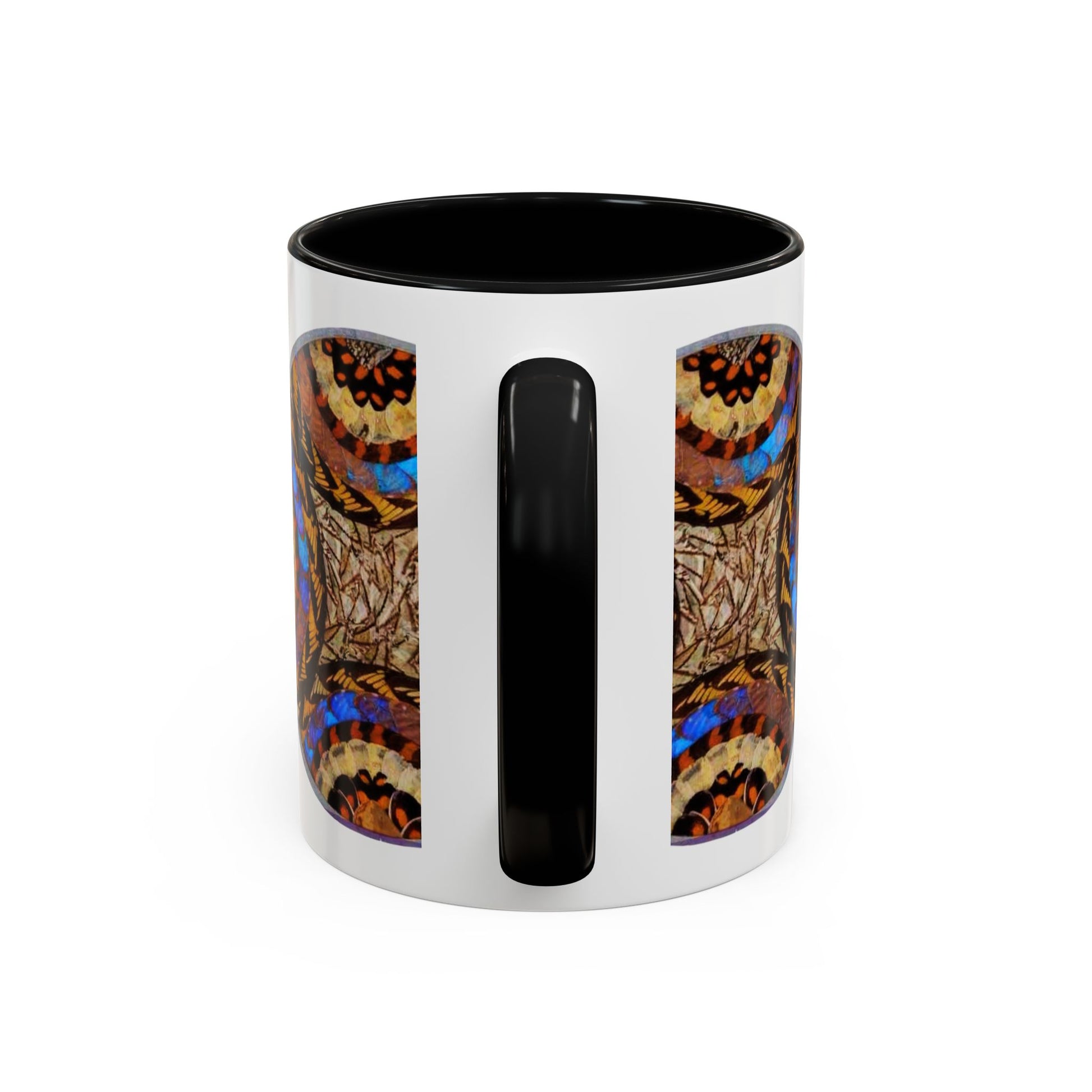 Meet your next favorite morning companion, the accented ceramic mug. Features a photo of an aluminum wall plate from 1950's Brazil showcasing patterns created with variety of real butterfly wings! This mug brings the perfect blend of style and functionality to elevate your coffee or tea ritual. Available in two generous sizes, 11oz (0.33 l) and 15oz (0.44 l), this mug offers ample space for your favorite brew. Made with white ceramic and sporting a sleek glossy finish with eye-catching contrast, this mug is a bliss both to use and to look at. The ergonomic C-shaped handle provides a comfortable grip, while the lead and BPA-free construction guarantee peace of mind with every sip.