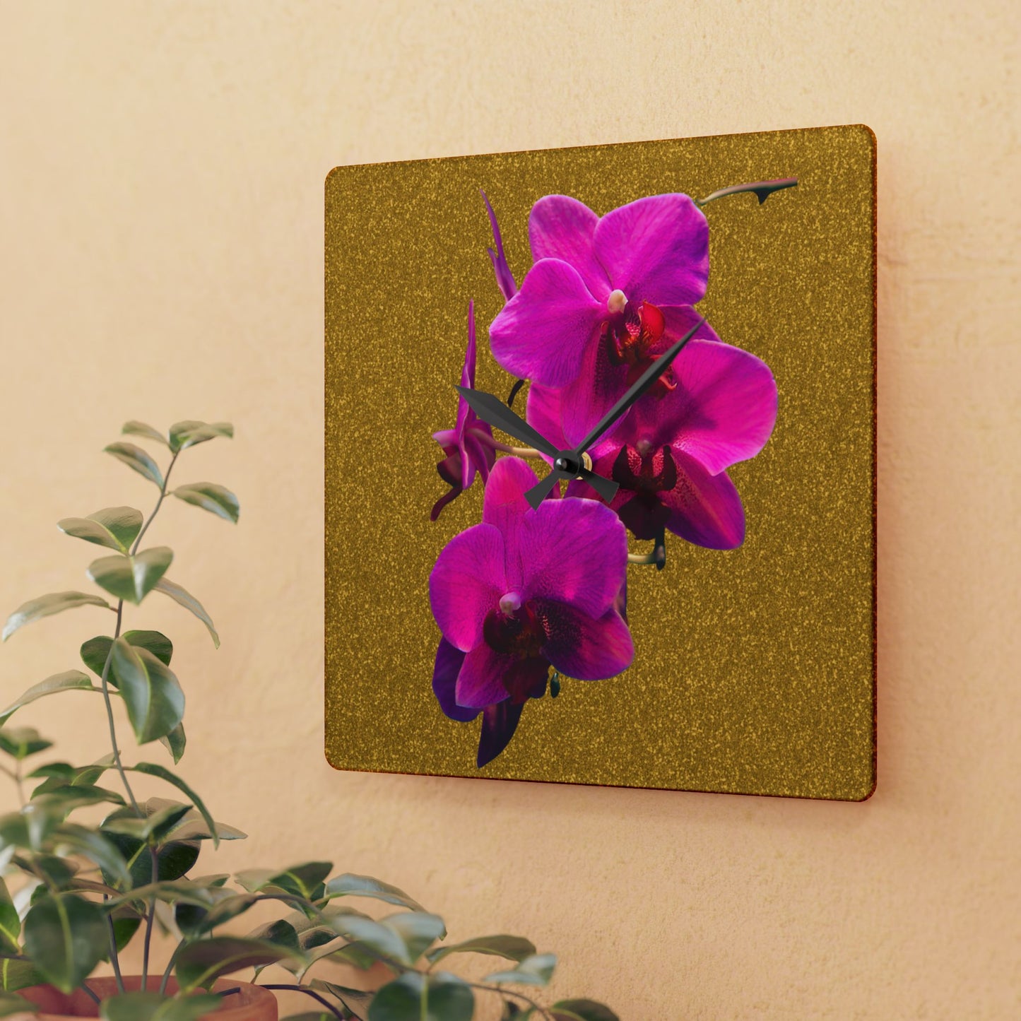 These clocks come in two shapes (round and square) and two sizes. Each clock has a keyhole at the back for easy hanging on a wall. They're made from an acrylic material that looks like glass but is more durable and sturdy. Design is our exclusive Purple Orchids/Gold, made with photo of real tropical flowers.