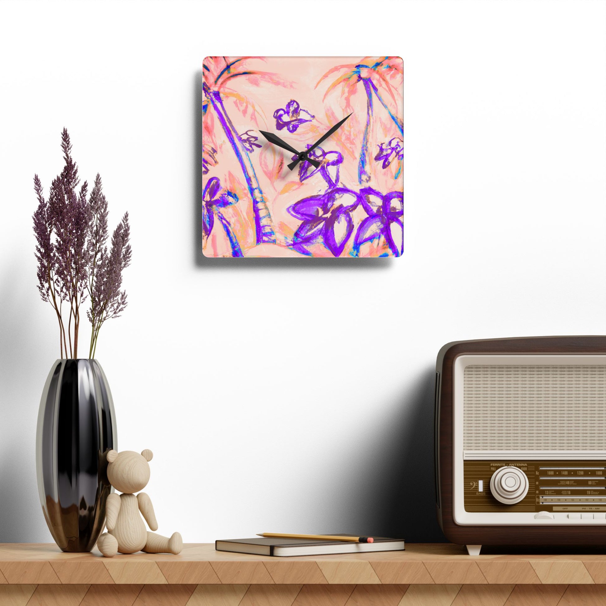 Add tropical personality to your surroundings with our Acrylic Wall Clock, featuring the tropical and simple design of palm trees and flowers on a beach. Each clock has a keyhole at the back for easy hanging on a wall. Clock are made from an acrylic material that looks like glass but is more durable and sturdy.