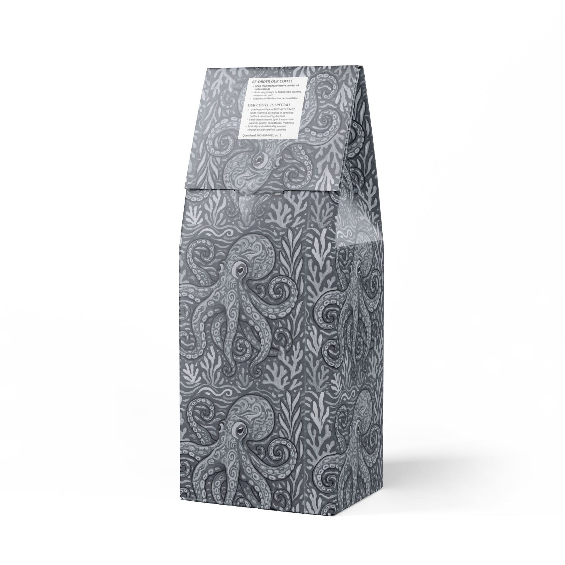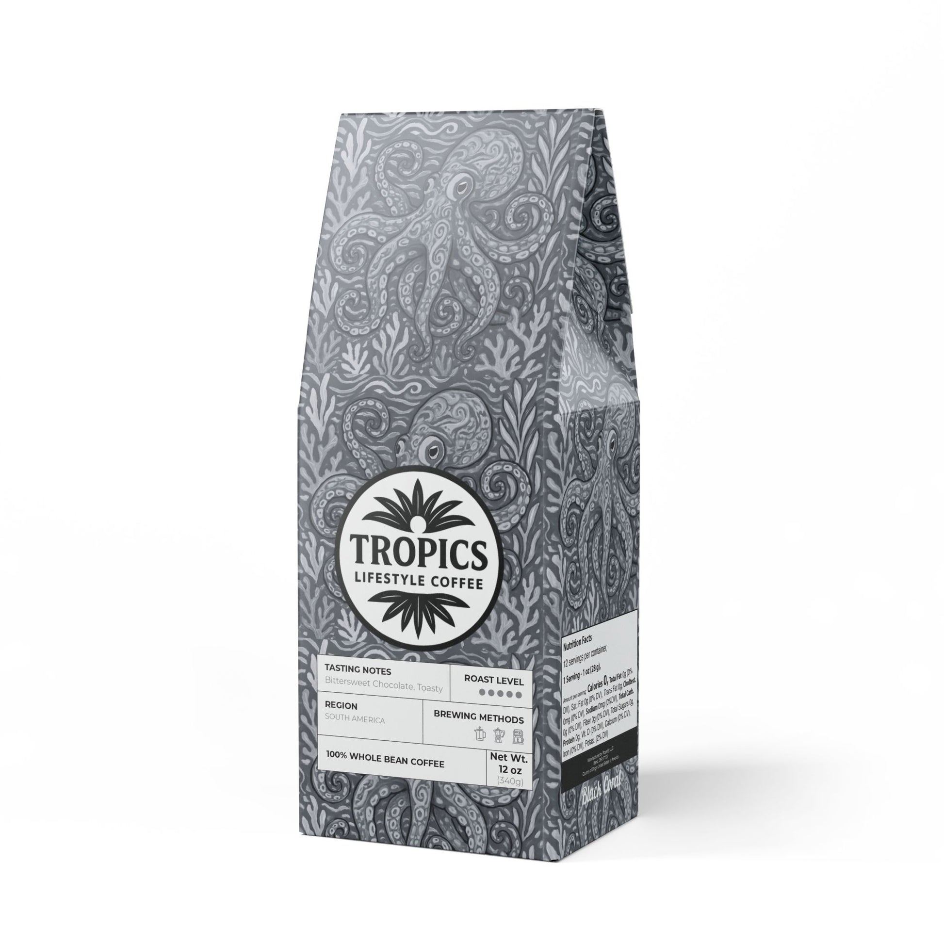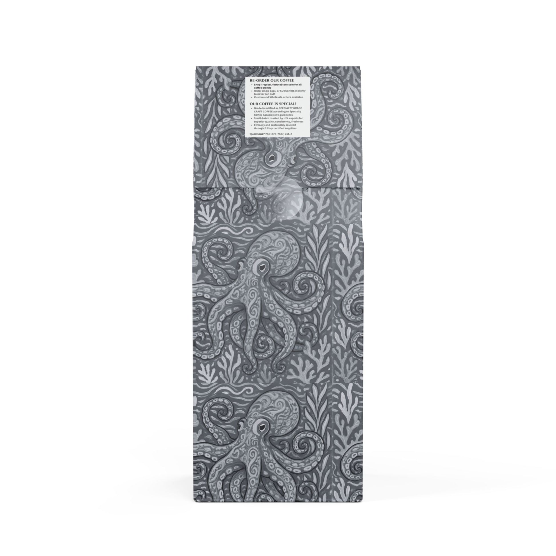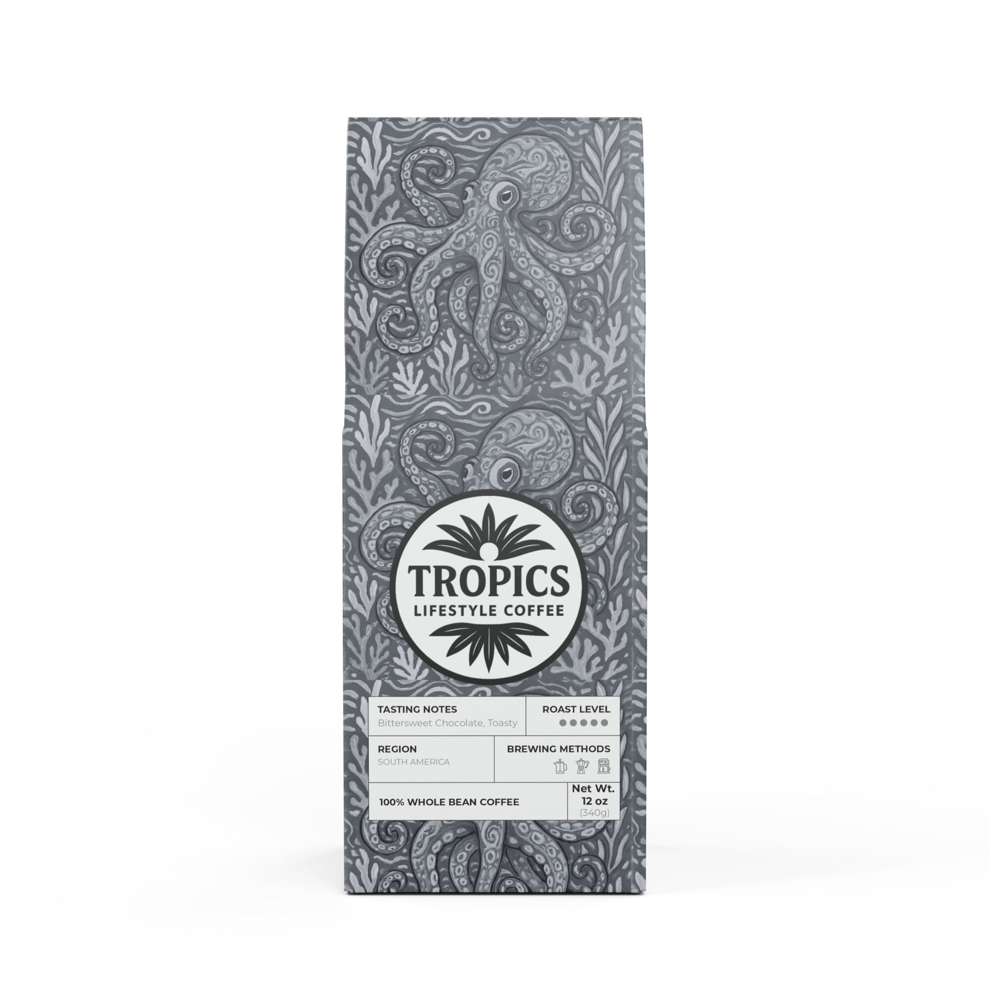 If you love coffee with a strong personality and deep flavors then the Black Coral Blend™ is made for you. This 12oz package features a Dark French roast, delivering a bittersweet and toasty flavor profile with a strong finish along with rich flavors of cocoa and toasted nuts. Sourced from South America, this blend is meant to be enjoyed by brewing in your drip coffee maker, French press, or percolator. Available in whole bean and ground options. Roasted with care in the USA from ingredients sourced worldwide and certified as "Specialty Grade Craft Coffee." Limited-edition bag art features our original octopus Kraken Joe design. Don't run out! Join our monthly Subscription coffee plan.