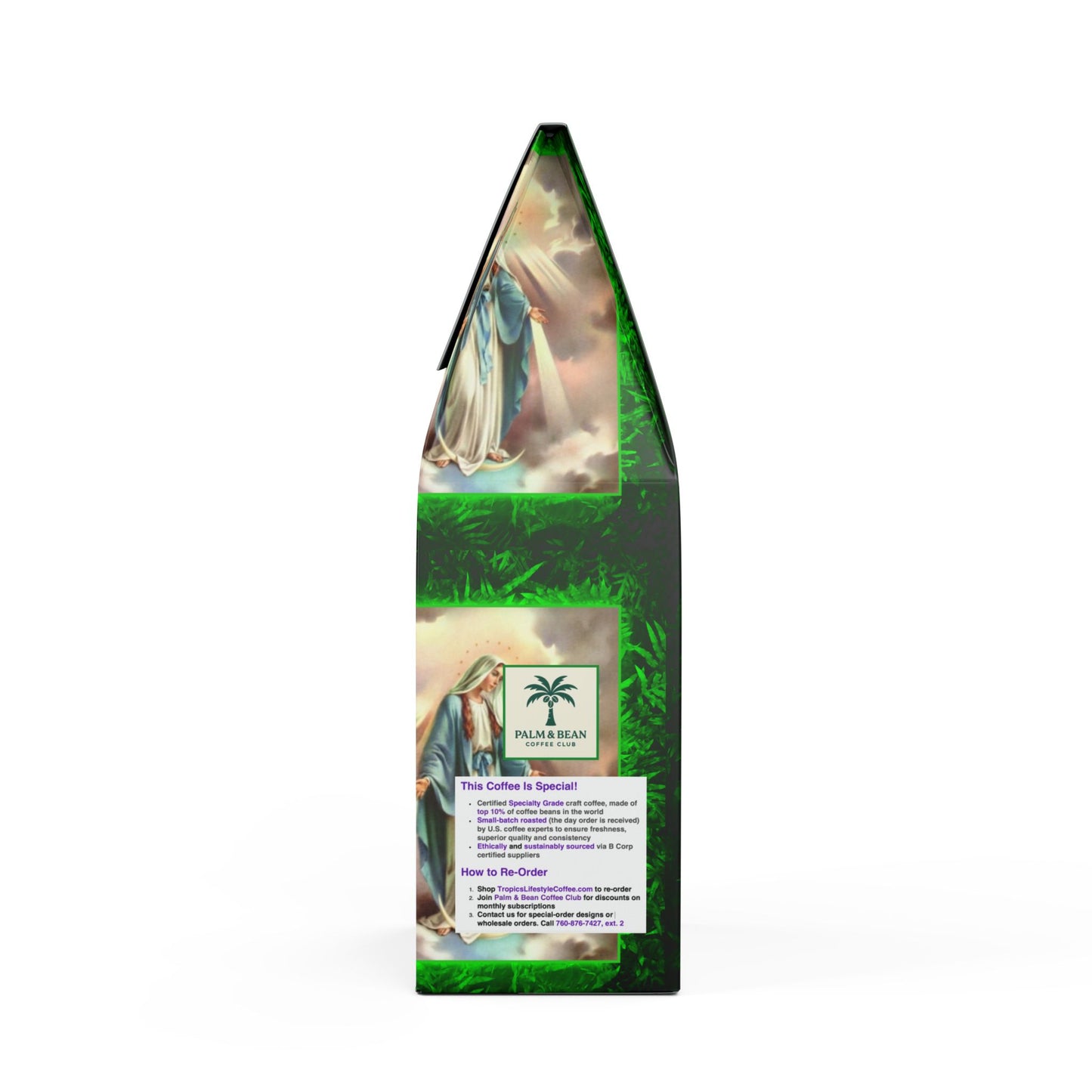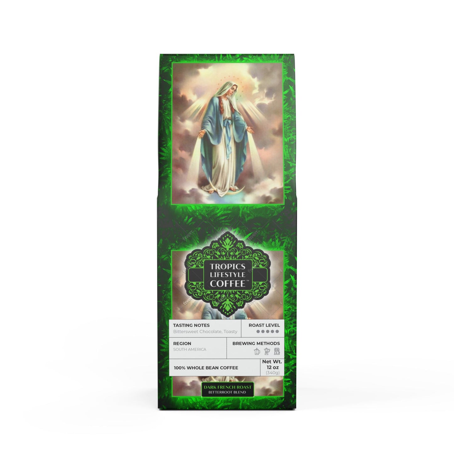 If you love coffee with a strong personality and deep flavors then the Bitterroot Coffee Blend is made for you. This 12oz package features a Dark French roast, delivering a bittersweet and toasty flavor profile with a strong finish along with rich flavors of cocoa and toasted nuts. Sourced from South America, this blend is meant to be enjoyed by brewing in your drip coffee maker, French press, or percolator. Available in whole bean and ground options. Roasted with care in the USA from ingredients sourced worldwide and certified as "Specialty Grade Craft Coffee." Limted-edition bag art features a tropical design of Our Lady of Grace ("Miraculous Medal"). Don't run out! Join our monthly Subscription coffee plan; get 10% off.