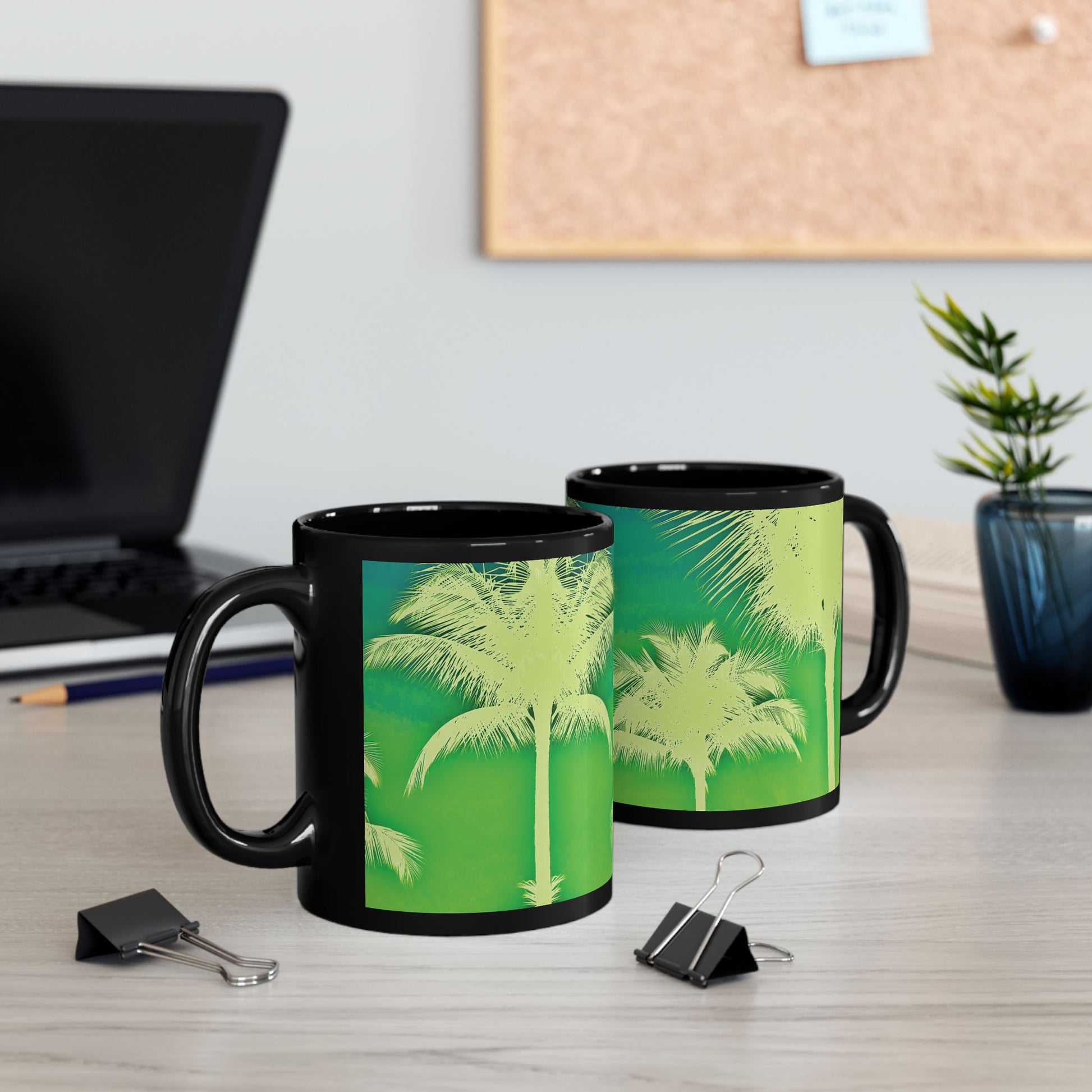 Enjoy our exclusive design of palm trees with a brilliant background of green glow colors. Sparks joy whenever you drink your coffee or tea any time of the day.