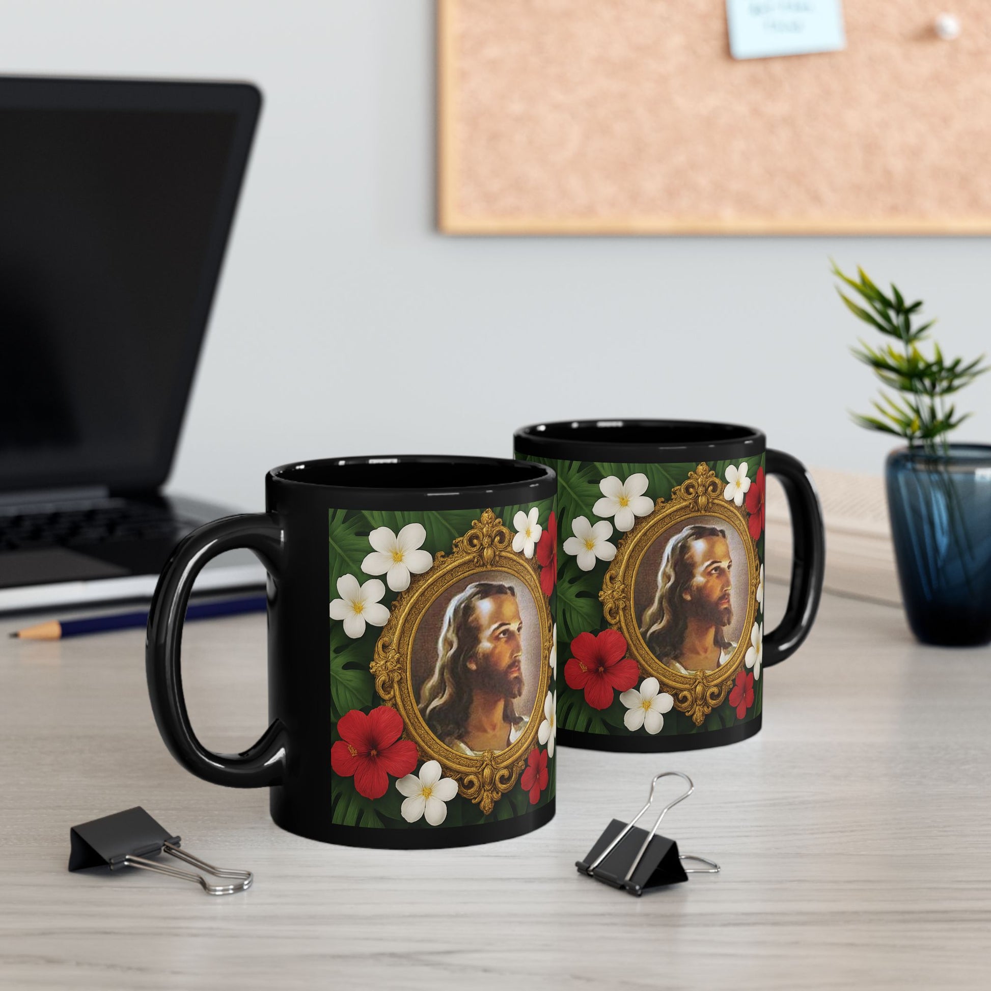Enjoy our exclusive design of the famous "Head of Christ" artwork surrounded by tropical flowers. This mug certainly makes every sip of your beverage more fun and relaxing.