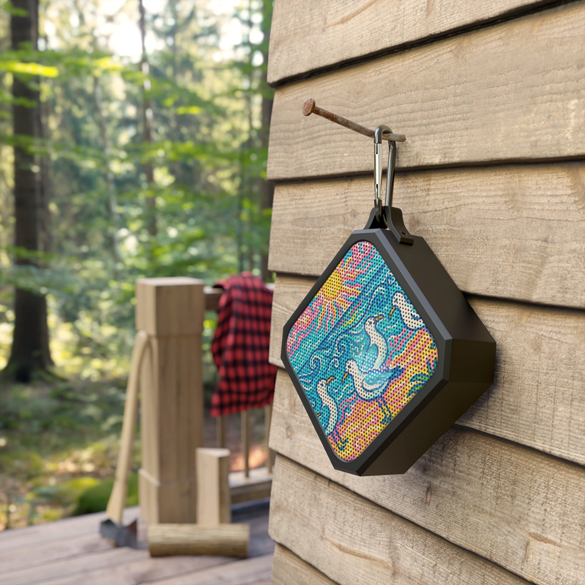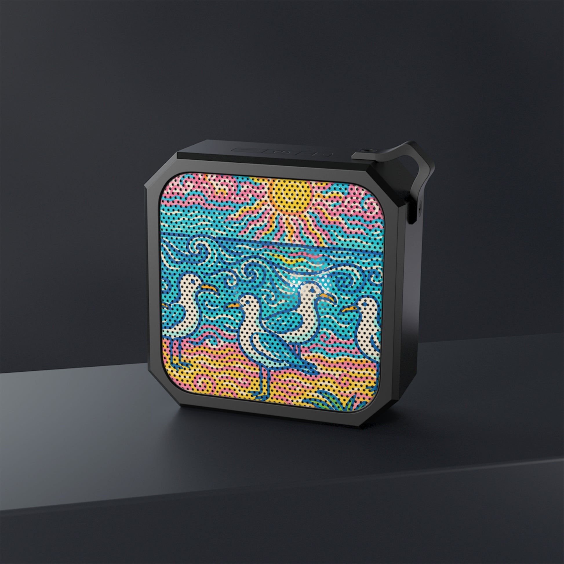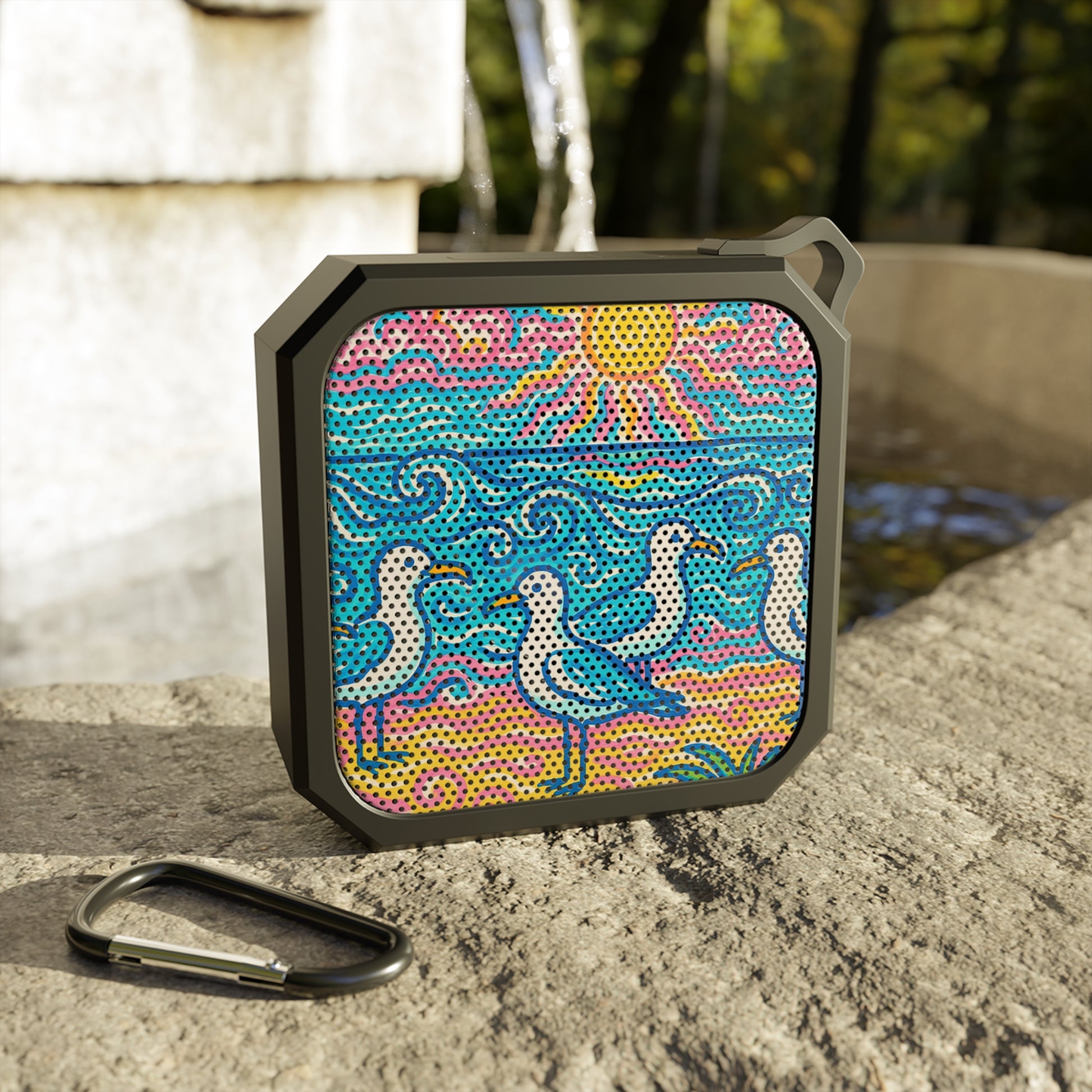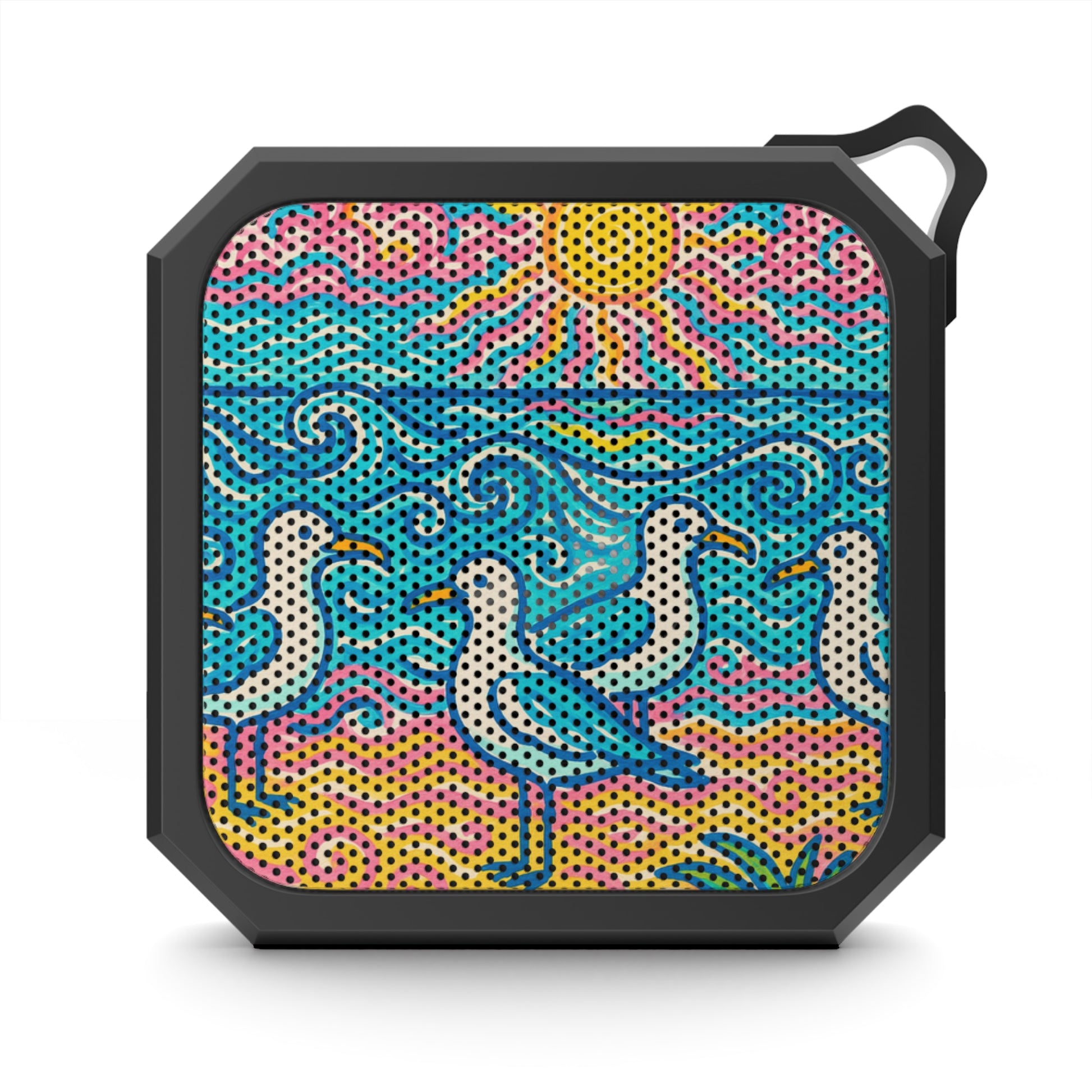 Add your soundtrack to any adventure with the Blackwater Bluetooth outdoor speakers. This IPX6-certified waterproof speaker takes any hiking trip head-on. Its compact size, along with the included carabiner clip & micro USB charging cable, make it the ideal companion for listening to your favorite tunes while exploring. Bluetooth working range - 33 ft, 2 hours of music at max volume. Features our exclusive Beach Seagulls design giving off strong tropical vibes with an image of a flock of cut seagulls. Quite a functional conversation piece!