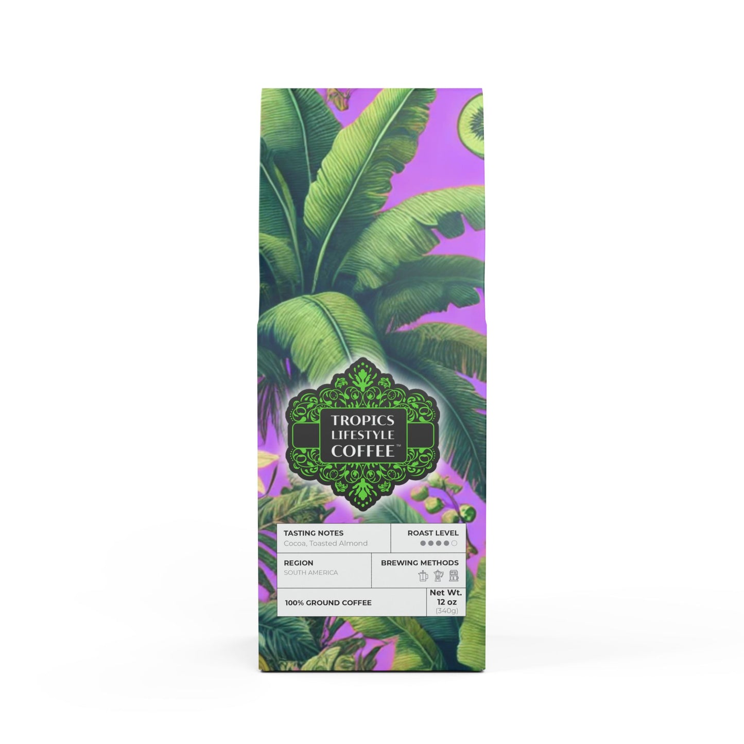 The Midnight Surf Blend™ delivers a rich and robust delight for your mornings. Packed in a 12 oz bag, this medium-dark roast boasts flavors of cocoa and toasted nut, offering a full-bodied experience with each sip. Certified as a top-tier "Specialty Grade Craft Coffee." Sourced from South America, this blend is the perfect choice for brewing it in your drip coffee maker, moka pot, or percolator. And with both whole bean and ground options available, you're in control of your coffee experience. Roasted with care in the USA. Limited-edition bag art features our original More Tropical Fruit design, evoking feelings of a tropical destination to explore with palms, fruit and rainforest greenery. Don't run out! Join our monthly Subscription coffee plan.