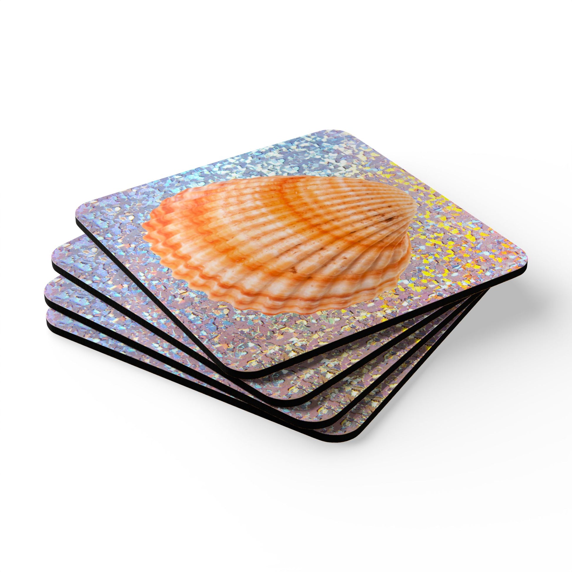 Upgrade your home’s décor with this personalized coaster set of four pieces featuring a super coastal vibe. Perfect for parties with 1 to 100 in attendance, this 4-piece set includes high-gloss MDF tops and cork backs to prevent sliding. Our exclusive Disco Orange Scallop design adds a fun and vibrant touch to your space, making it a must-have for anyone who loves hosting gatherings or tropical-themed decor. Ideal for holidays, parties, and everyday use.