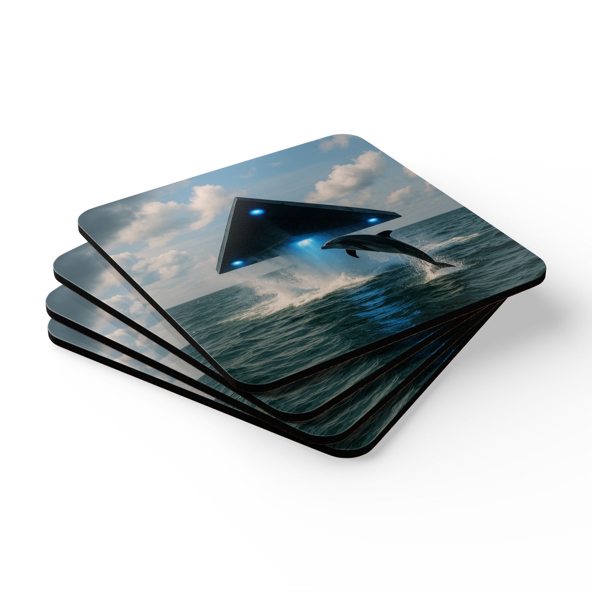 Upgrade your home’s décor with this personalized coaster set featuring a super mysterious tropical vibe. UFO and Dolphin friends? Perfect for parties with 1 to 100 in attendance, this 4-piece set includes high-gloss MDF tops and cork backs to prevent sliding.