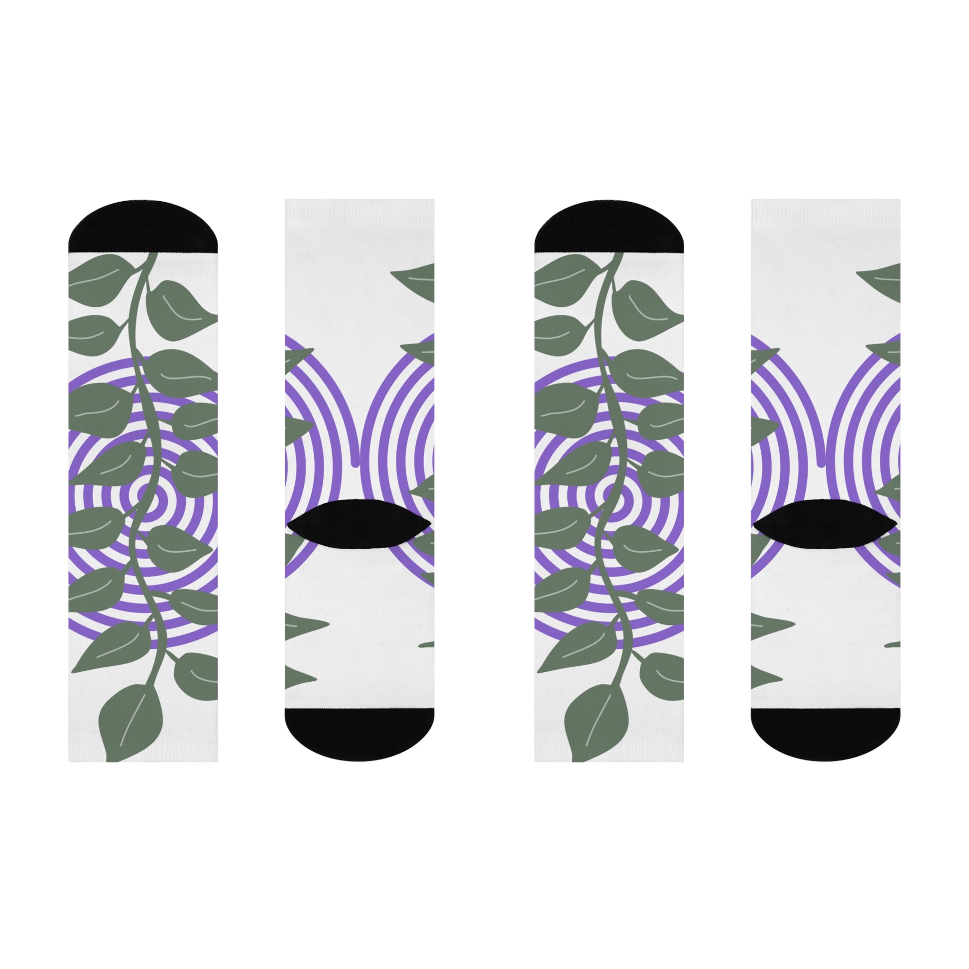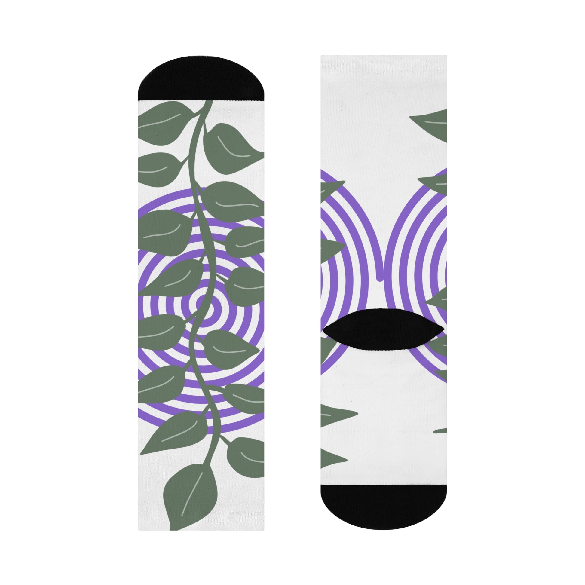 Enjoy our exclusive socks featuring our Crazy Plants stylized design. They're botanical fashion statements! Our cushioned DTG crew socks are a one-size style designed with both function and appearance in mind. With the fully cushioned heel-to-toe, these socks provide superior comfort, while the DTG print process allows for ultra-crisp, crease-free printing. Composed of 73% polyester, 18% nylon, 6% spandex, and 3% cotton, these socks are an elevated alternative to the typical sublimation sock and provide a clean, comfortable base for your all-over print designs.