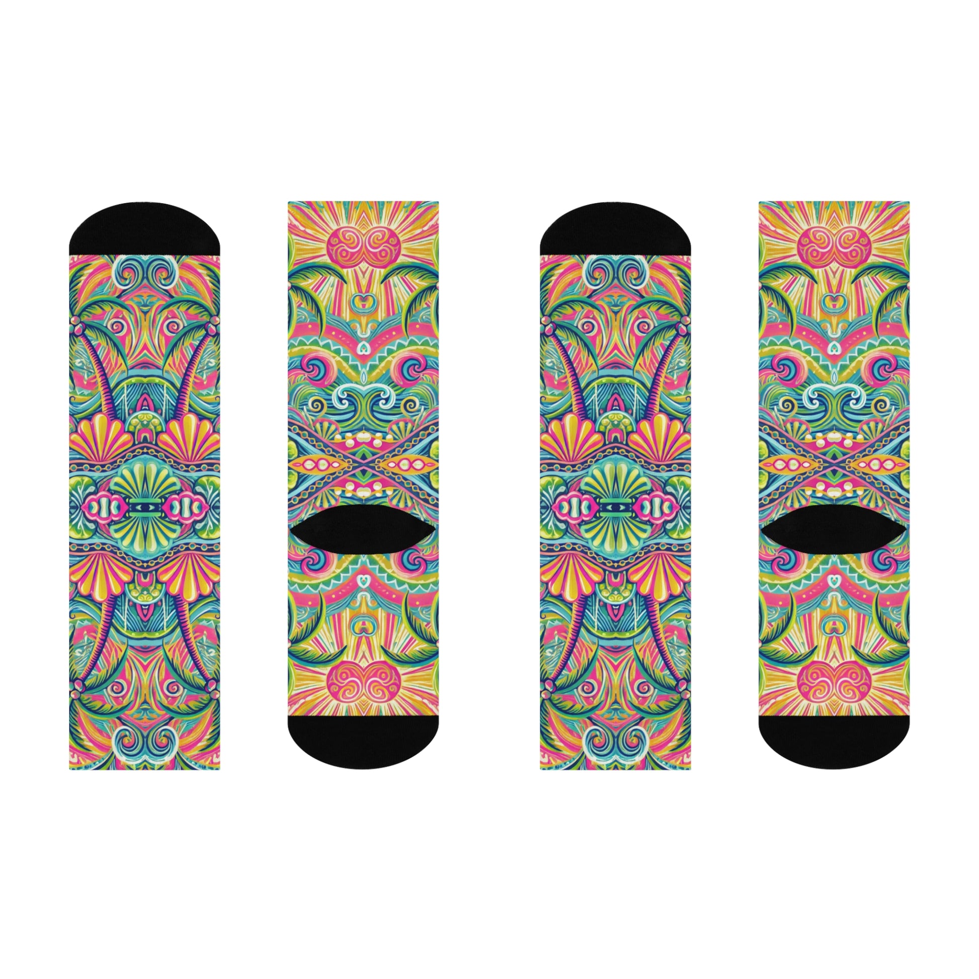 Enjoy our exclusive socks featuring a tropical kaleidoscope design. They're fashion statements taking you on a virtual vacation every day! Our cushioned DTG crew socks are a one-size style designed with both function and appearance in mind. With the fully cushioned heel-to-toe, these socks provide superior comfort, while the DTG print process allows for ultra-crisp, crease-free printing. Composed of 73% polyester, 18% nylon, 6% spandex, and 3% cotton, these socks are an elevated alternative to the typical sublimation sock and provide a clean, comfortable base for your all-over print designs.