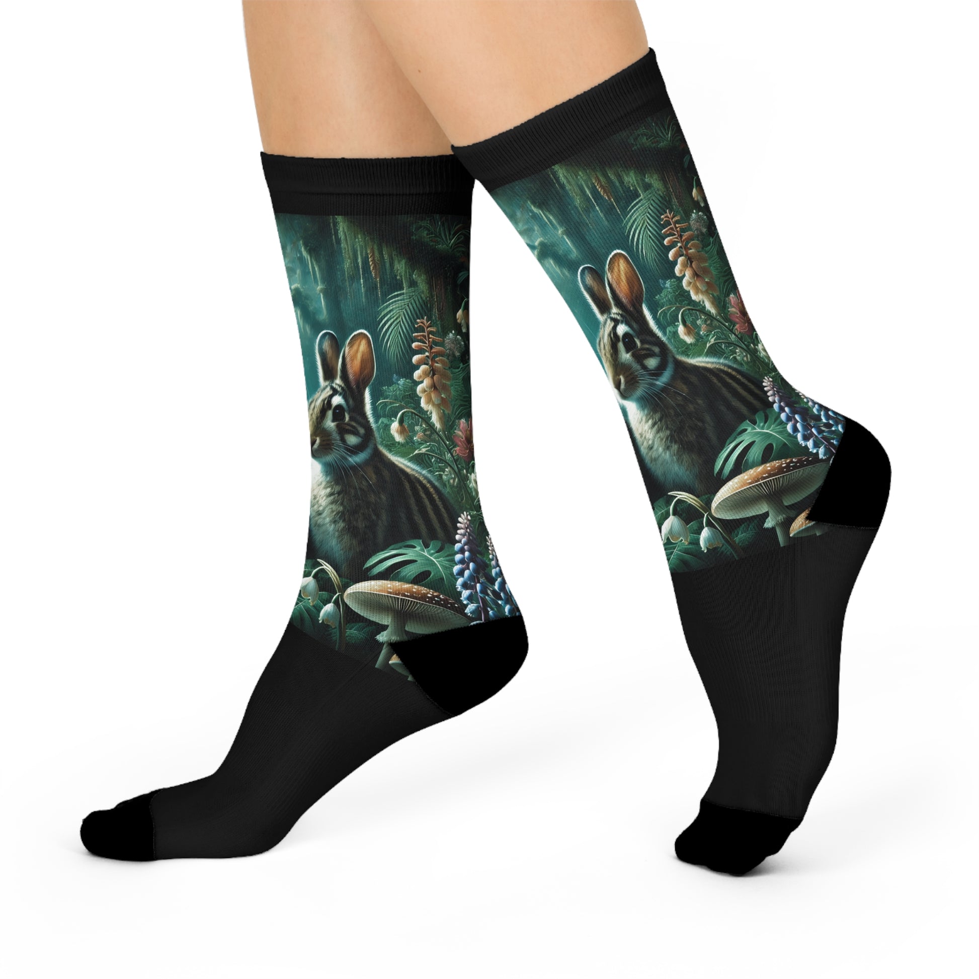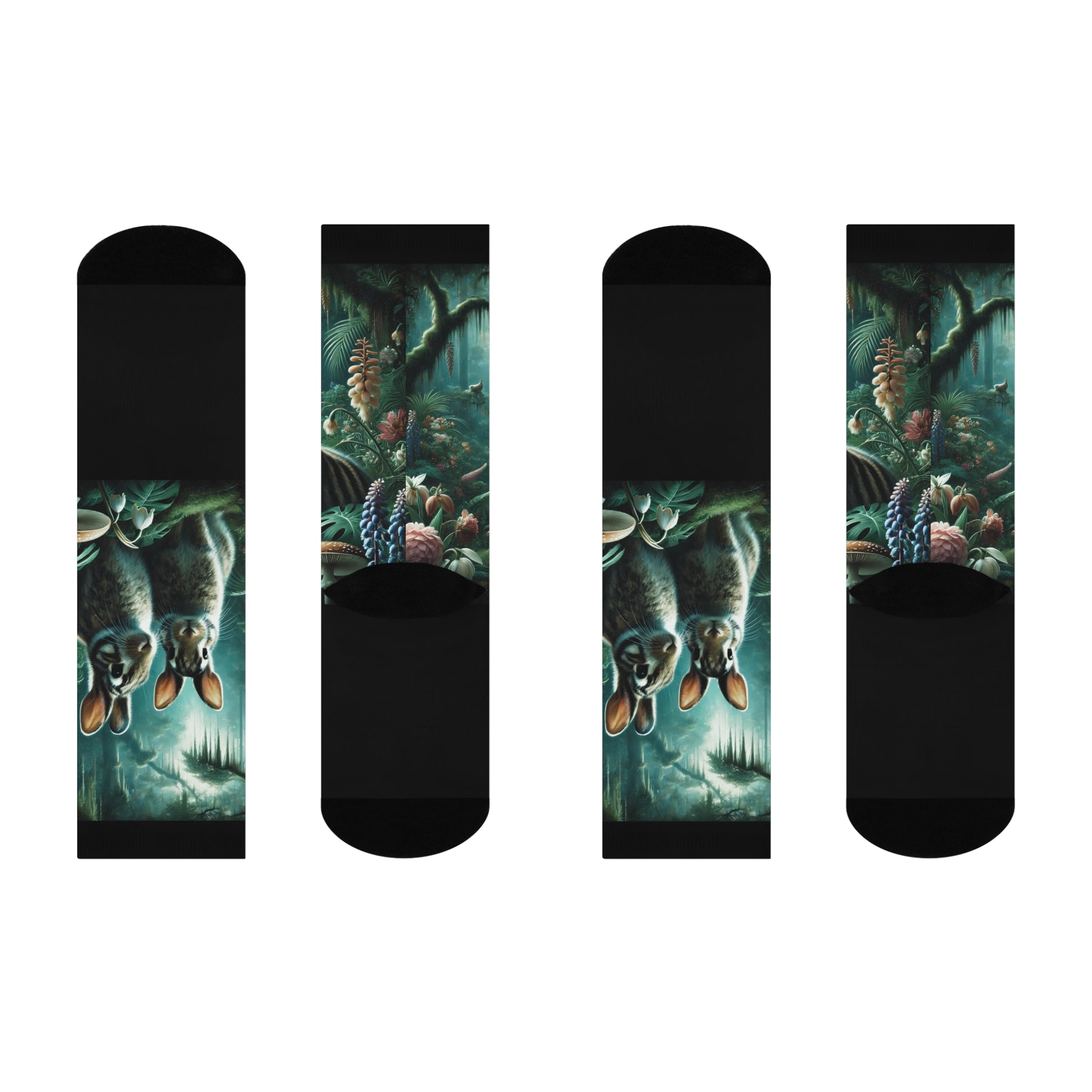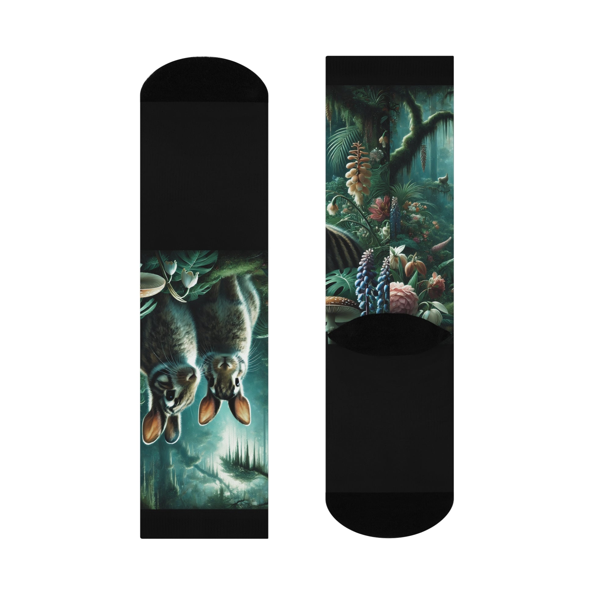 Enjoy our exclusive socks featuring design showcasing the only bunnies on Earth who live in a rainforest, the Sumatran rabbits. They're fashion statements taking you on a virtual vacation every day! Our cushioned DTG crew socks are a one-size style designed with both function and appearance in mind. With the fully cushioned heel-to-toe, these socks provide superior comfort, while the DTG print process allows for ultra-crisp, crease-free printing. Composed of 73% polyester, 18% nylon, 6% spandex, and 3% cotton, these socks are an elevated alternative to the typical sublimation sock and provide a clean, comfortable base for your all-over print designs.