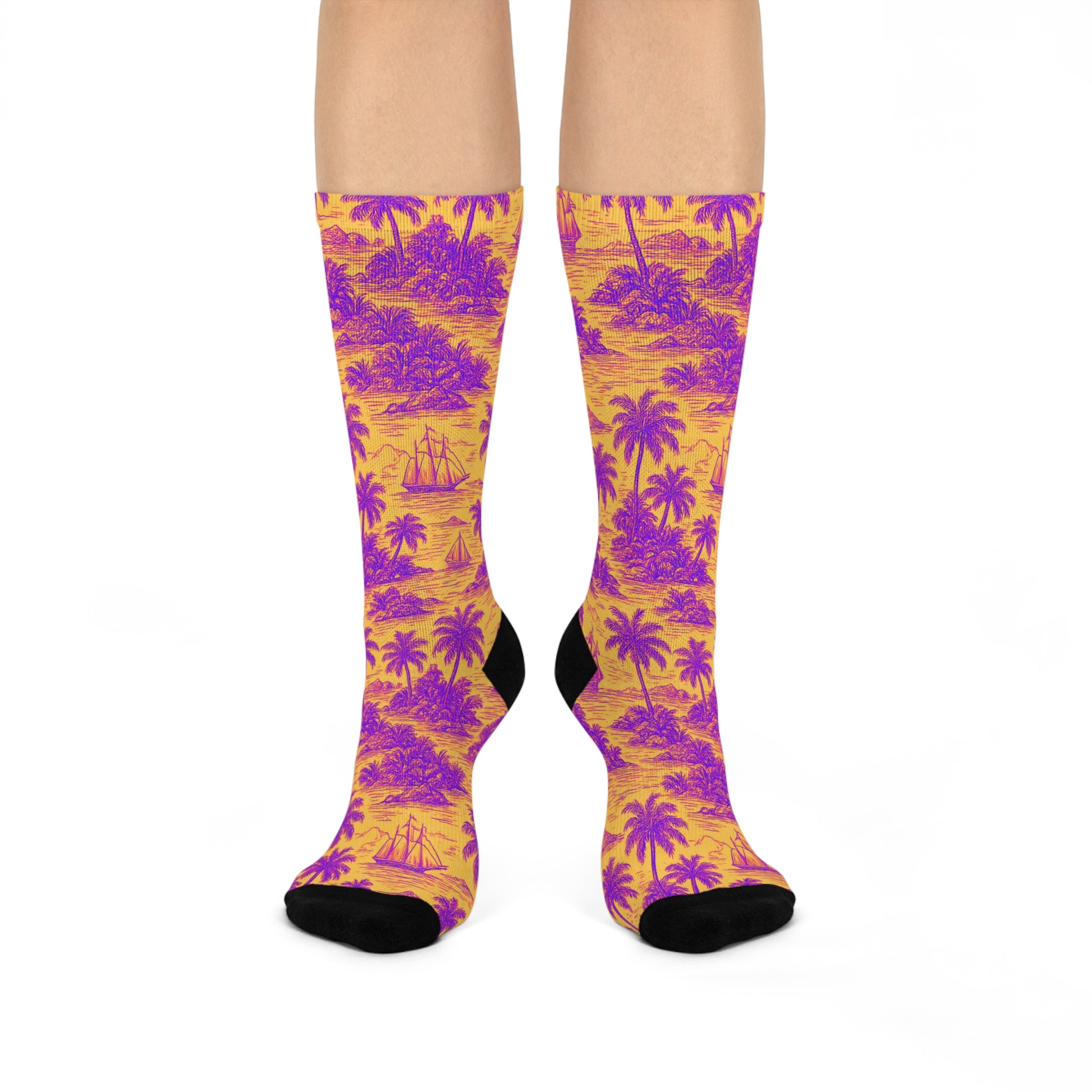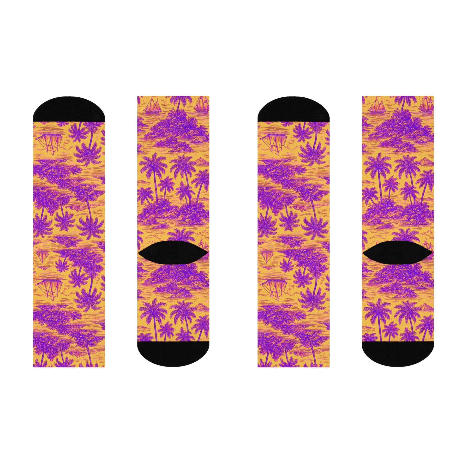 Enjoy unique socks featuring exclusive Faraway Toile original art with coastal motifs taking you on a virtual vacation every day. Our cushioned DTG crew socks are a one-size style designed with both function and appearance in mind. With the fully cushioned heel-to-toe, these socks provide superior comfort, while the DTG print process allows for ultra-crisp, crease-free printing. Composed of 73% polyester, 18% nylon, 6% spandex, and 3% cotton, these socks are an elevated alternative to the typical sublimation sock and provide a clean, comfortable base for your all-over print designs.