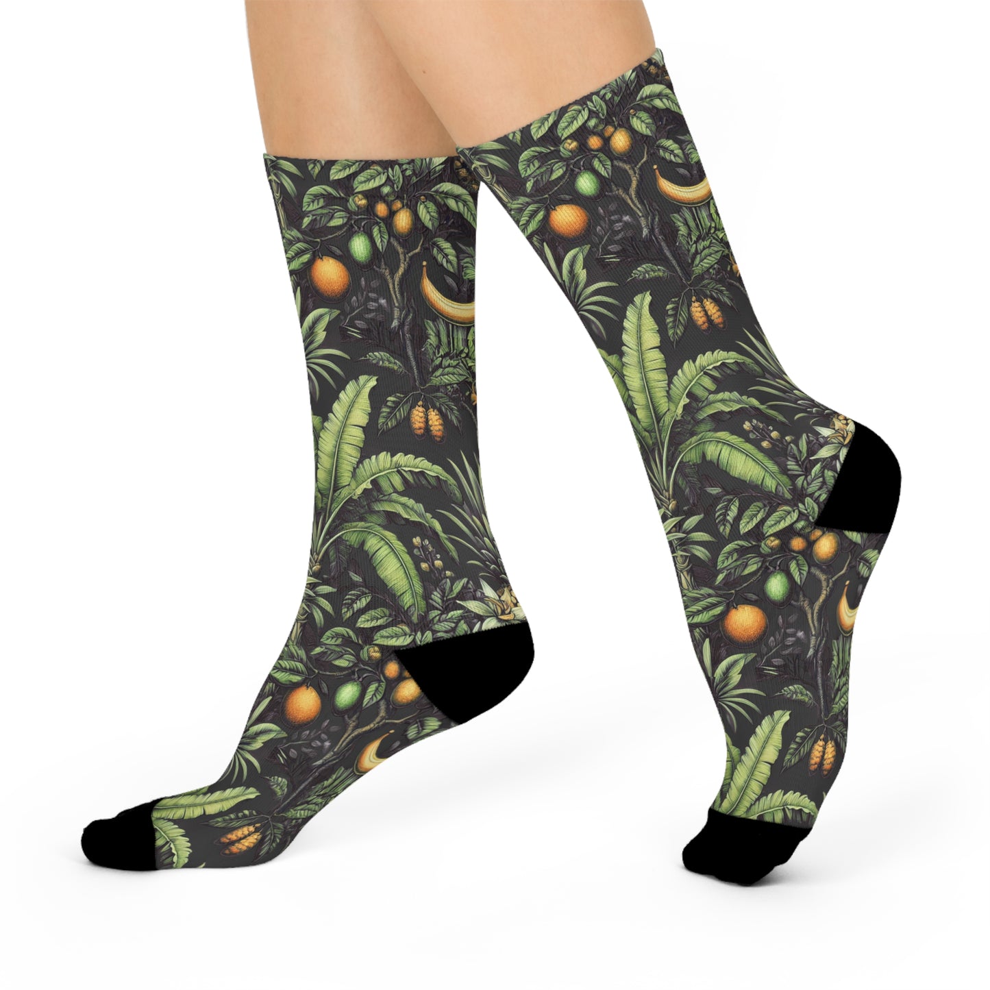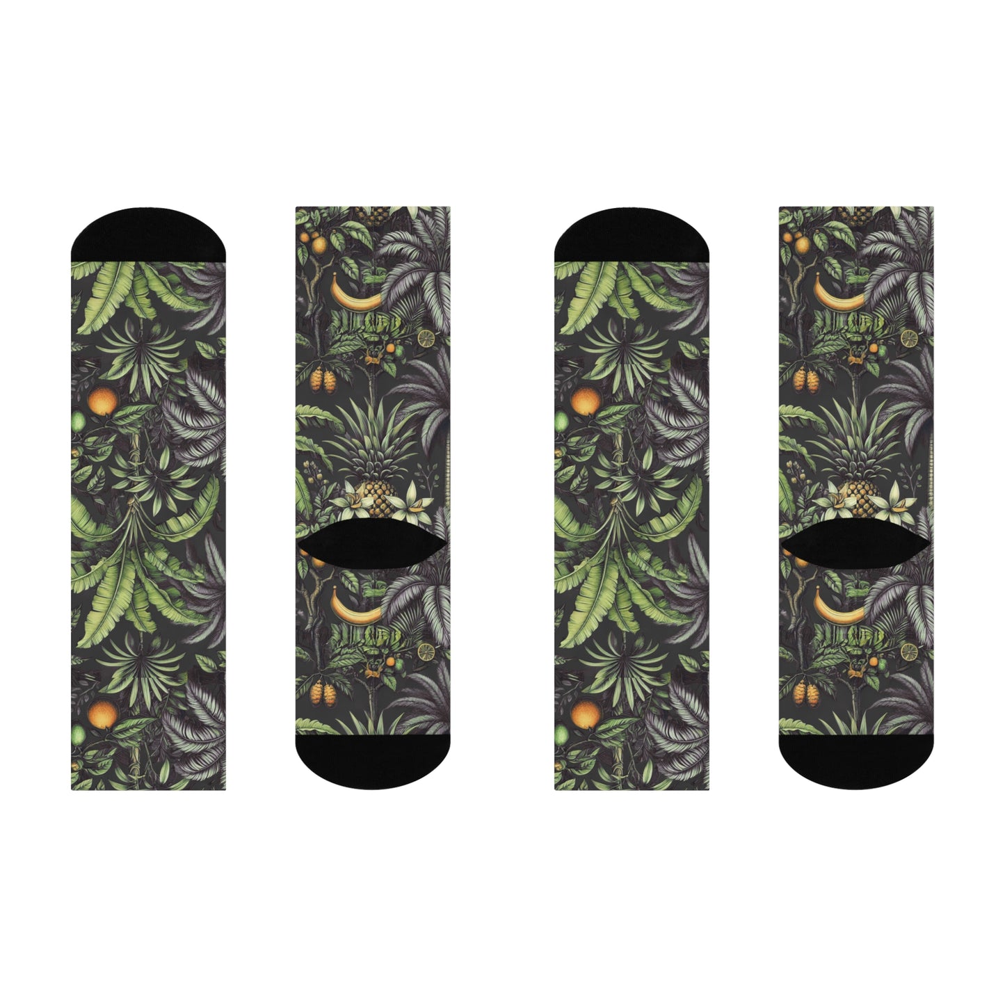 Enjoy unique socks featuring exclusive design of lush palms and fruit taking you on a virtual vacation every day. Our cushioned DTG crew socks are a one-size style designed with both function and appearance in mind. With the fully cushioned heel-to-toe, these socks provide superior comfort, while the DTG print process allows for ultra-crisp, crease-free printing. Composed of 73% polyester, 18% nylon, 6% spandex, and 3% cotton, these socks are an elevated alternative to the typical sublimation sock and provide a clean, comfortable base for your all-over print designs.