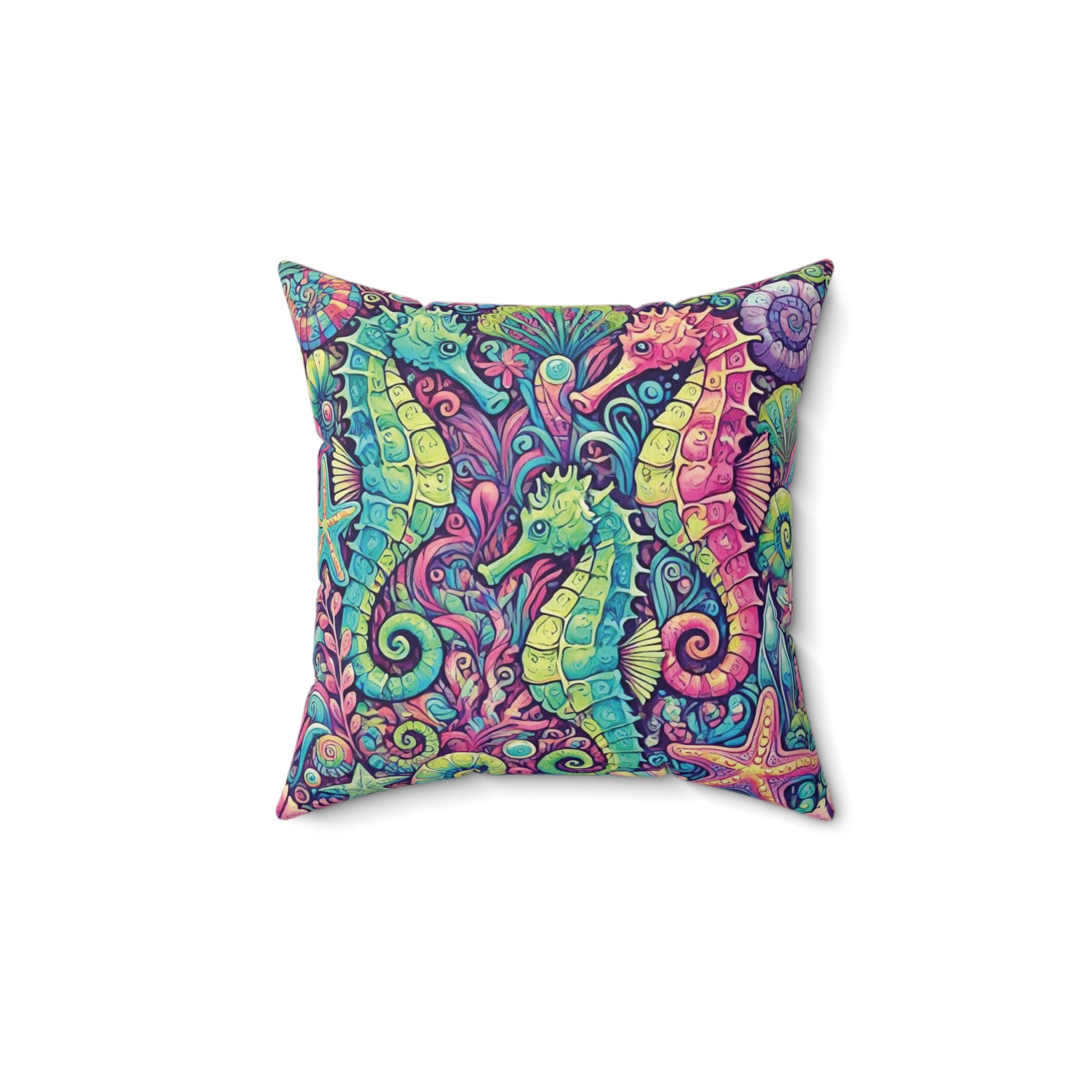 Introducing our stylish and vibrant square pillow, perfect for adding a pop of color and elegance to any space! Featuring a stunning scene of three gorgeous seahorses, this pillow creates a serene and luxurious atmosphere. Ideal for both modern and bohemian decor, it seamlessly fits into your living room, bedroom, or even a cozy reading nook. Great for lounging, entertaining guests, or simply sprucing up your home for the holidays, this pillow is a thoughtful gift for housewarmings, birthdays, or special occasions. Perfect for anyone who appreciates artful decor and wants to infuse their space with personality!