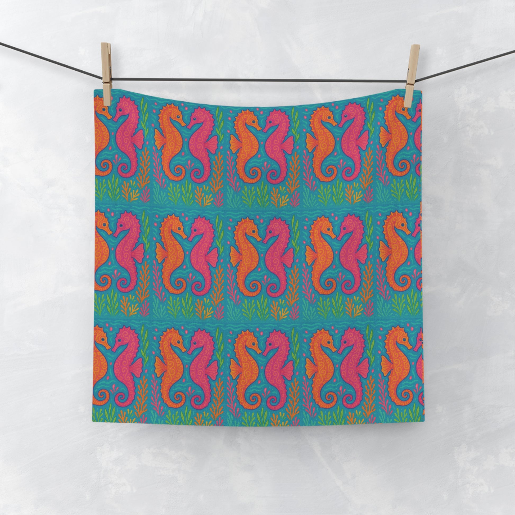 This is a highly versatile bathroom staple that's packed with character. The front face is made with a polyester blend while the back is 100% soft, absorbent cotton. Perfect for using as a hand towel, a face towel, or a makeup wash cloth. Features colorful Sunset Seahorses. It is found hopping around in the Barisan Mountains in Indonesia and surrounding areas.