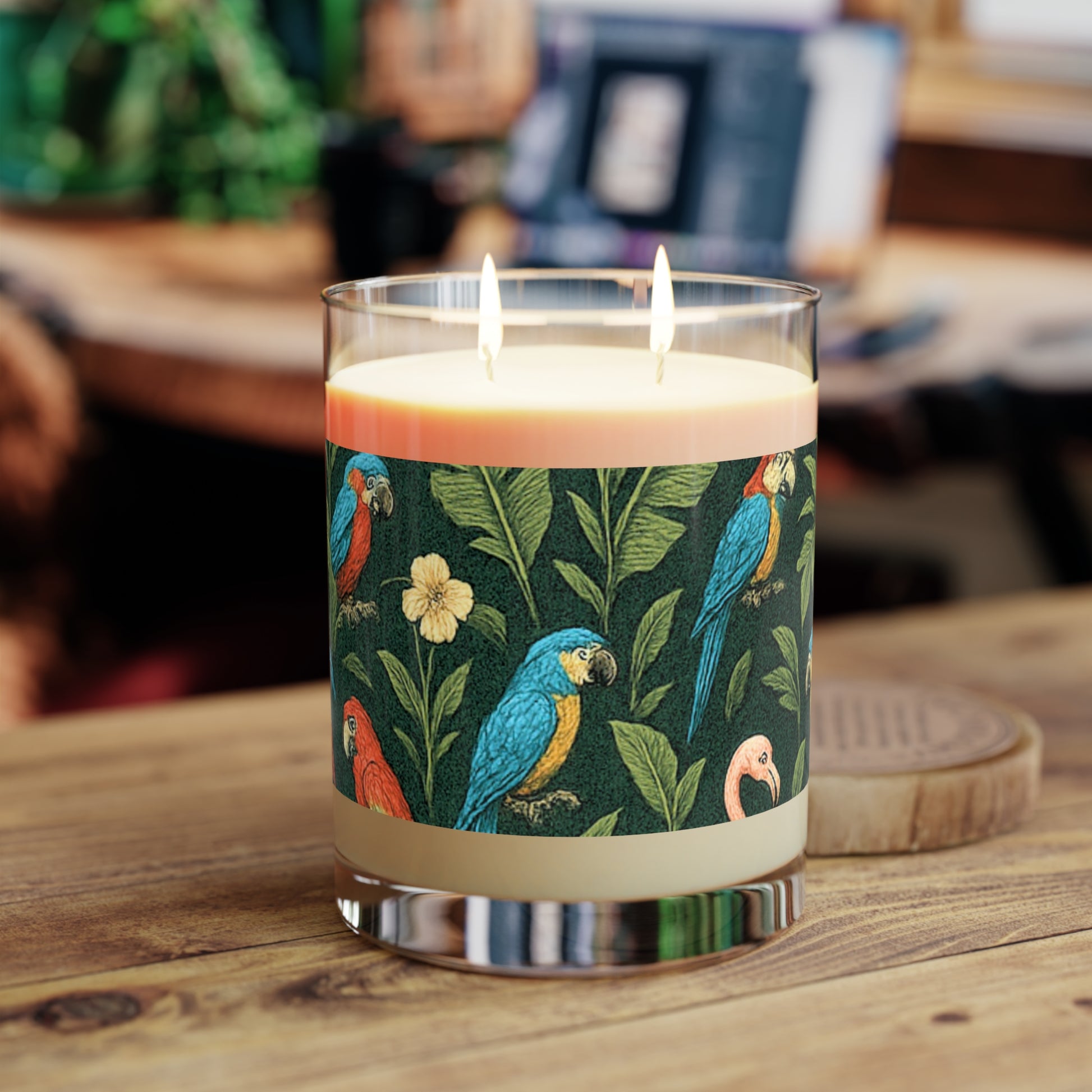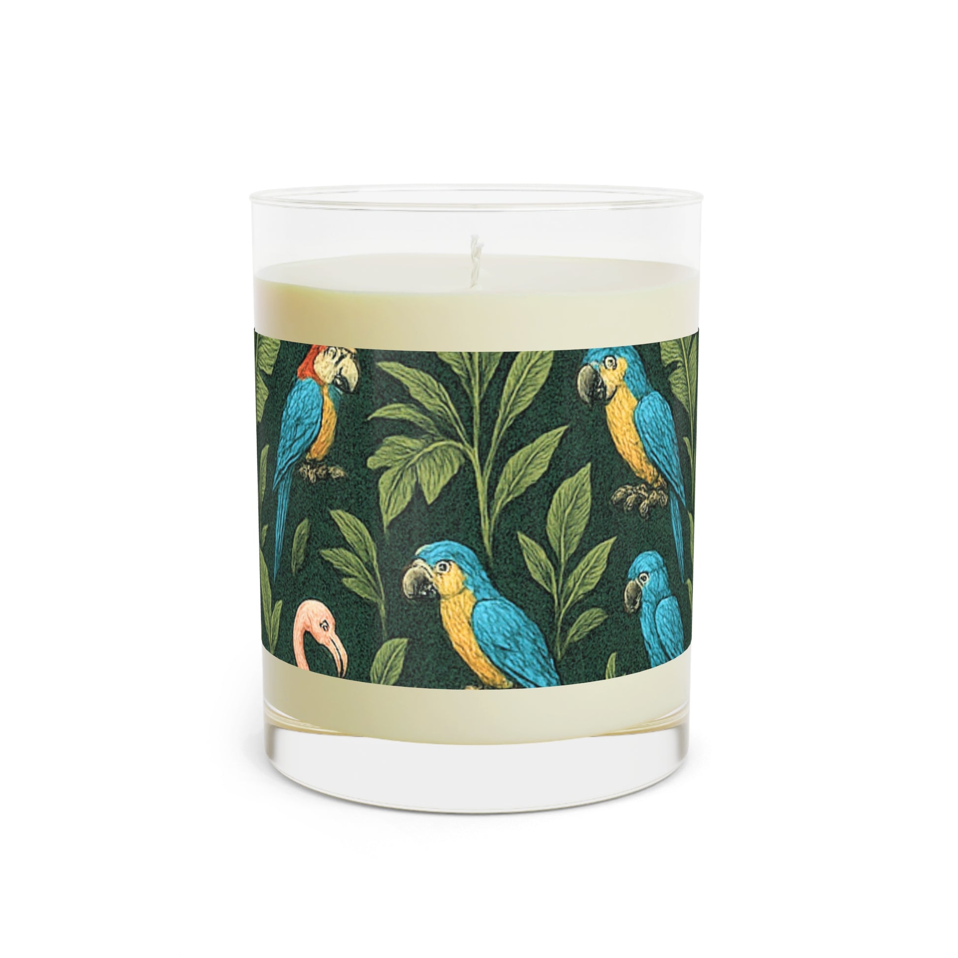 Elevate your candle game with our very special Flamingos Parrots design taking you on a virtual tropical vacation in a rainforest.