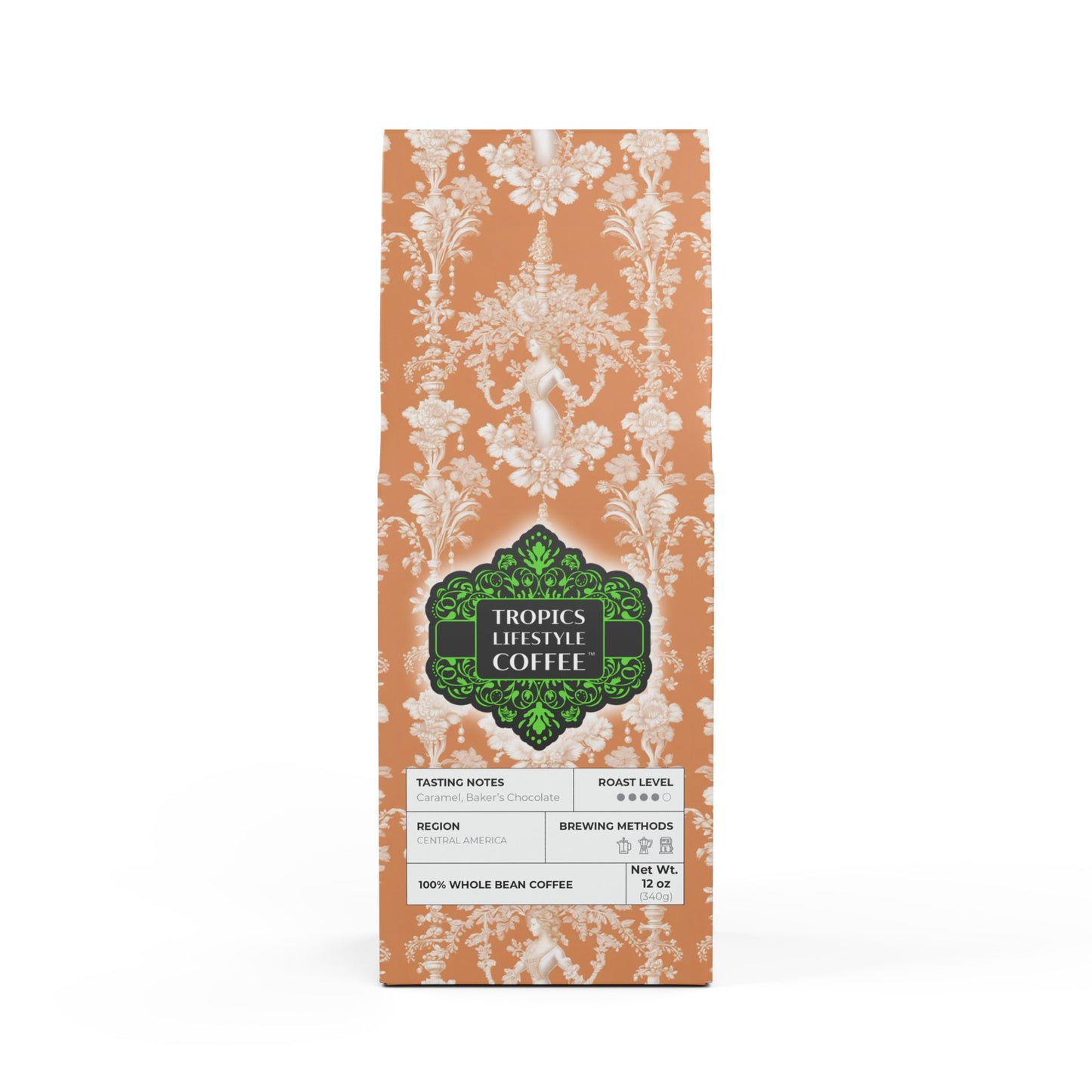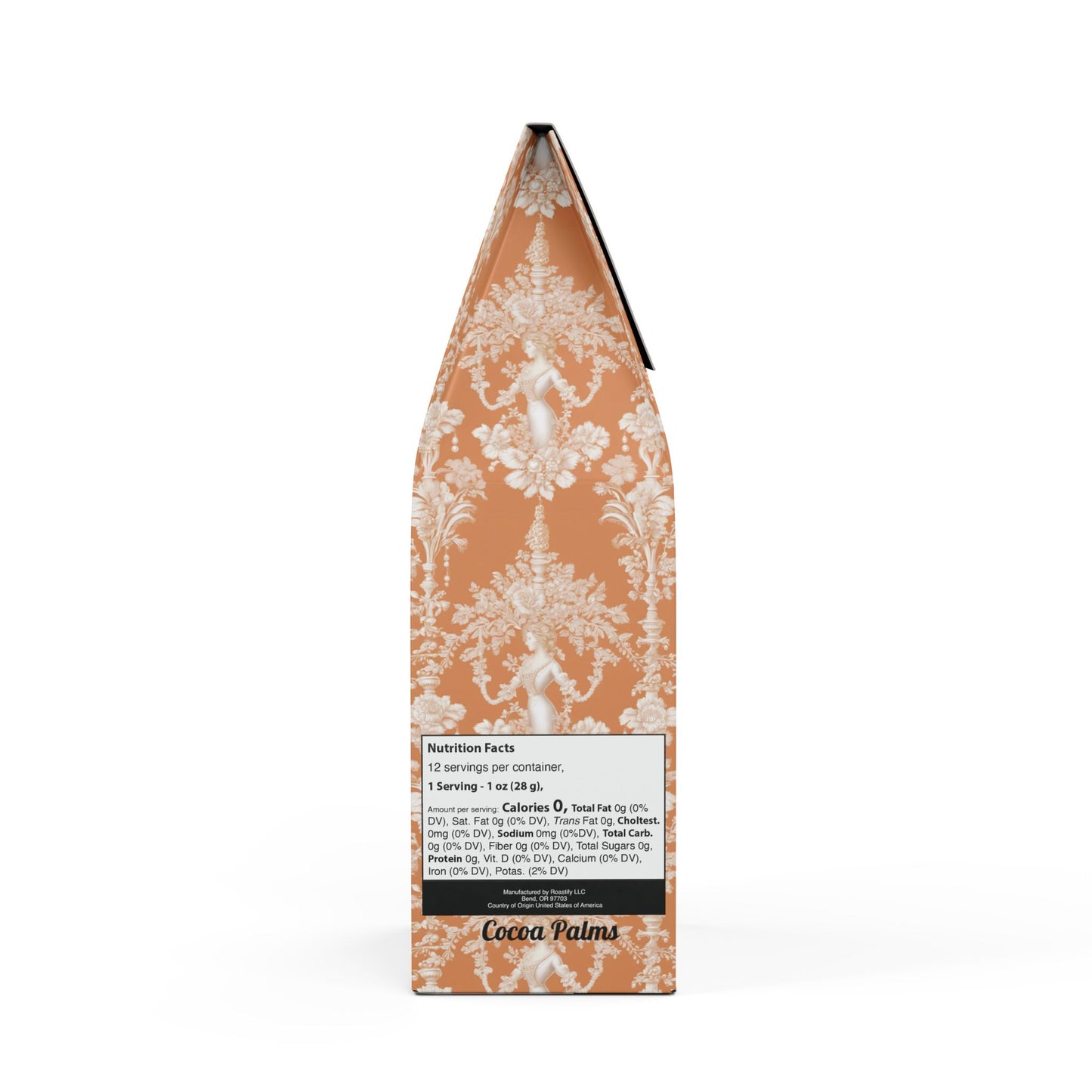 Meet the Cocoa Palms Blend™ ~ a bold and rich brew to kickstart your day! This 12oz pack features a medium-dark roast, delivering a deep body with notes of baker's chocolate and caramelized sugar. Meanwhile, the body is rich with warm spice, caramel, and dark chocolate-tasting notes that'll leave you craving more. Sourced from Central America, it's perfect for brewing in your drip coffee maker, French press, Moka Pot, or percolator, or enjoying as a refreshing cold brew. Whether you prefer whole bean or ground, we've got you covered. Roasted with care right here in the USA and certified as "Specialty Grade Craft Coffee." Limited-edition bag art features our original Pearl Lady Toile design, showcasing a stylized beautiful woman as a pearl, surrounded by classical toile motifs. Don't run out! Join our monthly Subscription coffee plan.