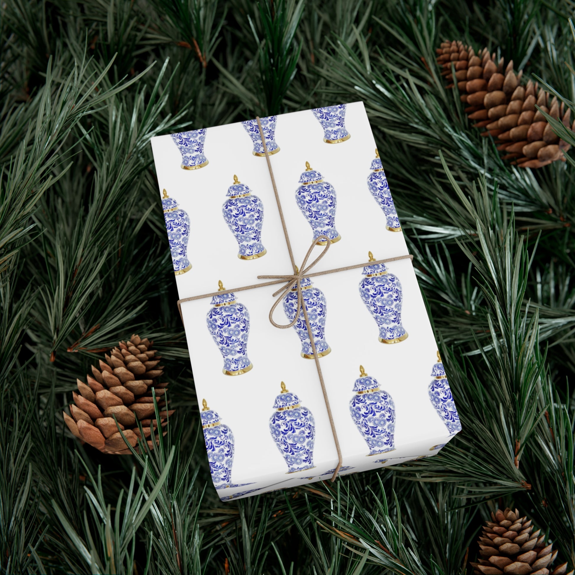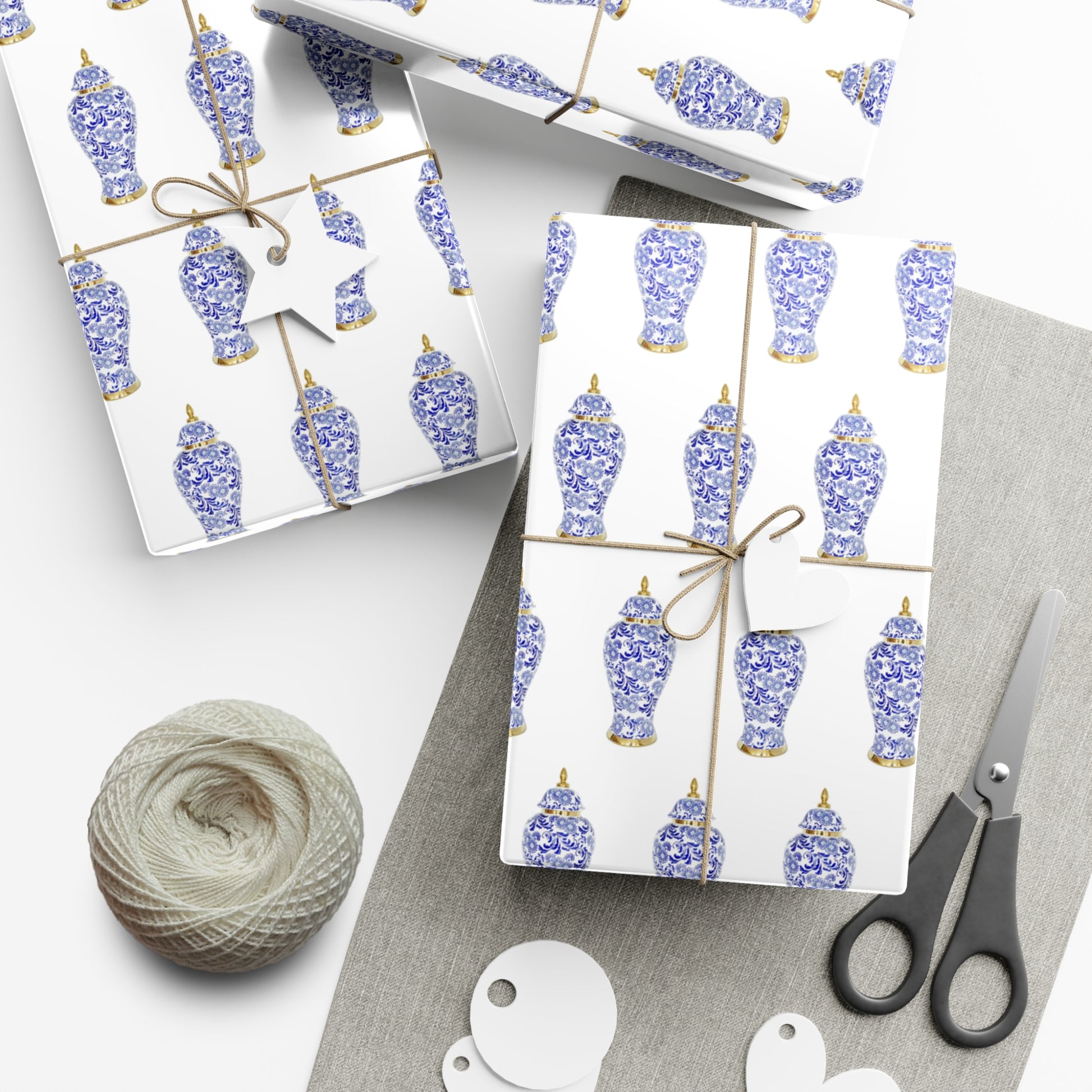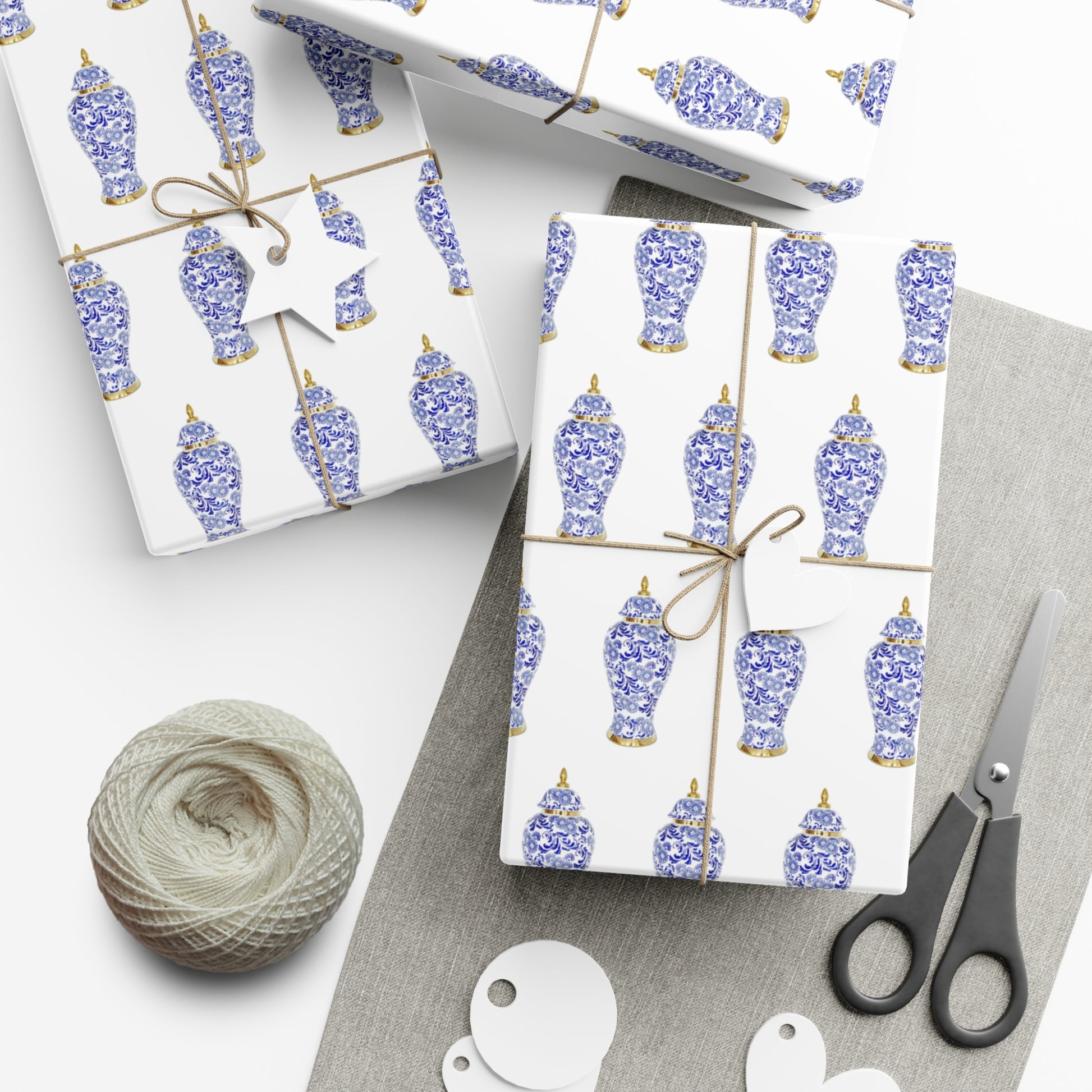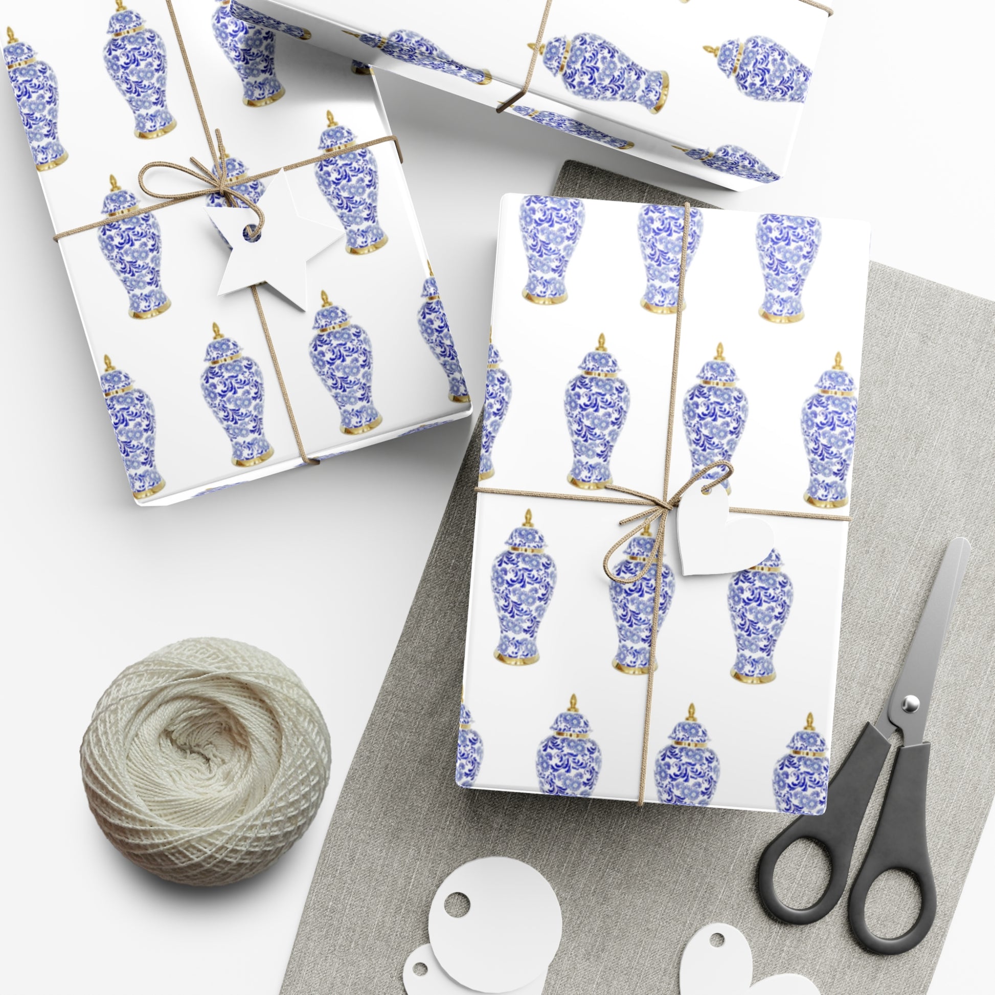 Wrapping Paper - Tropical Gift Wrap for All Occasions / 3 Sizes, 2 Finishes / Blue and White Ginger Jar