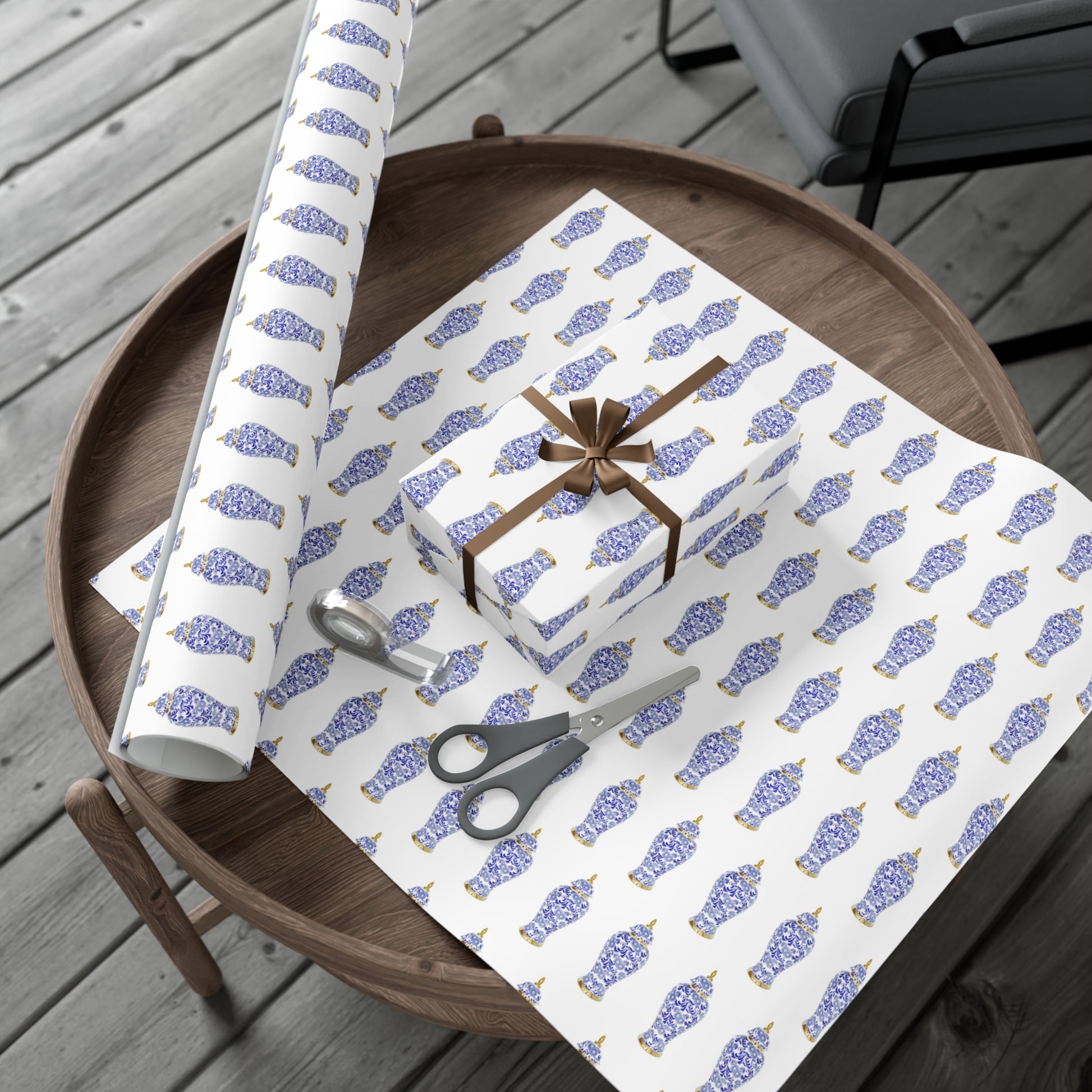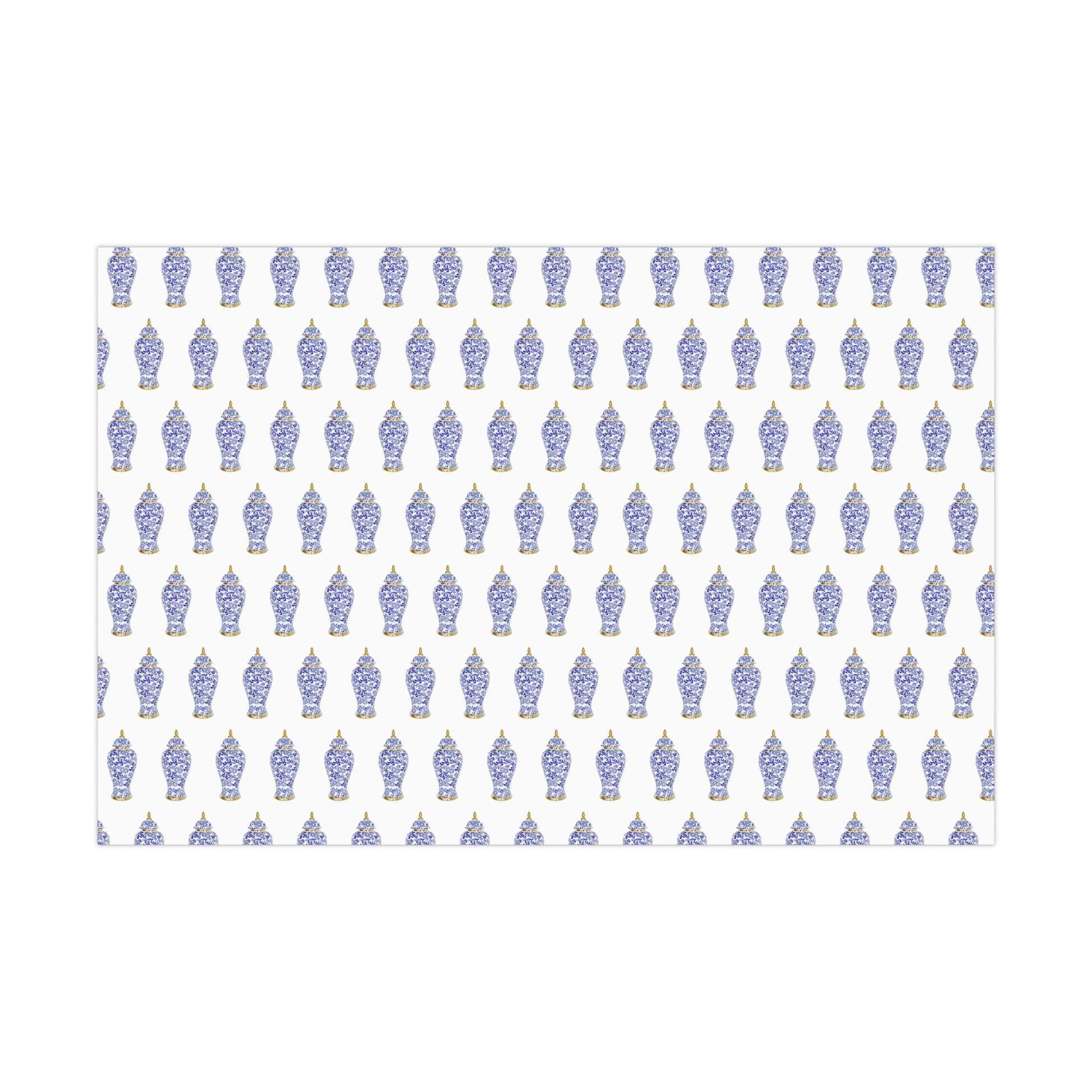 Make any gift bring an even wider smile to the receiver with this customized gift wrap paper. Features original timeless Blue and White Ginger Jar design celebrating the beauty of the ginger jar! Based on photo of real blue and white Asian ginger jar with gold accents. This vessel is a popular decor items in coatal and tropical homes worldwide. Available in two paper finishes (satin, matte), this wrap lets you choose what best fits your audience's needs. Each sheet is printed using GreenGuard UL Certified inks and the blank paper is made in the USA under strict quality control.
