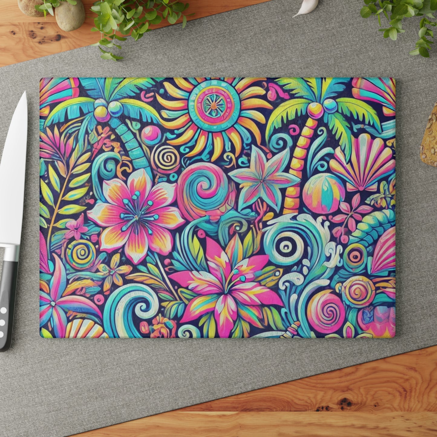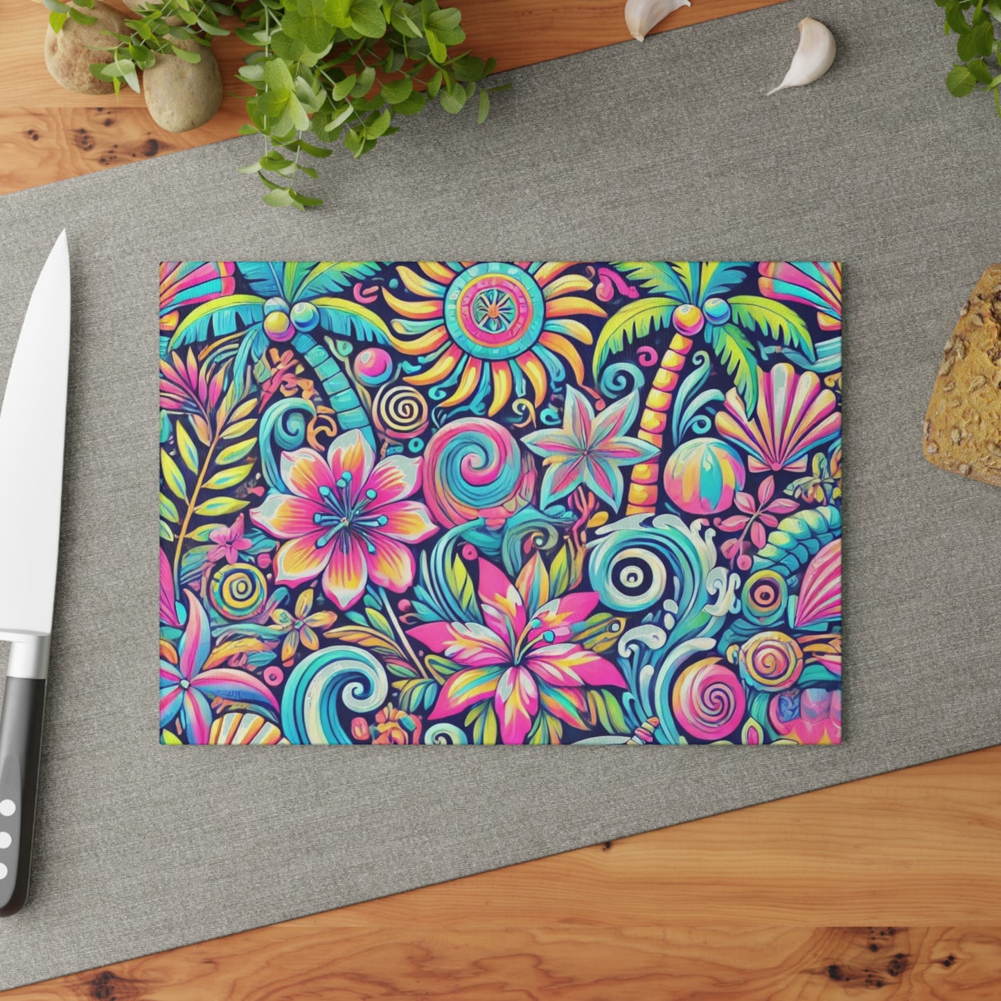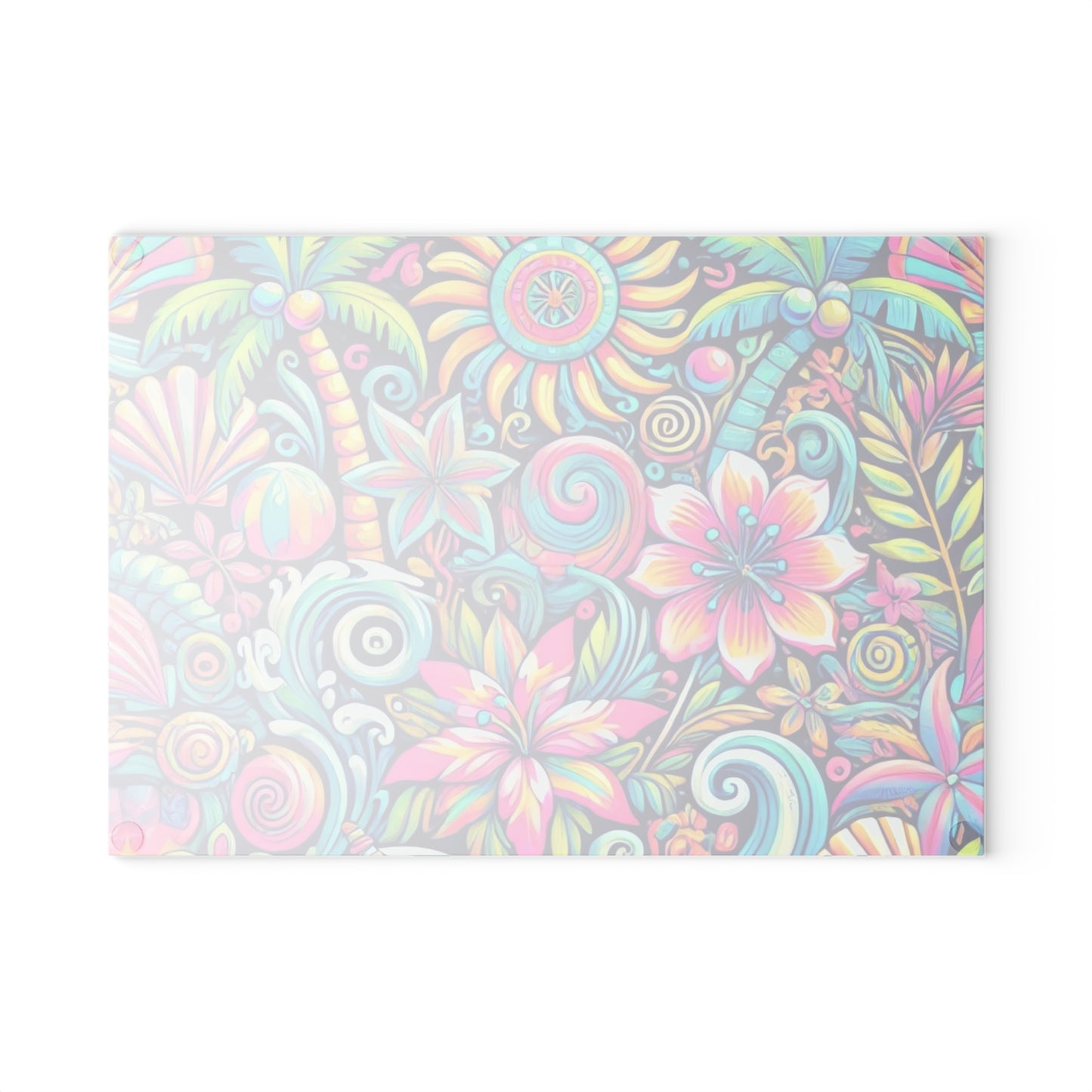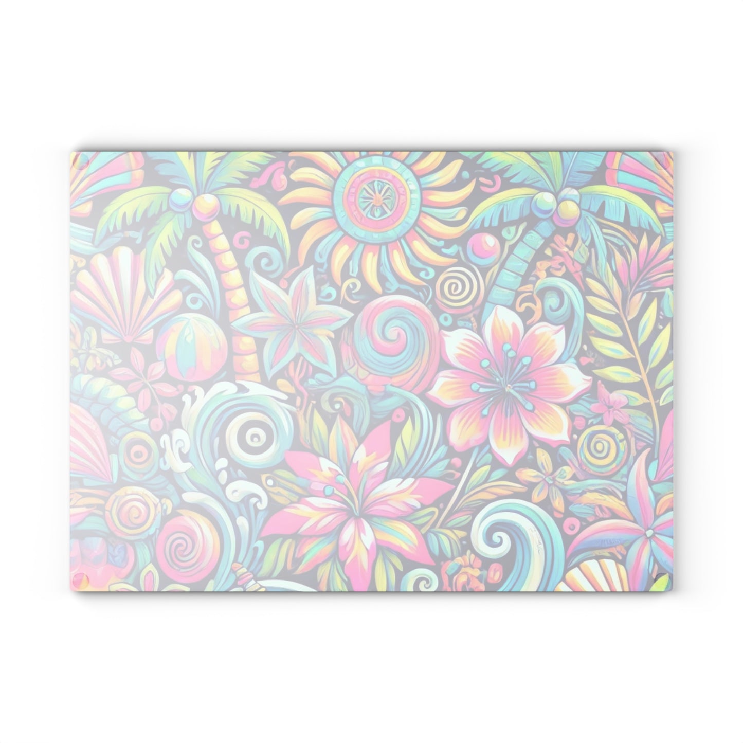 Bring a touch of character into any kitchen with this custom glass cutting board. Its tampered glass material is robust and helps prepare many a tasty meal. The textured surface makes it an ideal chopping, slicing and dicing area. Available in two sizes: 8" x 11" and 11" x 15". Features our exclusive design evoking tropical vibes.