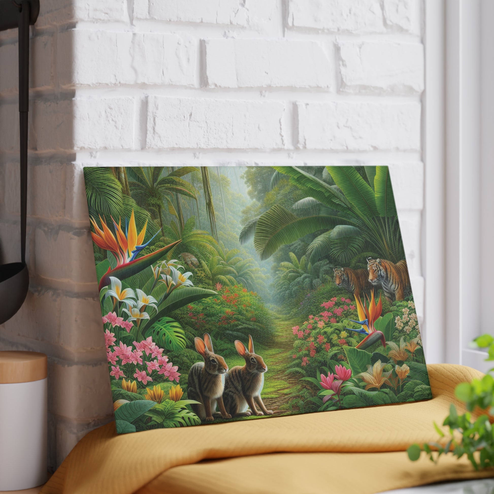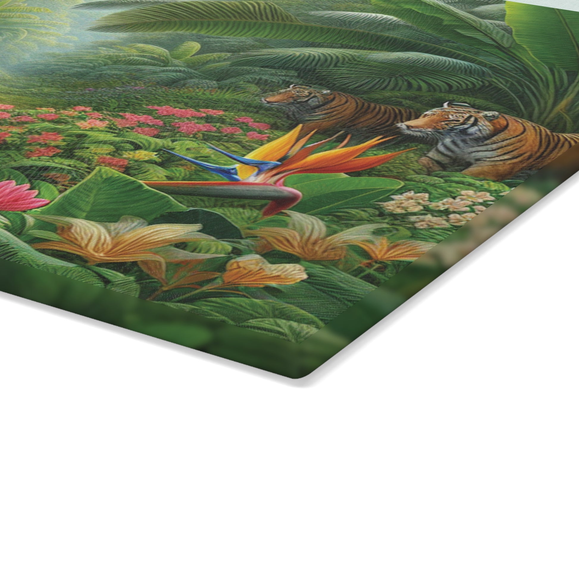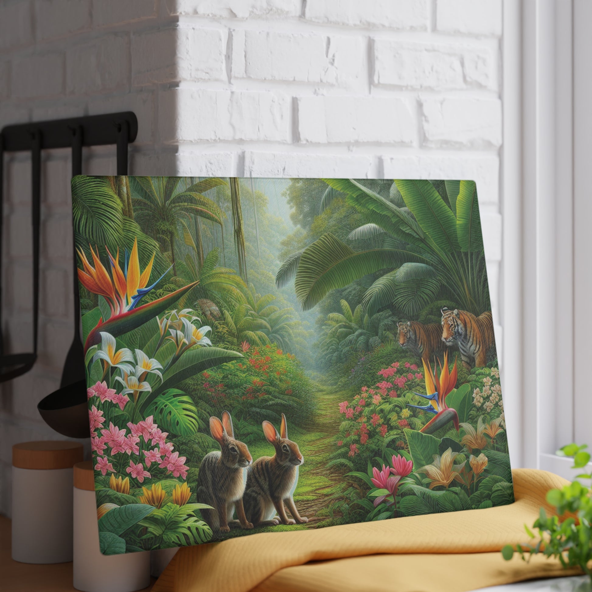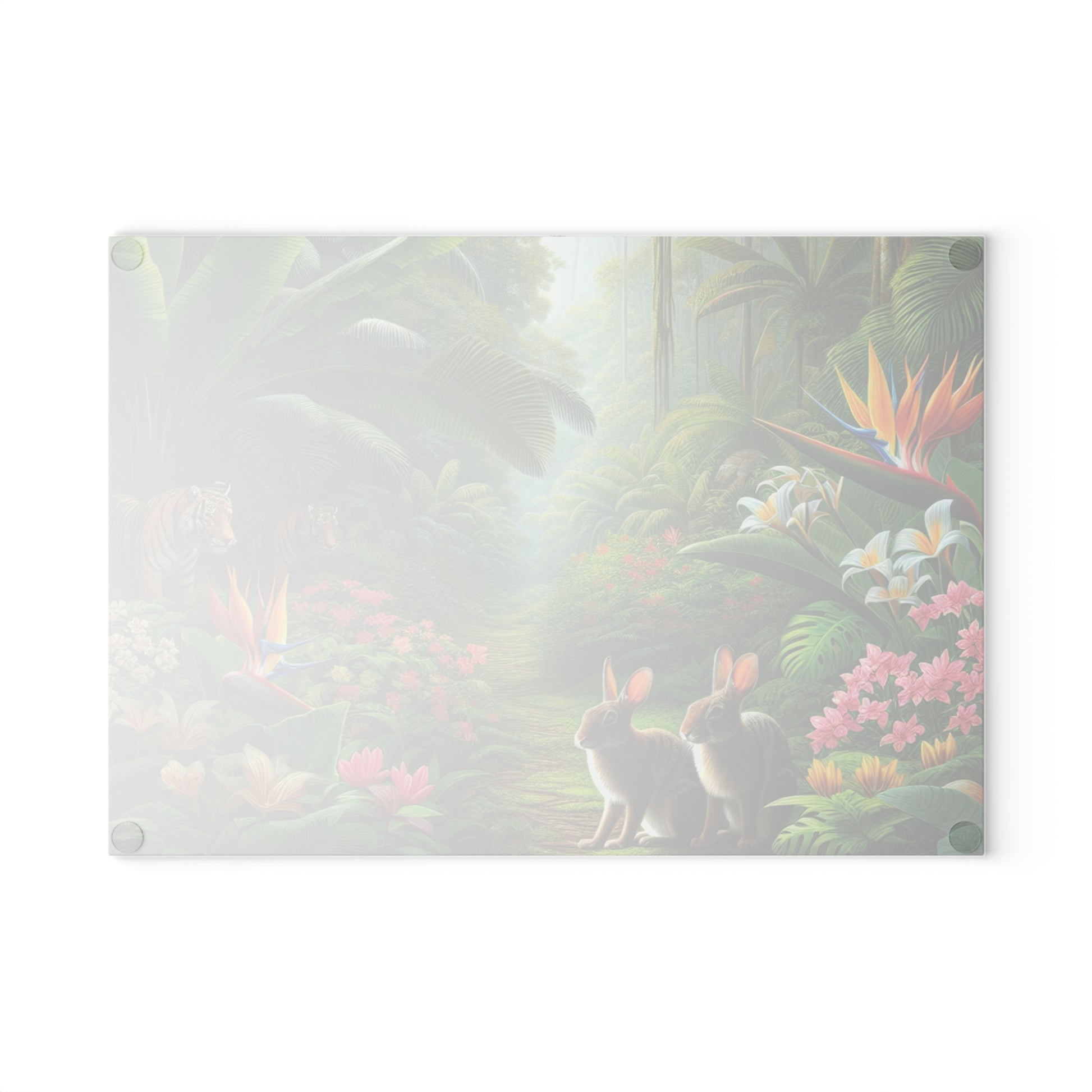 Bring a touch of character into any kitchen with this custom glass cutting board. Two bunnies in the rainforest hide from Big Cats taking a morning stroll. Its tampered glass material is robust and helps prepare many a tasty meal. The textured surface makes it an ideal chopping, slicing and dicing area. Available in two sizes: 8" x 11" and 11" x 15". Features our exclusive design evoking tropical vibes.