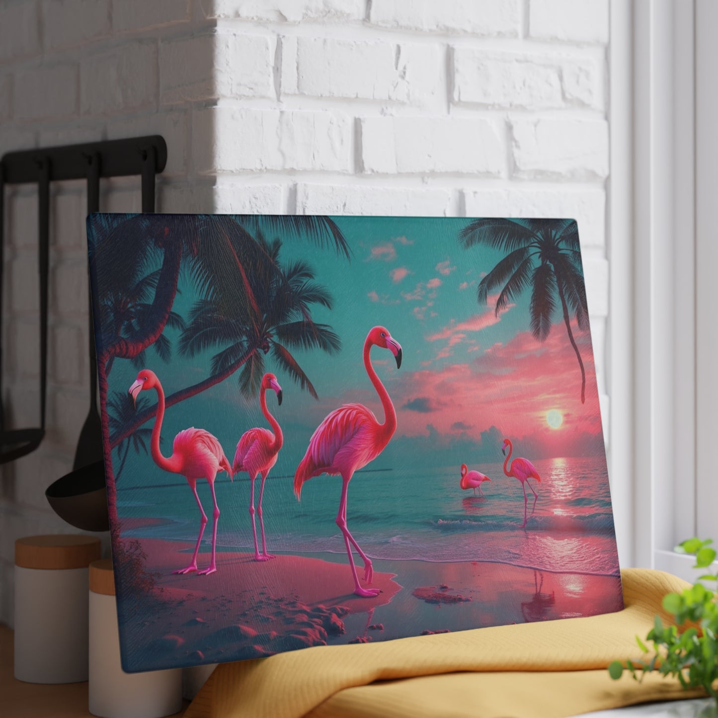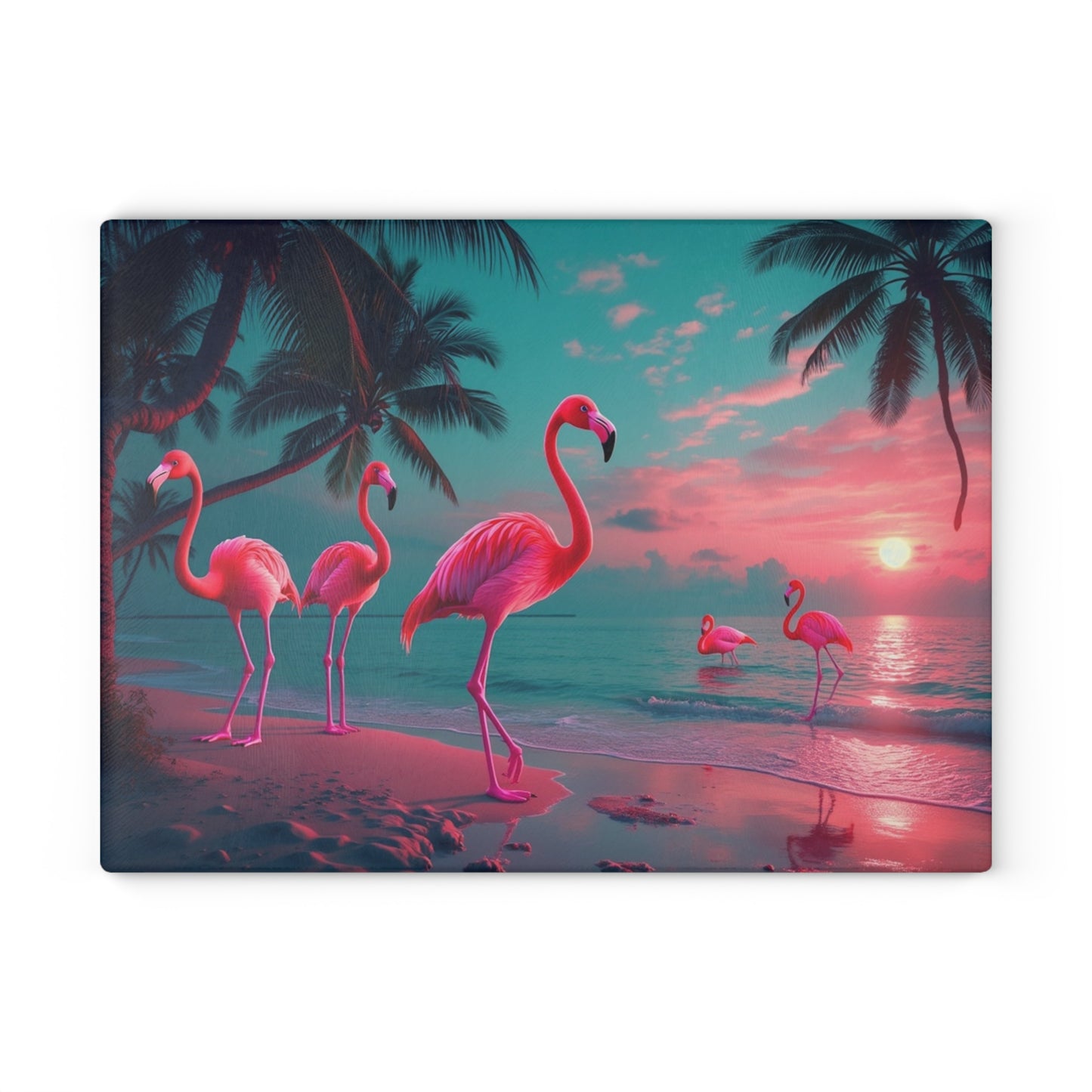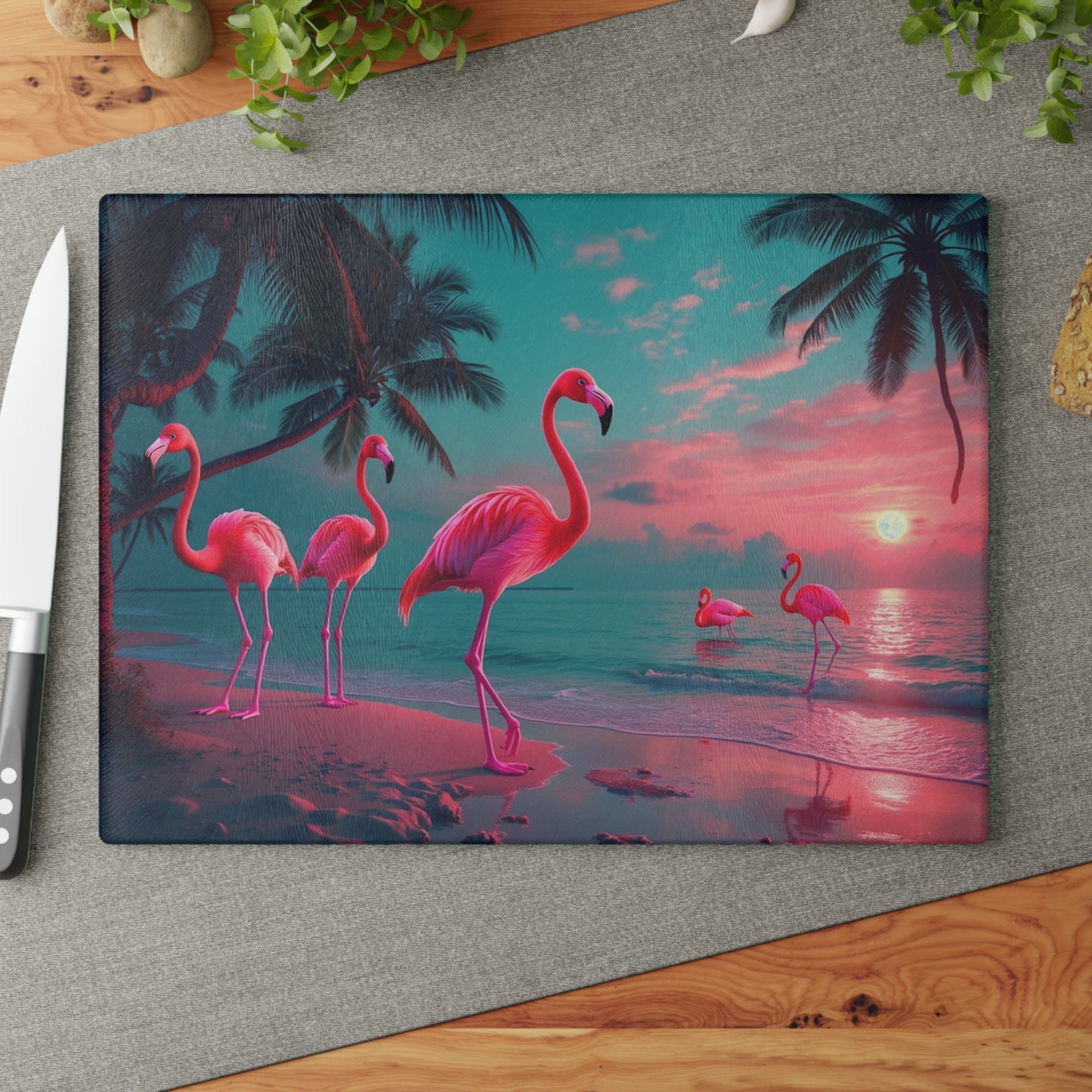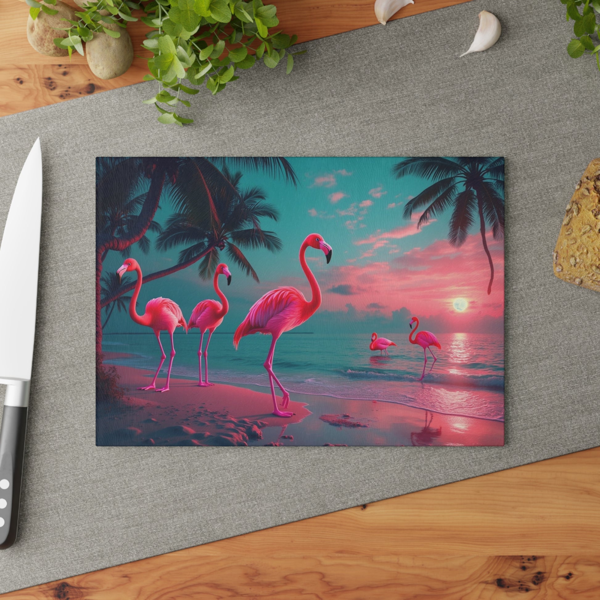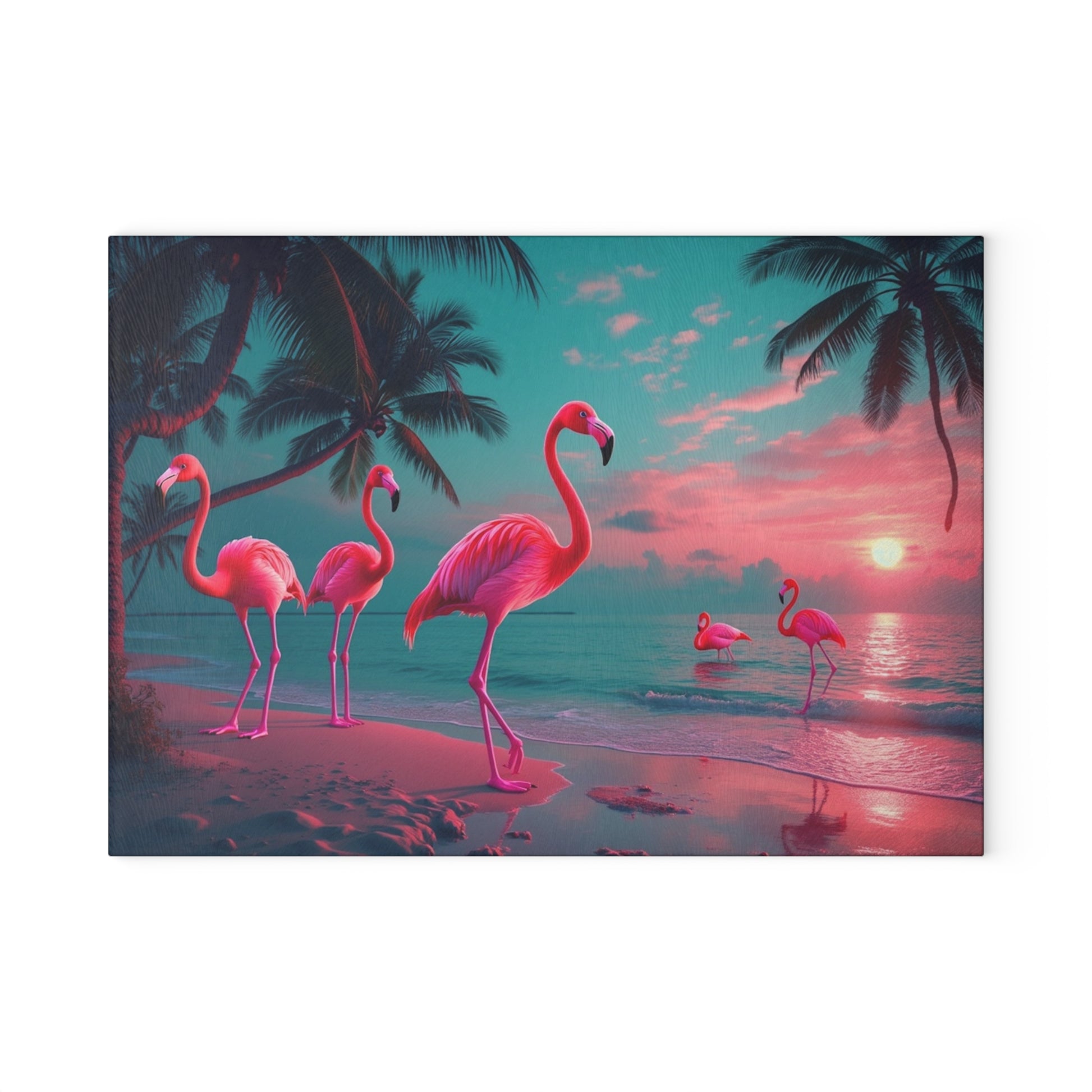 Glass Cutting Board, 2 sizes - Neon Flamingos at Night