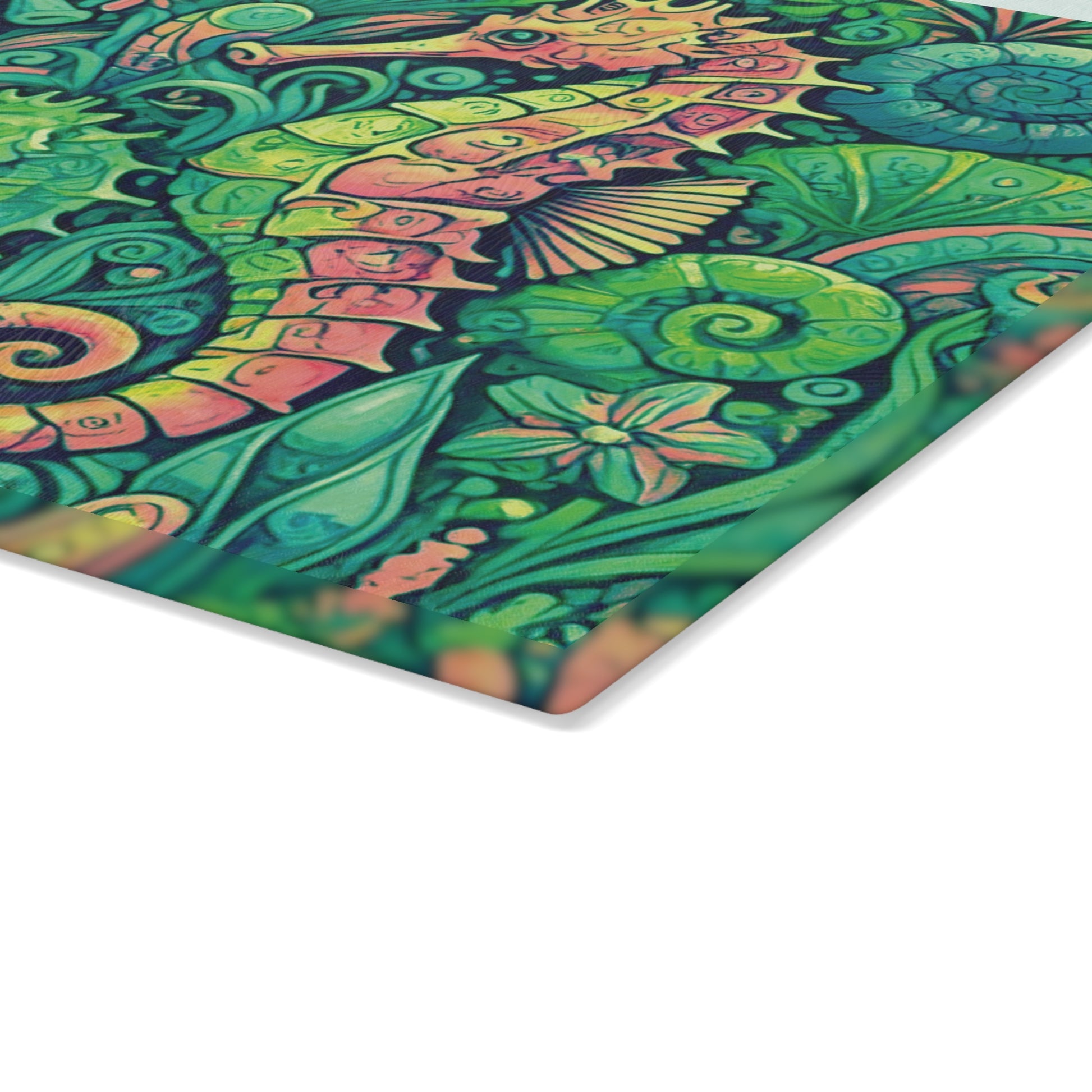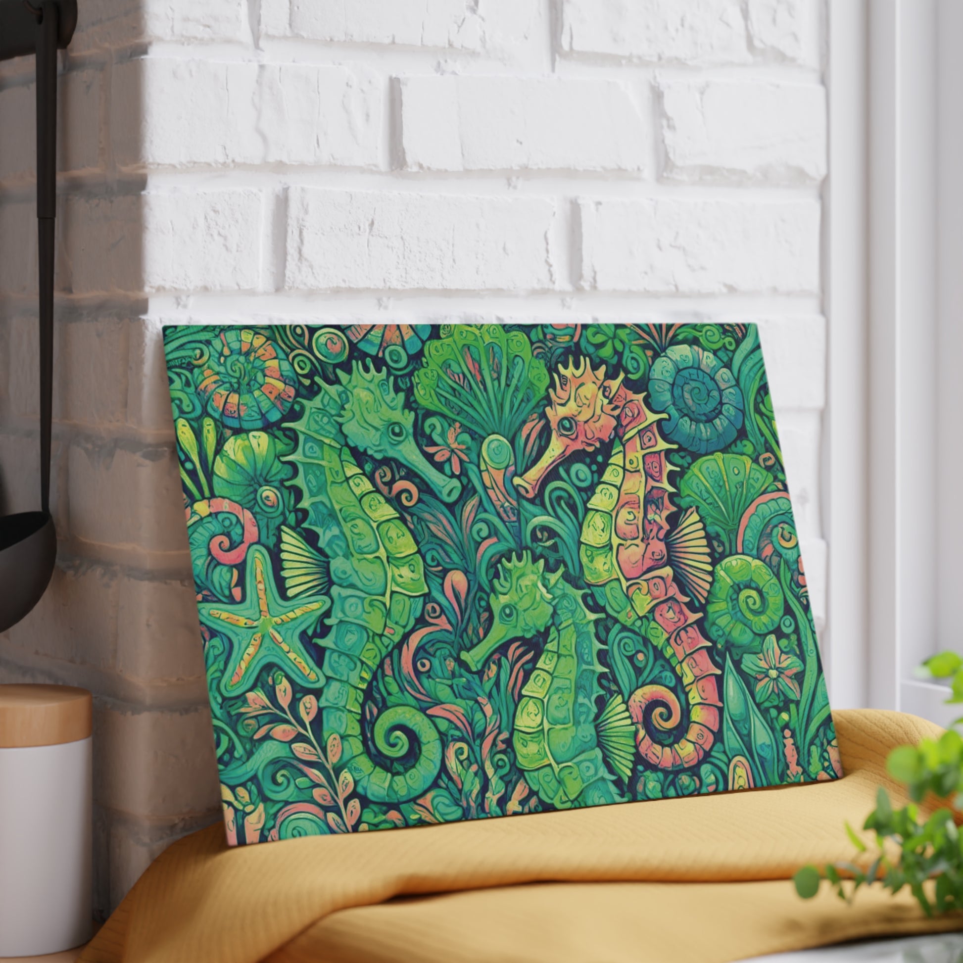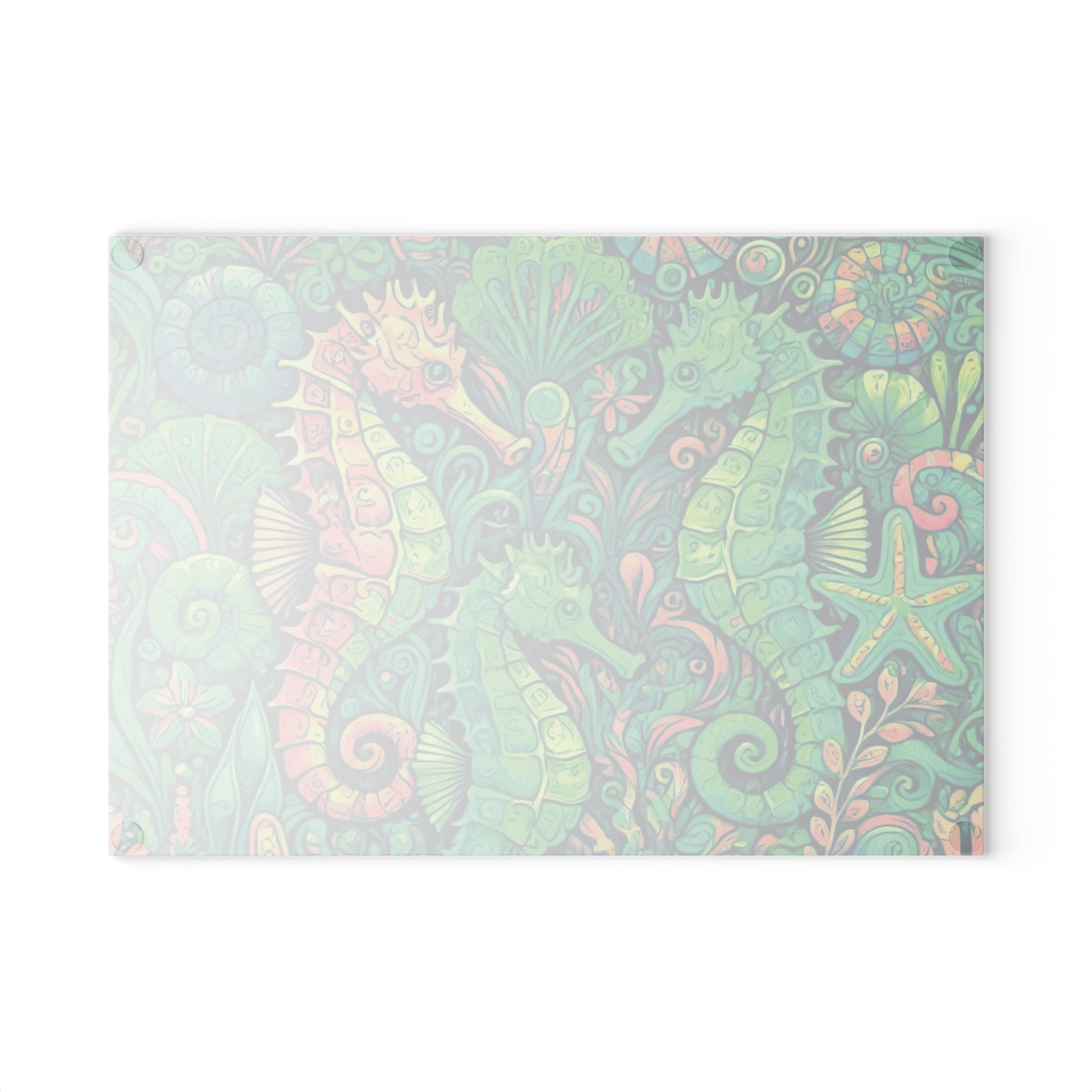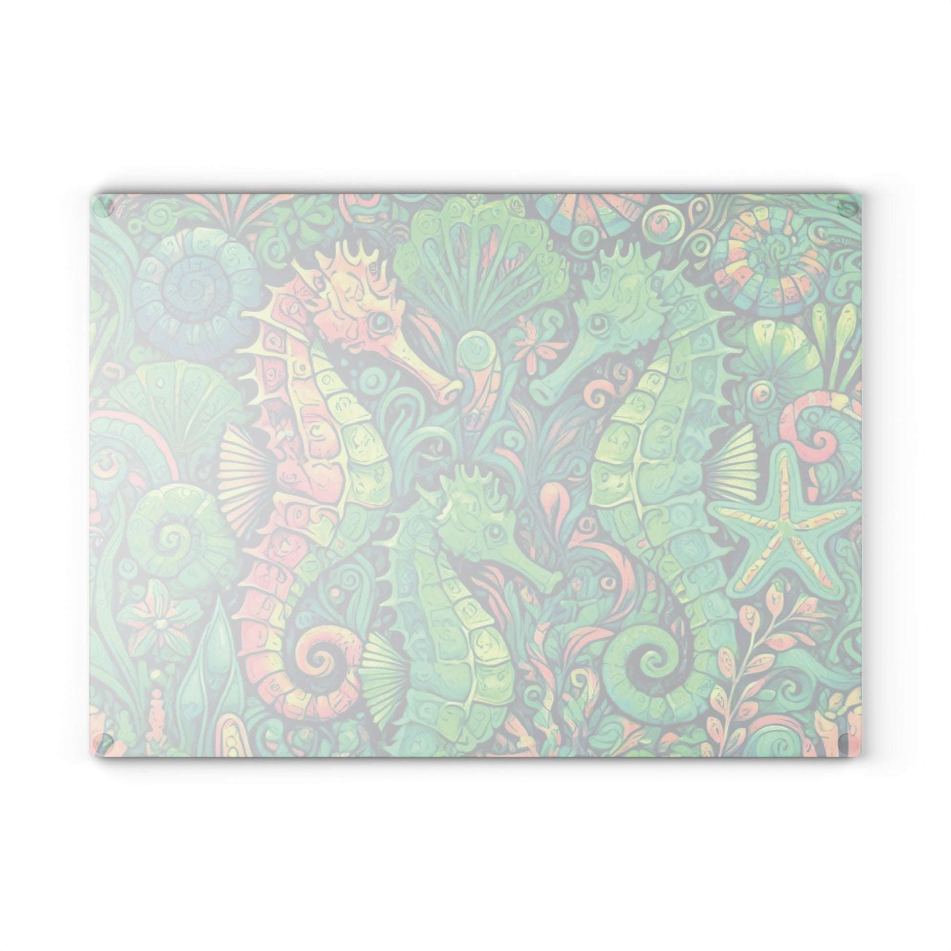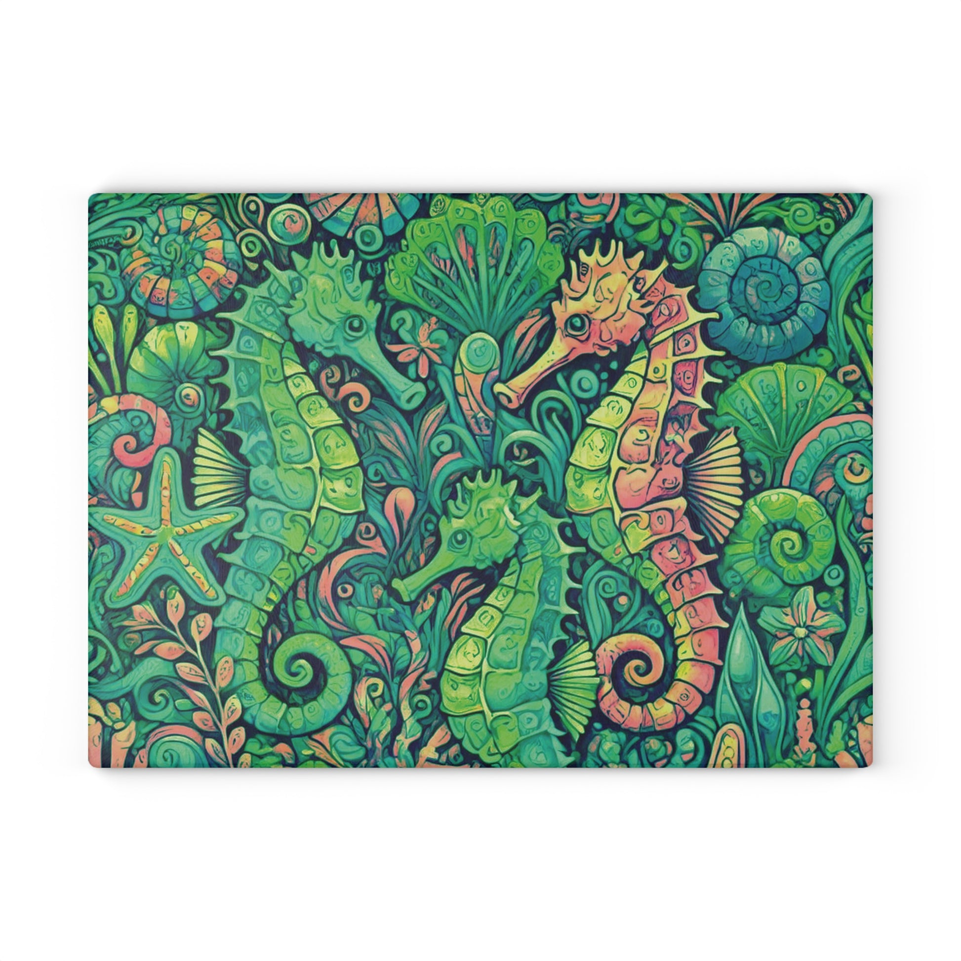 Glass Cutting Board, 2 sizes - Seahorses, Lime
