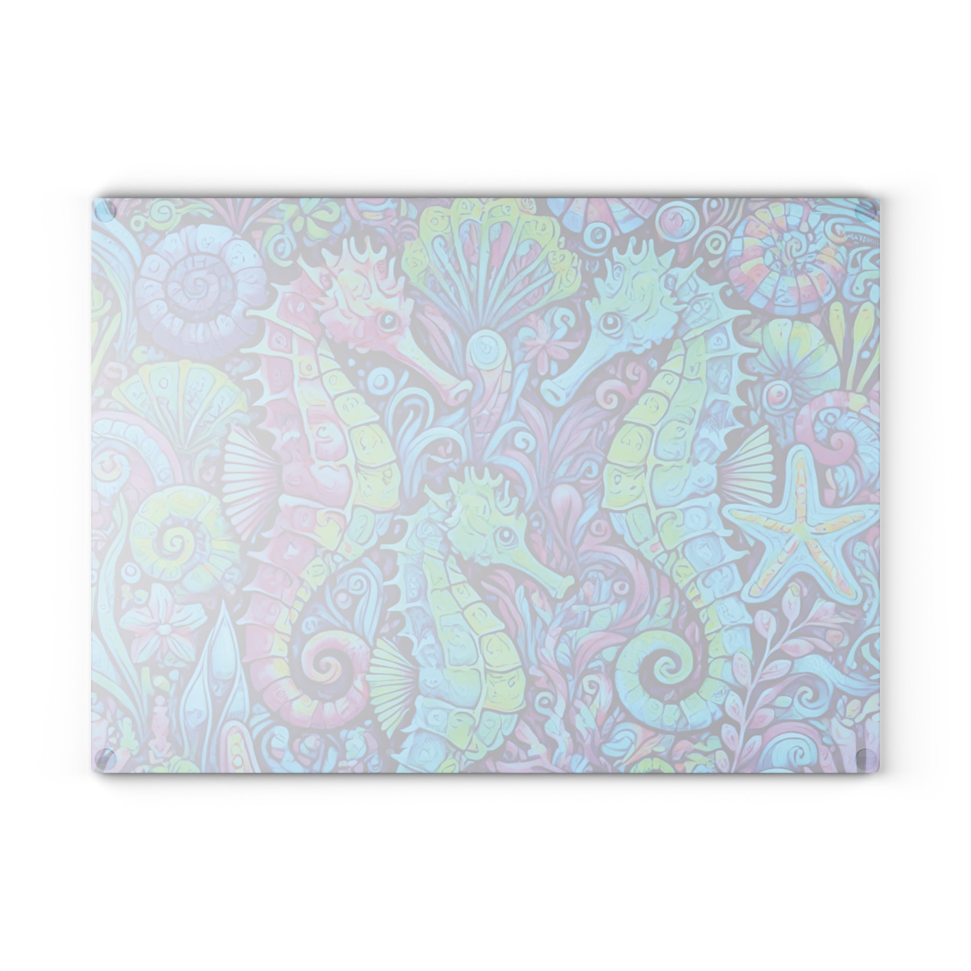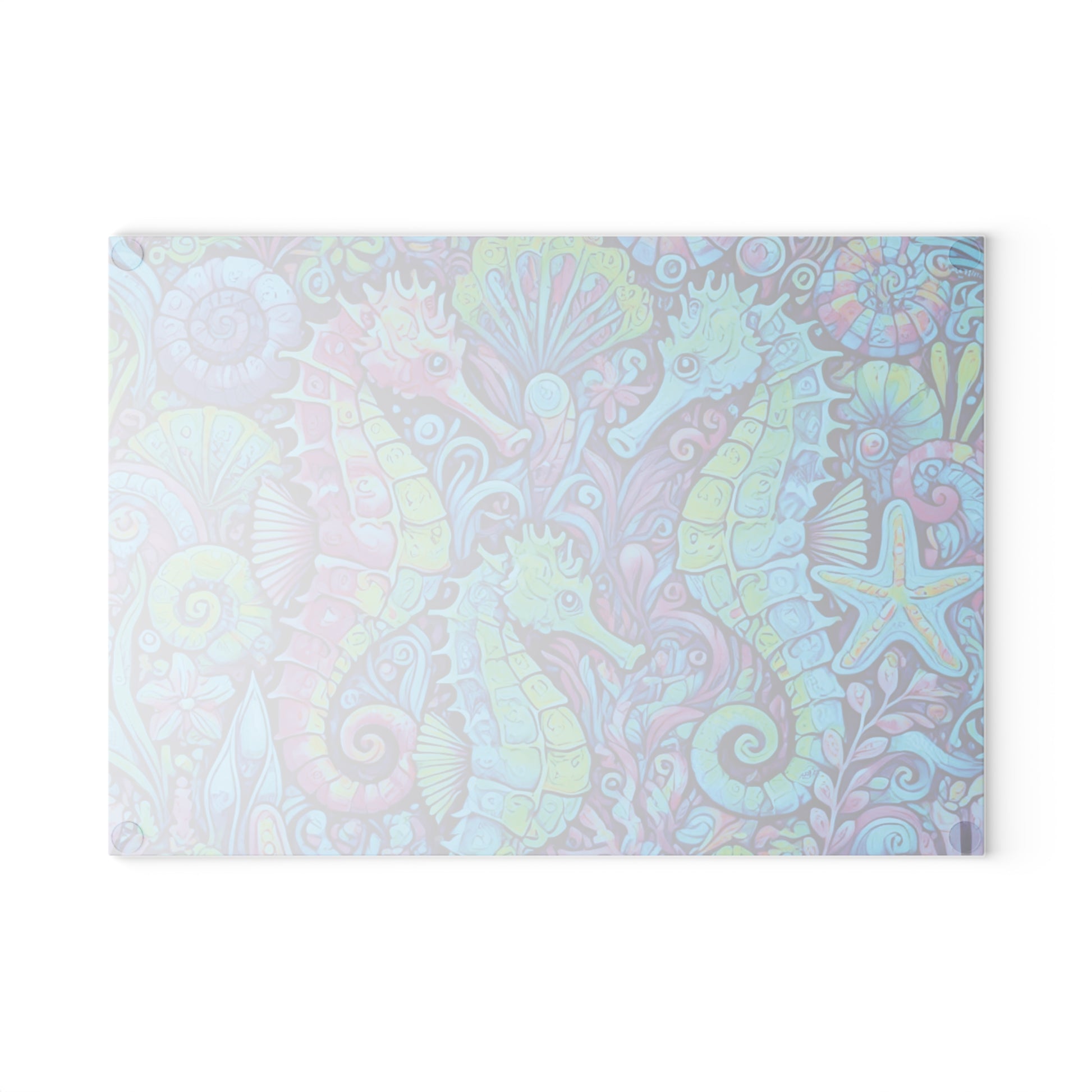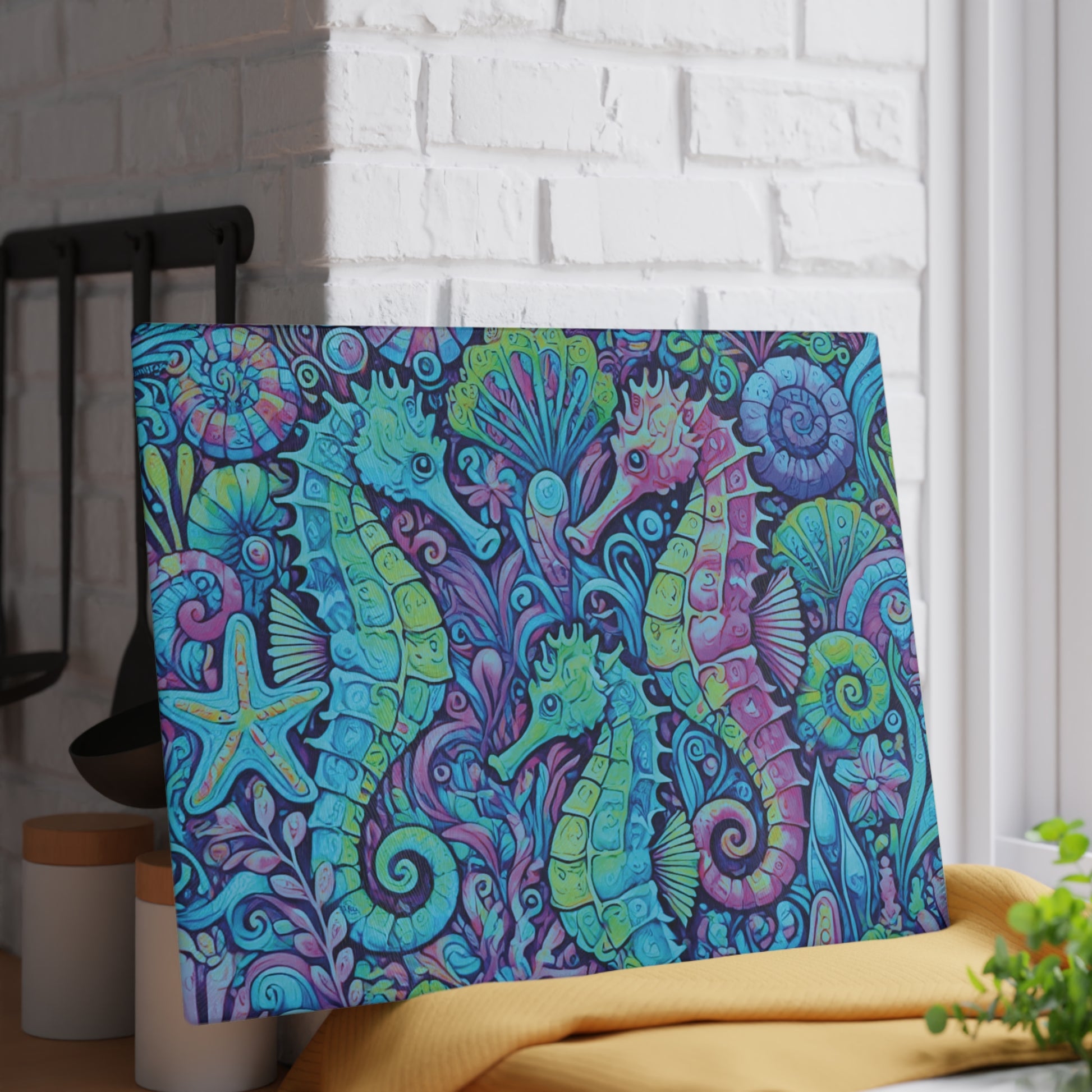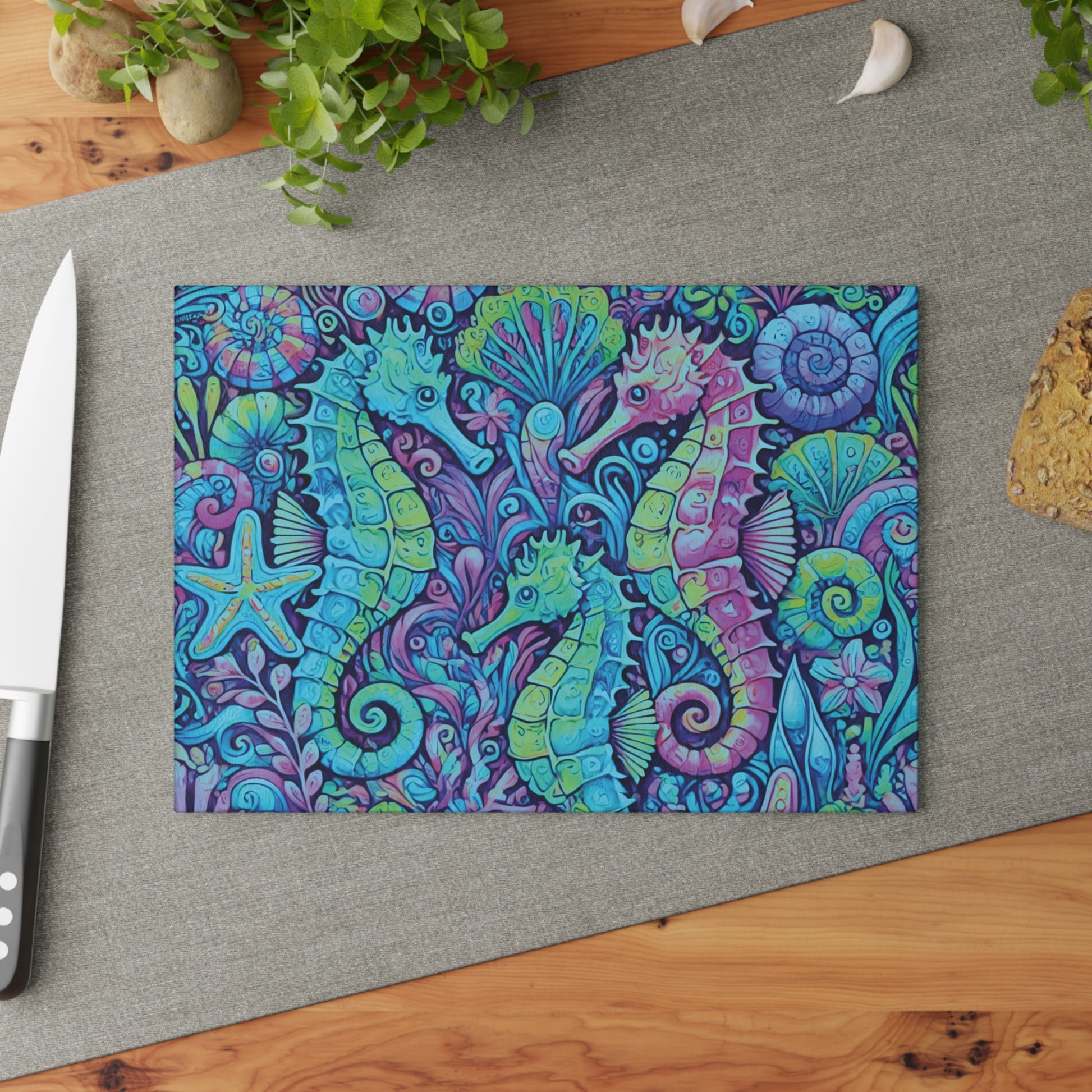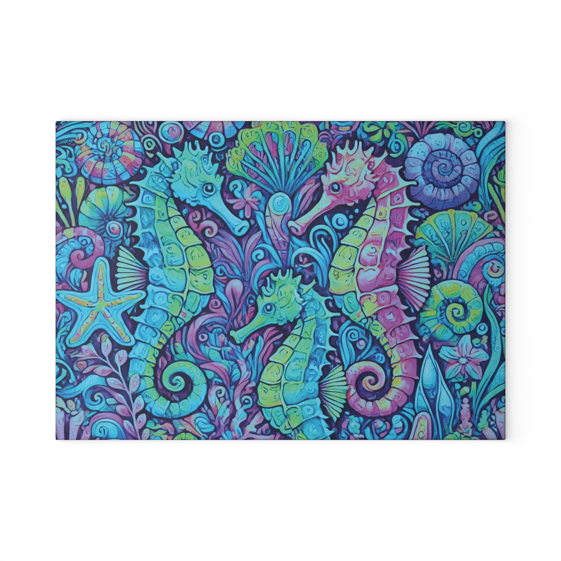 Glass Cutting Board, 2 sizes - Seahorses Turquoise Pop