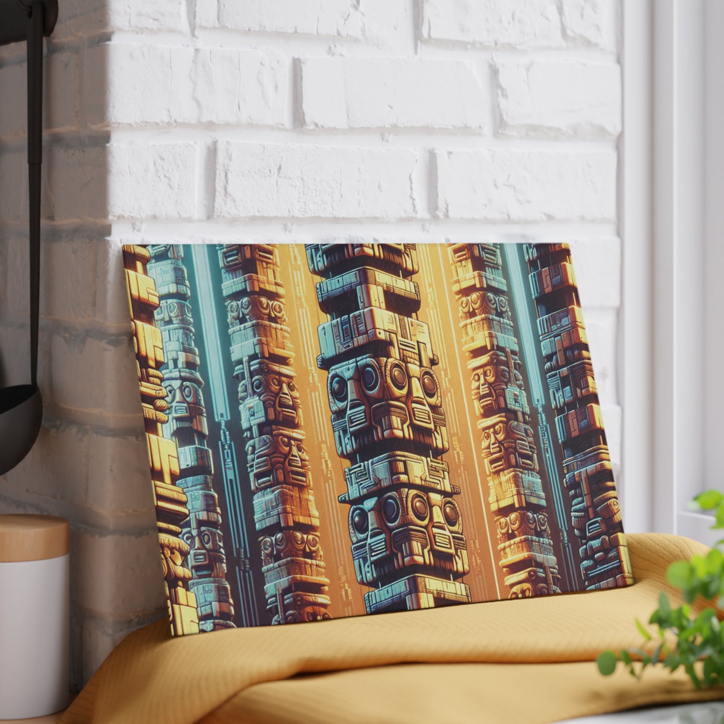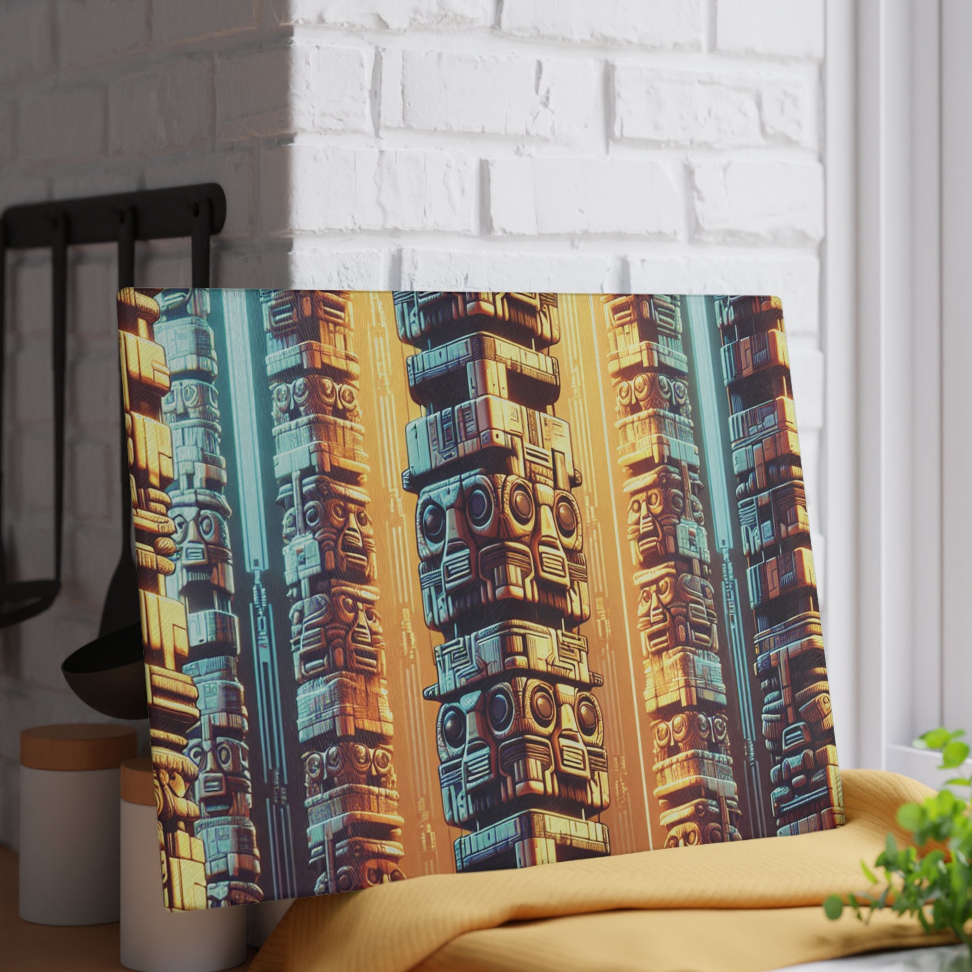 Bring a touch of character into any kitchen with this custom glass cutting board. The textured surface makes it an ideal chopping, slicing and dicing area. Available in two sizes: 8" x 11" and 11" x 15". Features our exclusive design evoking tropical vibes. Are the tiki totems from the past...or the future?