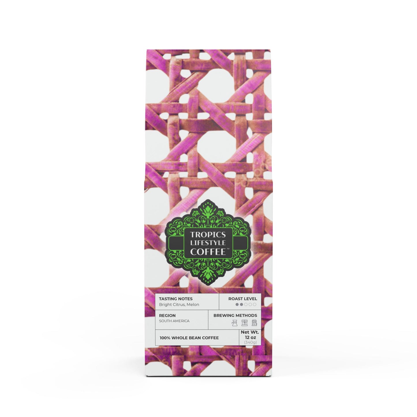 Introducing our Golden Sands Single Origin™—a coffee lover's dream! This 12oz pack offers a light-medium roast, giving you a mellow yet savory experience with a hint of sweetness and a crisp acidity. Dive into flavor notes of cooked honeydew and cocoa straight from the heart of South America. Whether you prefer pour-over or Aeropress, this blend will effortlessly become part of your daily routine. Available in both whole bean and ground options. Roasted with care in the USA from ingredients sourced worldwide and graded/certified as "Specialty Grade Craft Coffee." Limited-edition bag art features our original tropical chair wicker pattern. Don't run out! Join our monthly Subscription coffee plan.