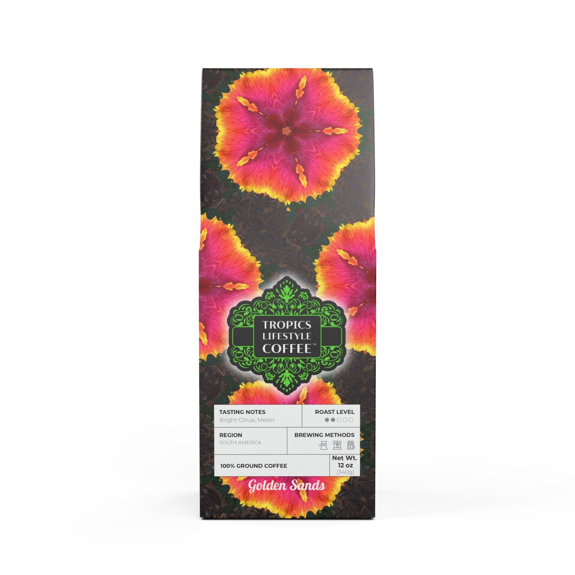 Introducing our Golden Sands Single Origin™—a coffee lover's dream! This 12oz pack offers a light-medium roast, giving you a mellow yet savory experience with a hint of sweetness and a crisp acidity. Dive into flavor notes of cooked honeydew and cocoa straight from the heart of South America. Whether you prefer pour-over or Aeropress, this blend will effortlessly become part of your daily routine. Available in both whole bean and ground options. Roasted with care in the USA from ingredients sourced worldwide and graded/certified as "Specialty Grade Craft Coffee." Top 10% of coffee produced in the world. Limited-edition bag art features our original tropical hibiscus flower. Don't run out! Join our monthly Subscription coffee plan.