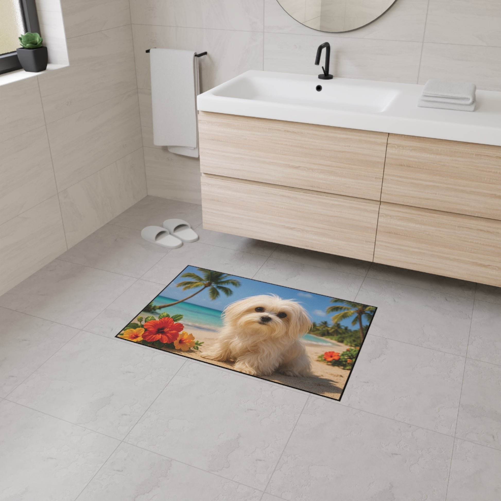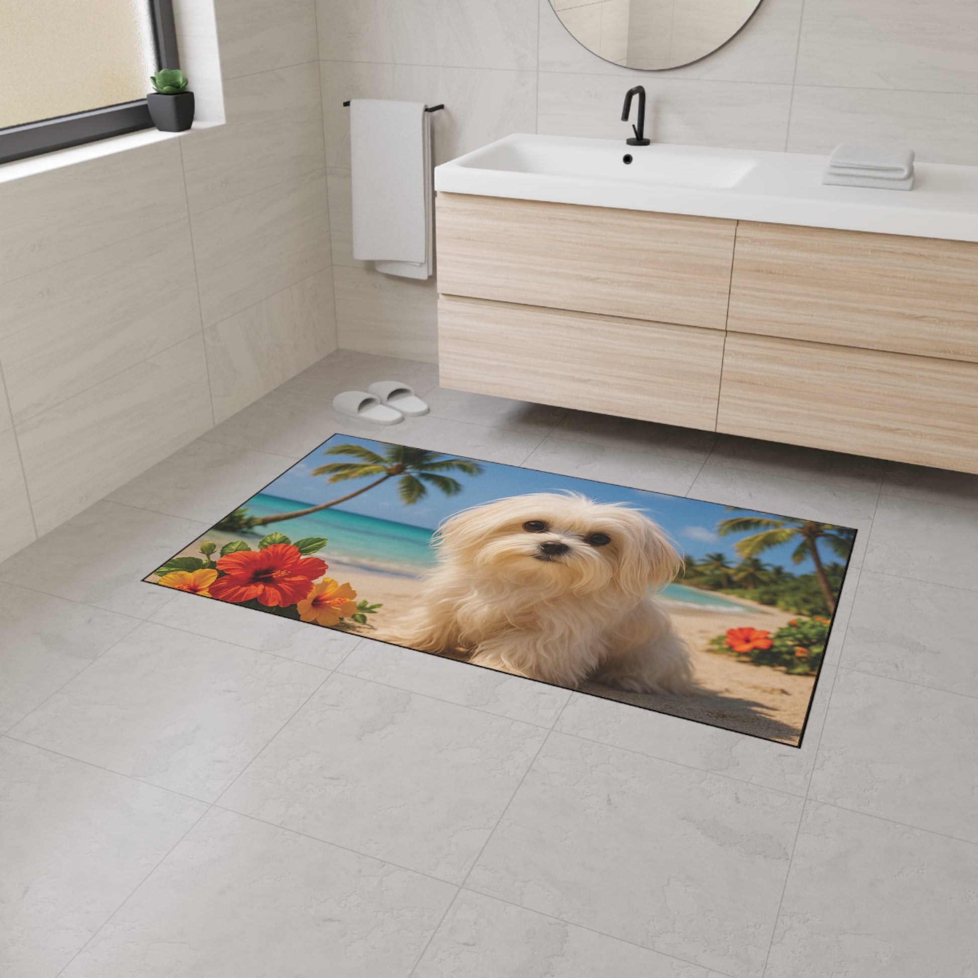 Introduce a splash of color and comfort to your home with our Heavy Duty Floor Mat. Enjoy the tropical scene of puppy Ariel the Maltese/Shih Tzu enjoying a day at the beach., transforming your space into a serene oasis. Use for outdoor or indoor entrance mat, or kitchen snk mat. Ideal for beach lovers and anyone looking to add a cheerful touch to their entryway, kitchen, or studio. It’s perfect for holidays, housewarming gifts, or simply to brighten your everyday life. Everyone will appreciate this eye-catching design that speaks to the vibrant spirit of summer and relaxation.
