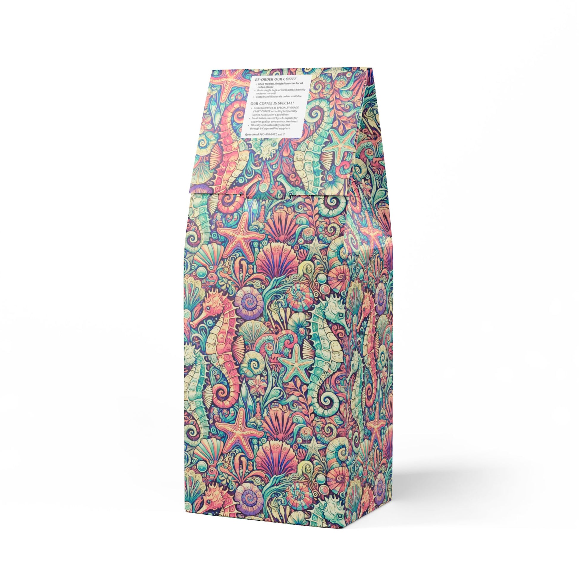 The Beach Sunrise Blend™ is a light roast from South and Central America that is perfect as a daily staple thanks to its light body. Each cup comes with dried fruit and citrus flavors with hints of milk chocolate and almonds. Perfect for pour-over, Aeropress, Espresso, or a delightful cold brew. Available in 12oz packs of whole bean and ground options. Roasted with care right here in the USA. and graded/certified as "Specialty Grade Craft Coffee." Limted-edition bag art features our original Seahorse Trio design, with beautiful stylized seahorses, seashells and other ocean motifs taking you on a virtual vacay. Don't run out! Join our monthly Subscription coffee plan.