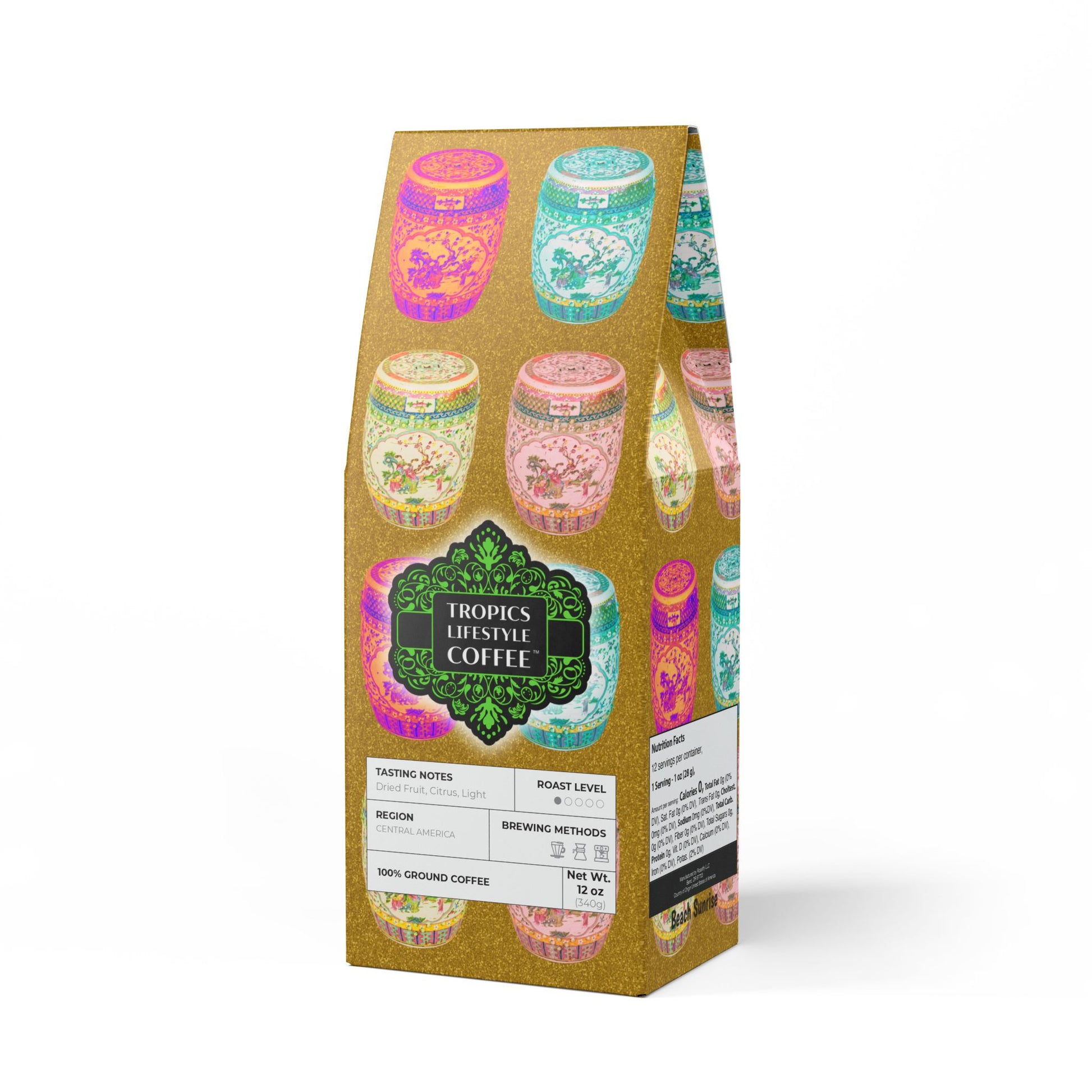 Beach Sunrise Blend™ (Light Roast) Specialty Grade Craft Coffee / Tropical Garden Stools, Gold