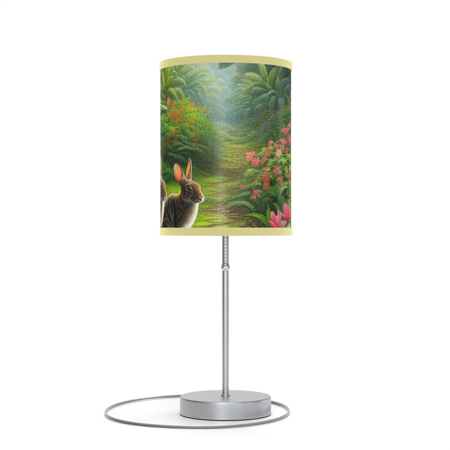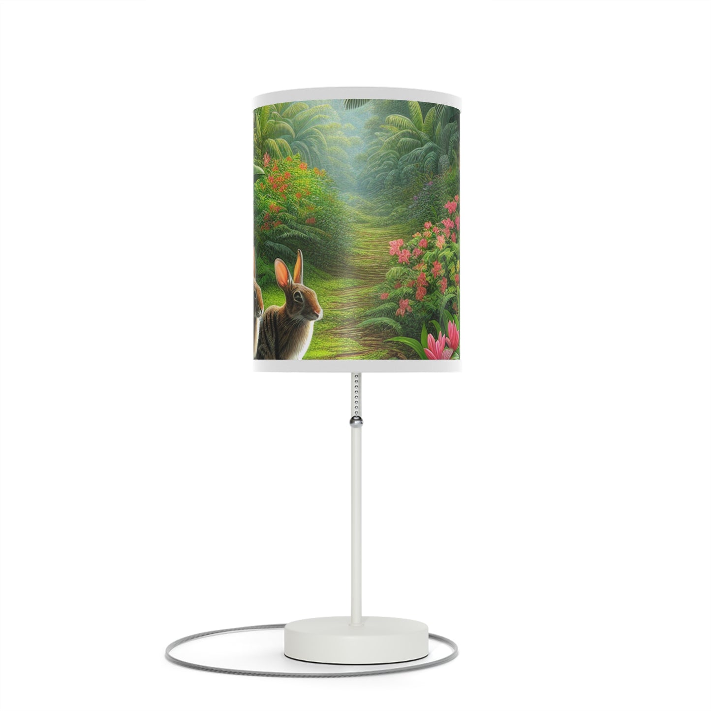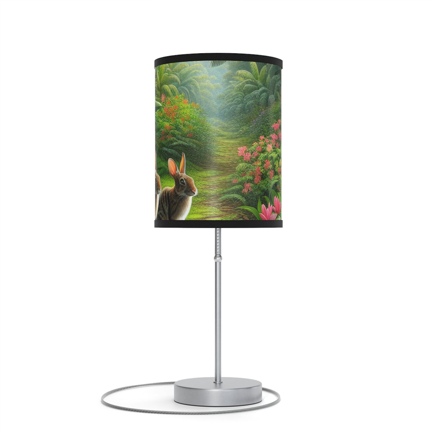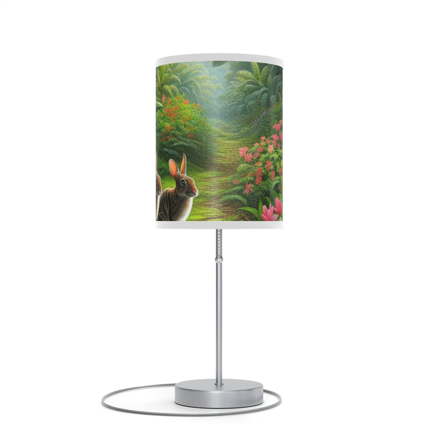 This unique table lamp stand features a steel base that comes with a classy finish in silver or white. The shade of the lamp is available in multiple different trim colors to accent our exclusive design Hidden Rabbits with two rainforest hares hiding quietly from a big jungle cat.