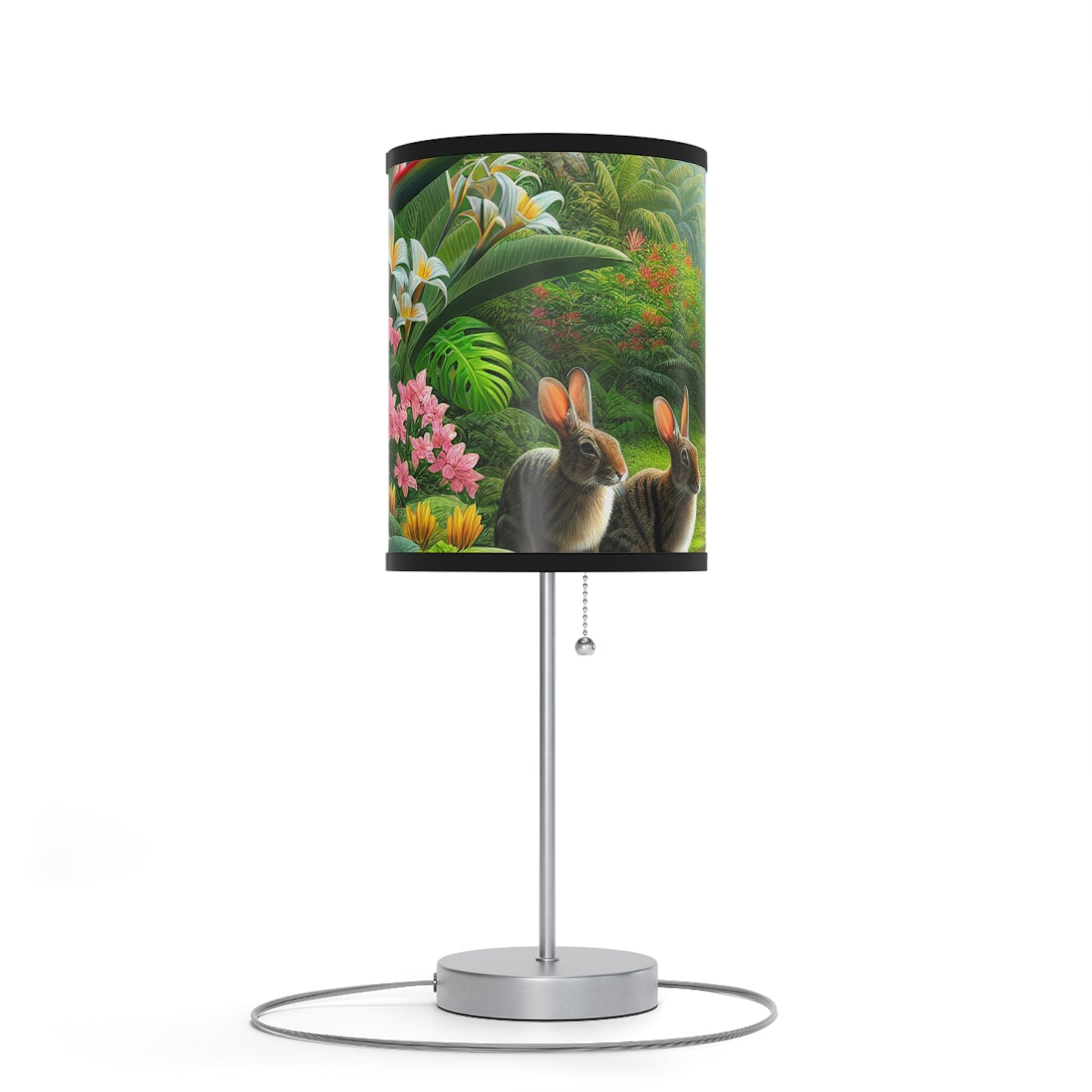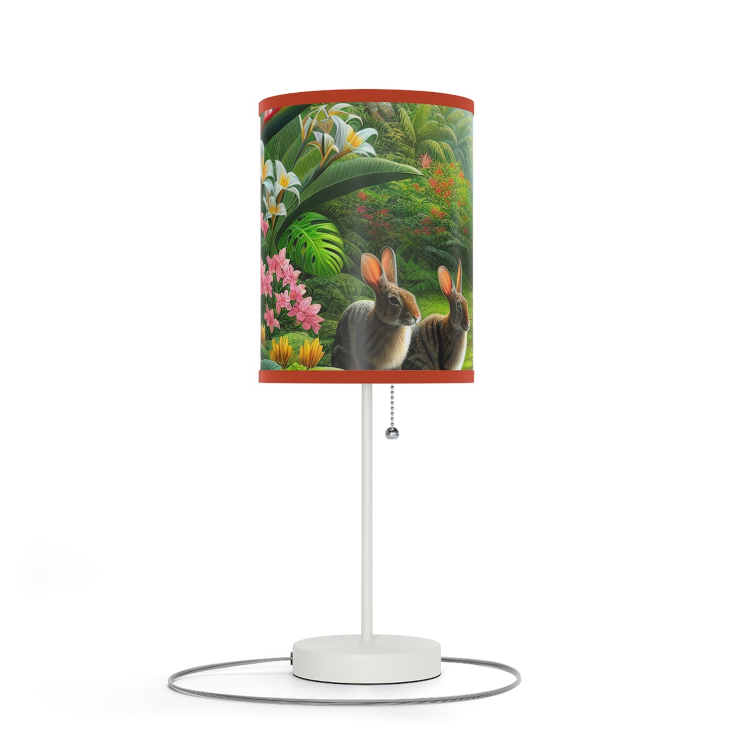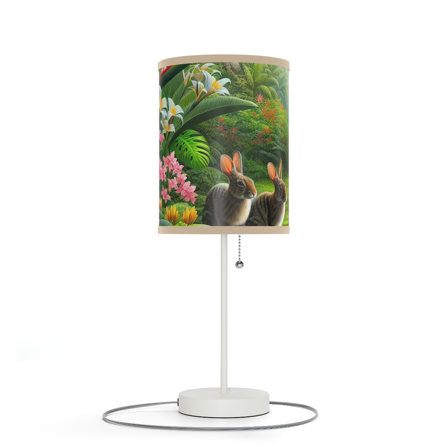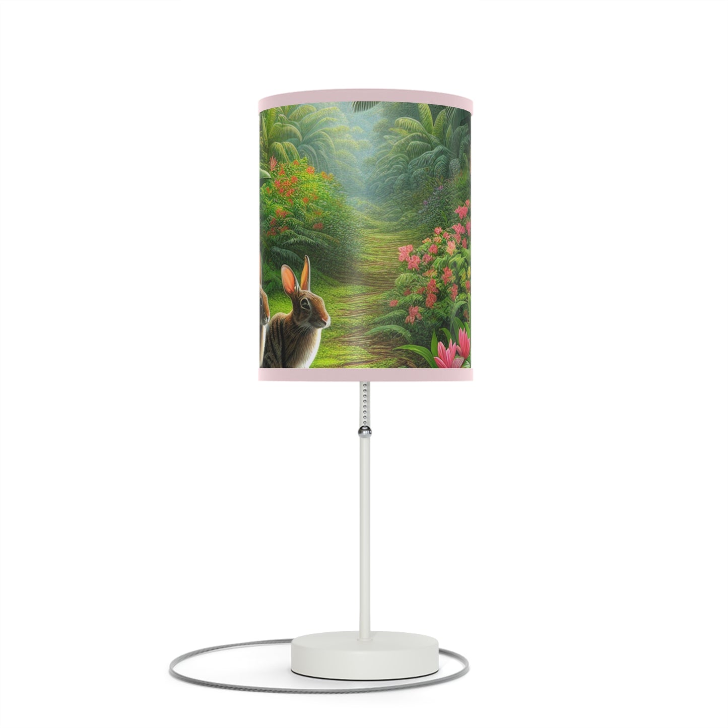 This unique table lamp stand features a steel base that comes with a classy finish in silver or white. The shade of the lamp is available in multiple different trim colors to accent our exclusive design Hidden Rabbits with two rainforest hares hiding quietly from a big jungle cat.