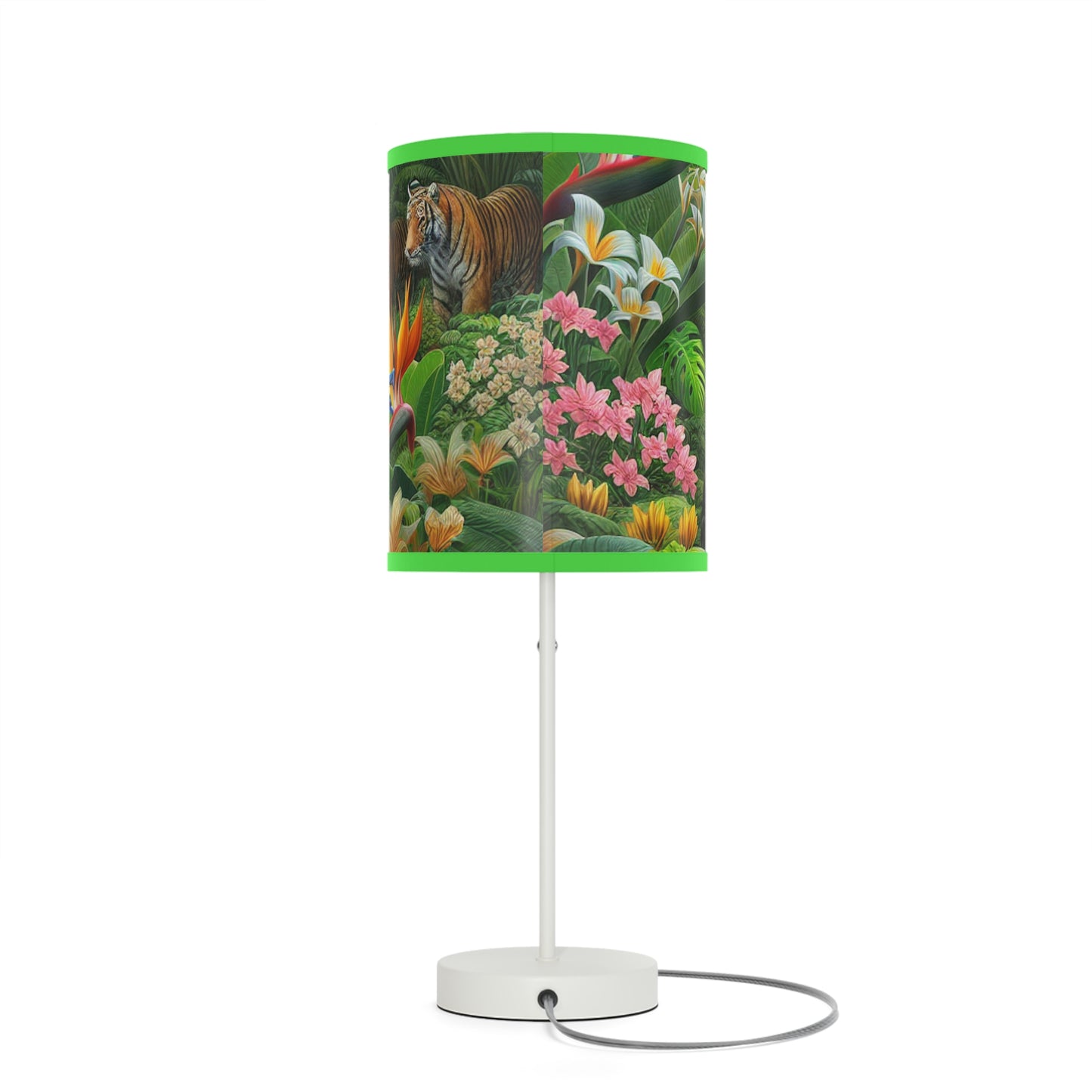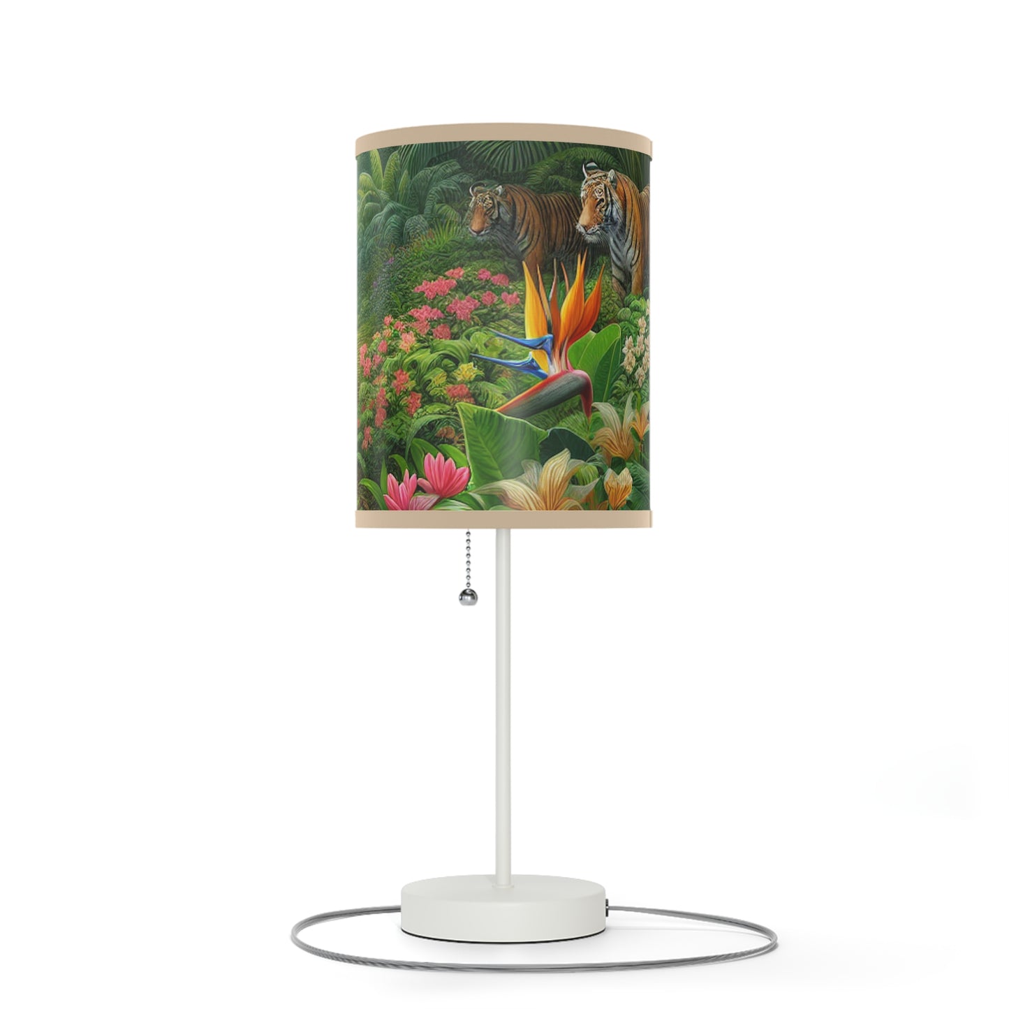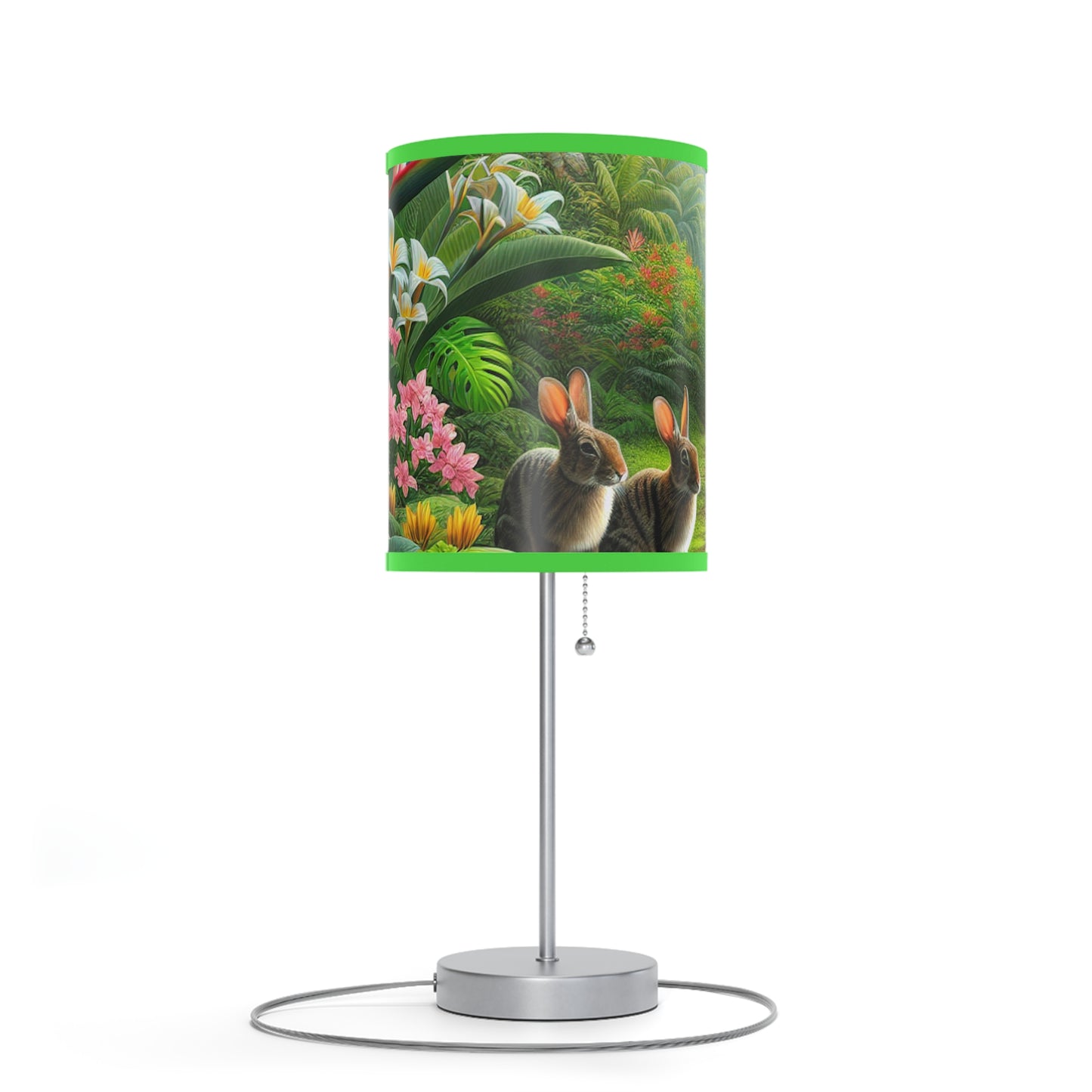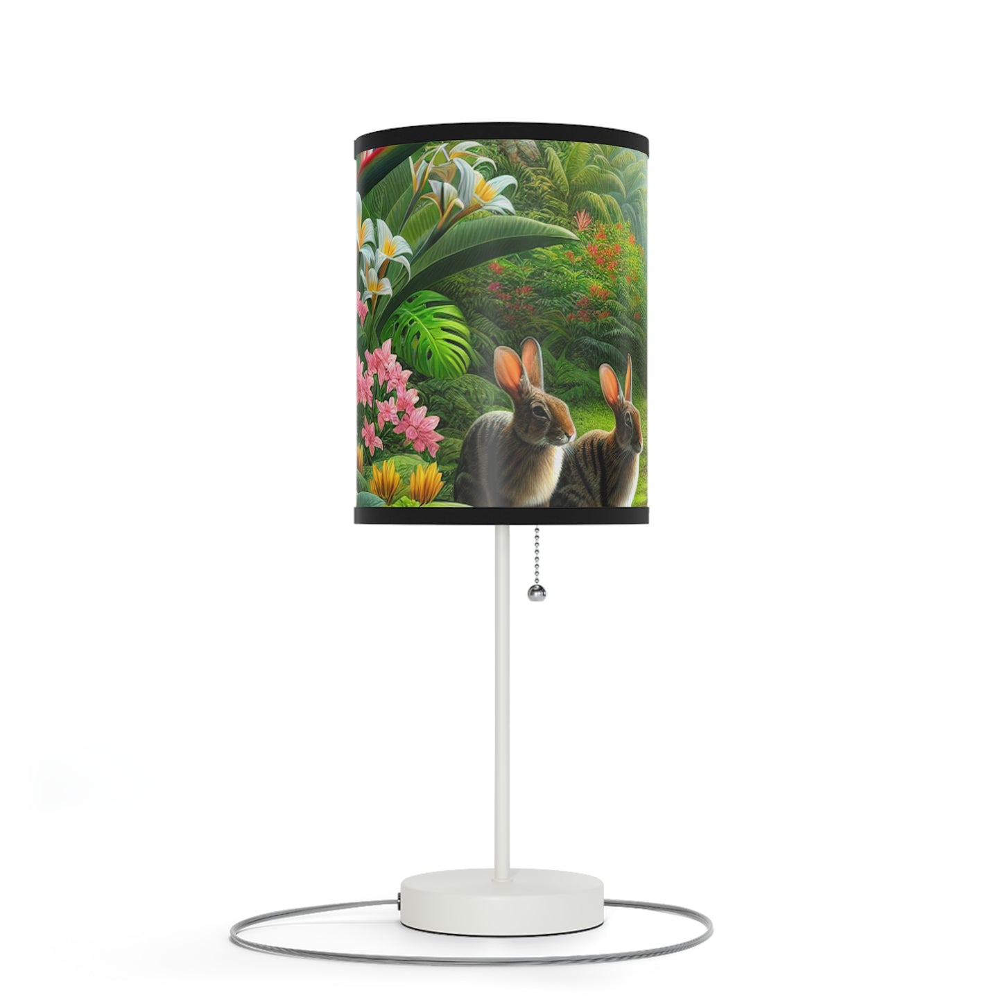 This unique table lamp stand features a steel base that comes with a classy finish in silver or white. The shade of the lamp is available in multiple different trim colors to accent our exclusive design Hidden Rabbits with two rainforest hares hiding quietly from a big jungle cat.