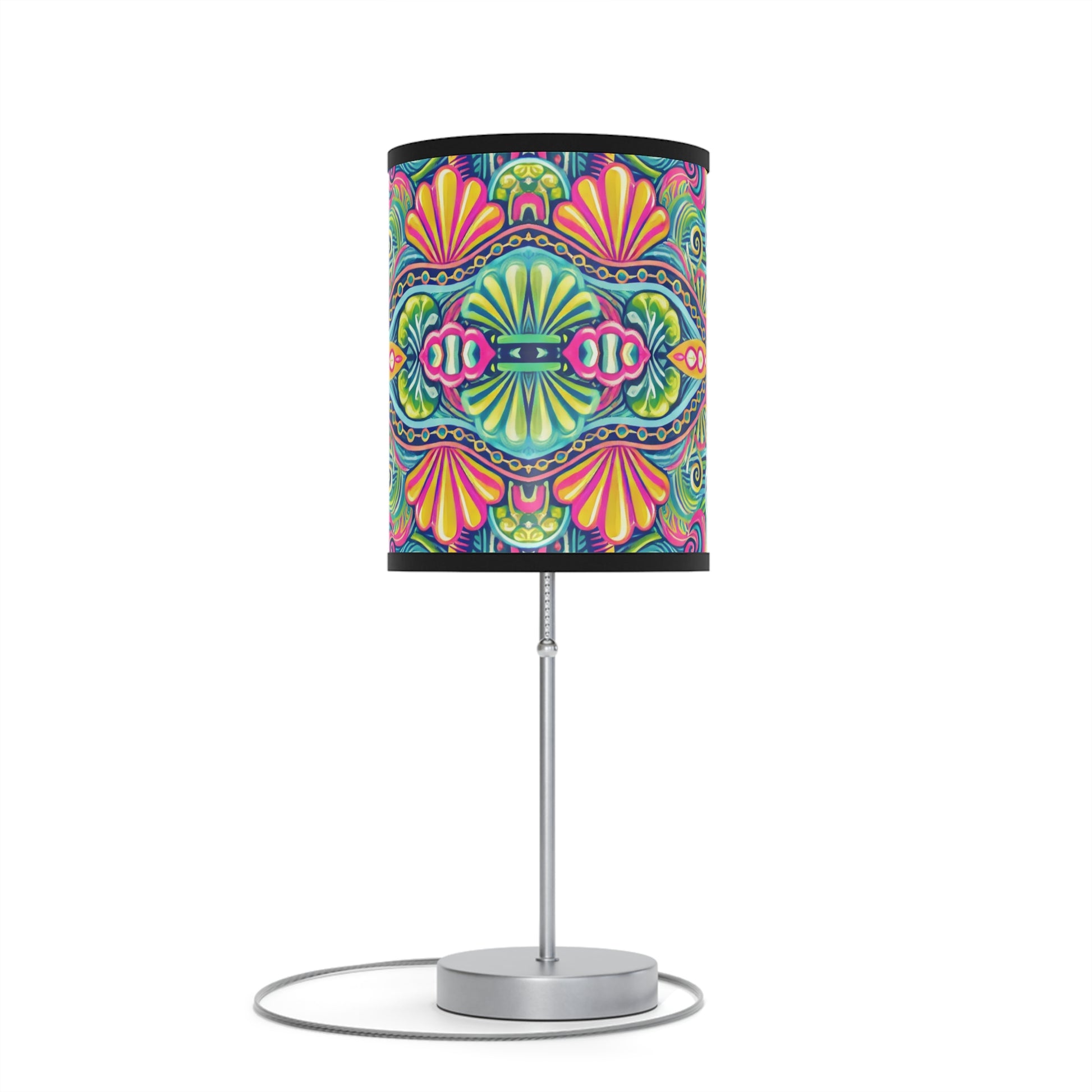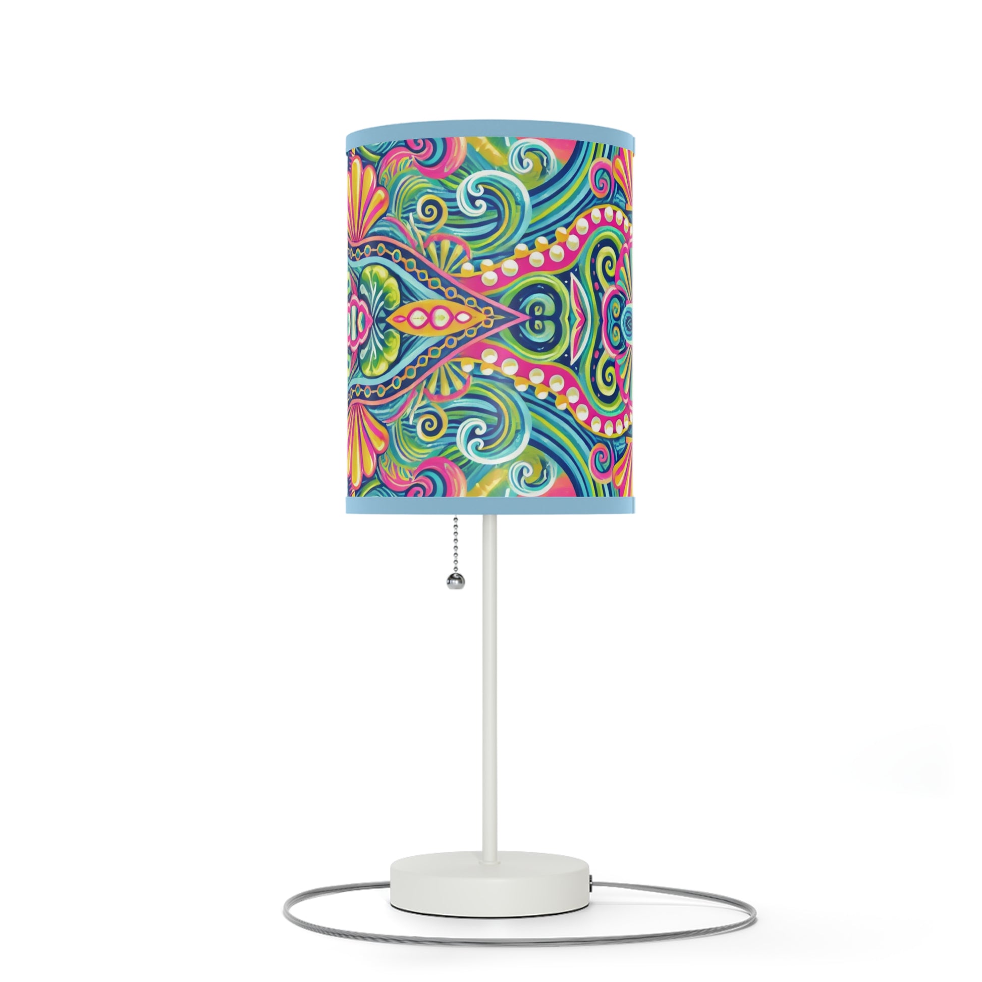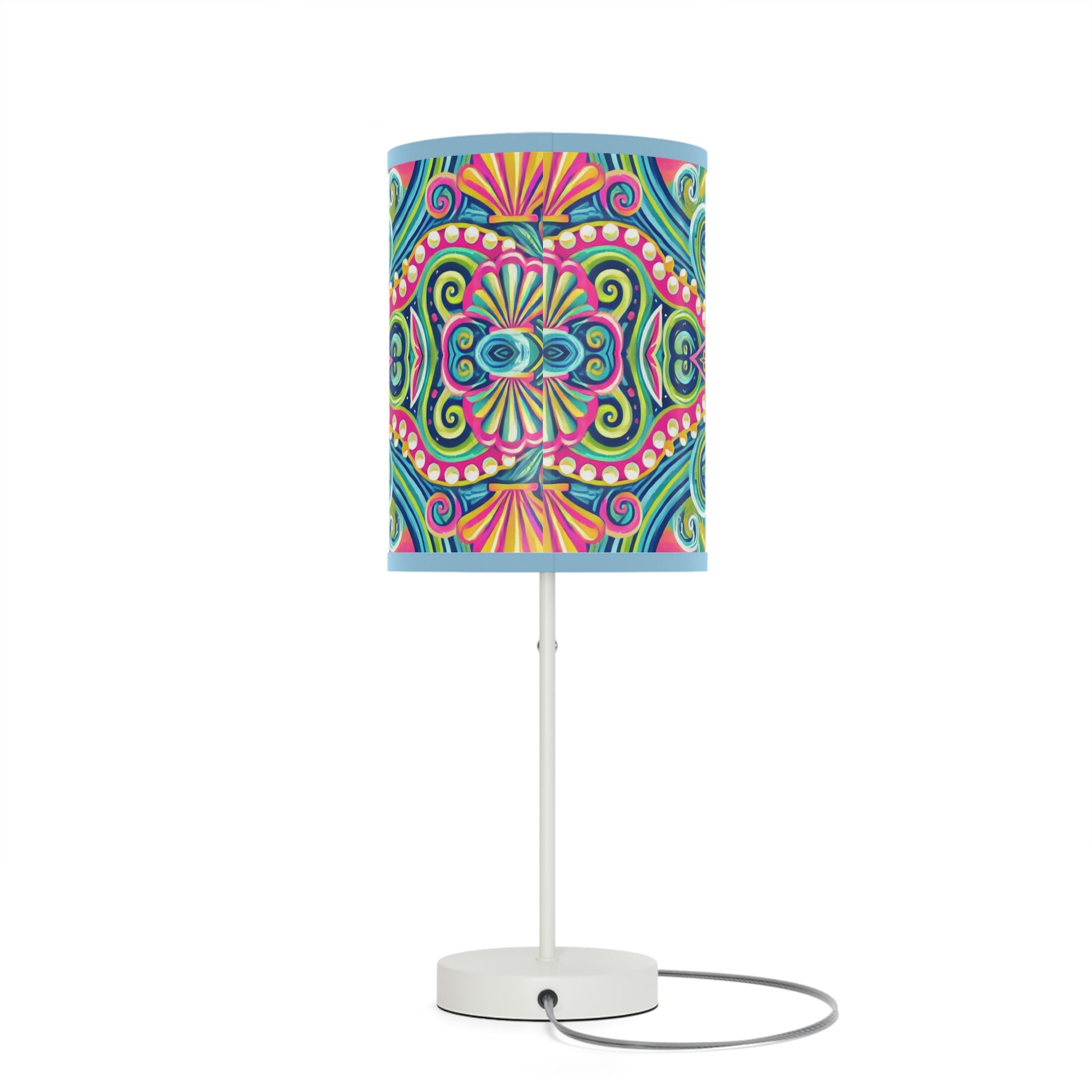 This unique table lamp stand features a steel base that comes with a classy finish in silver or white. The shade of the lamp is available in multiple different trim colors to accent our exclusive kaleidoscope design, Kaleido Bay, a colorful and highly popular tropical scene available on many products.