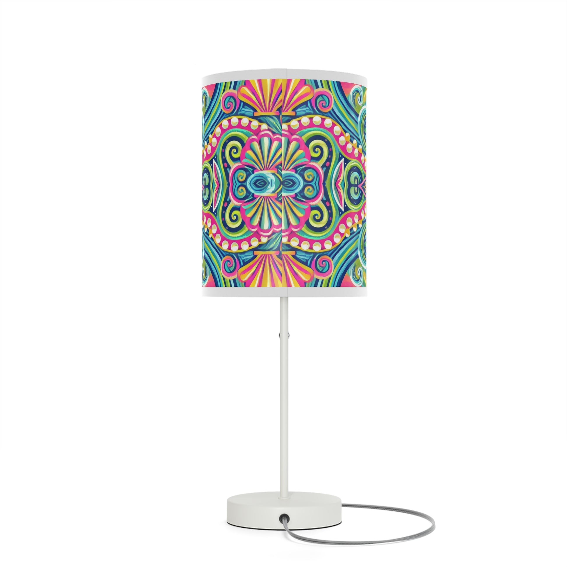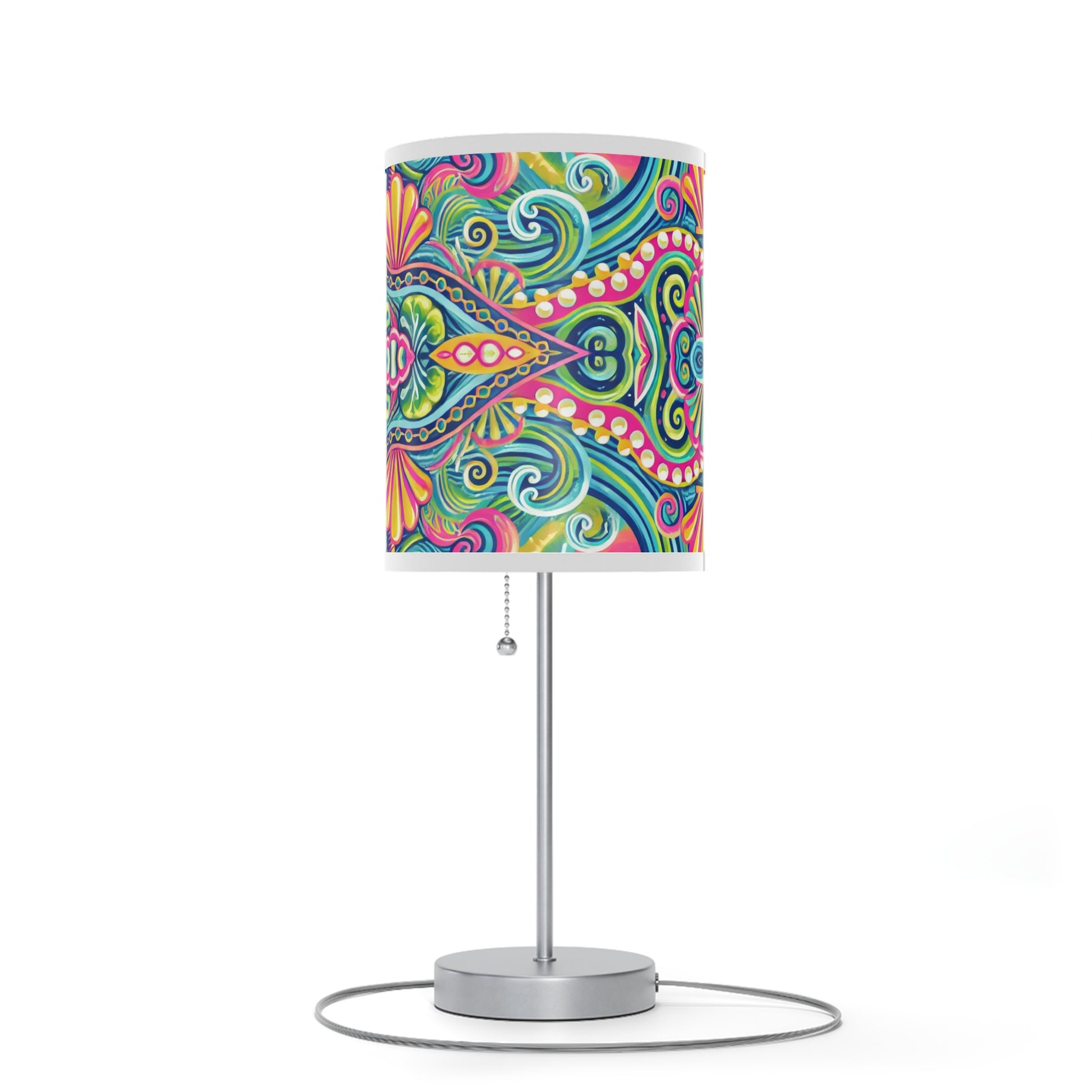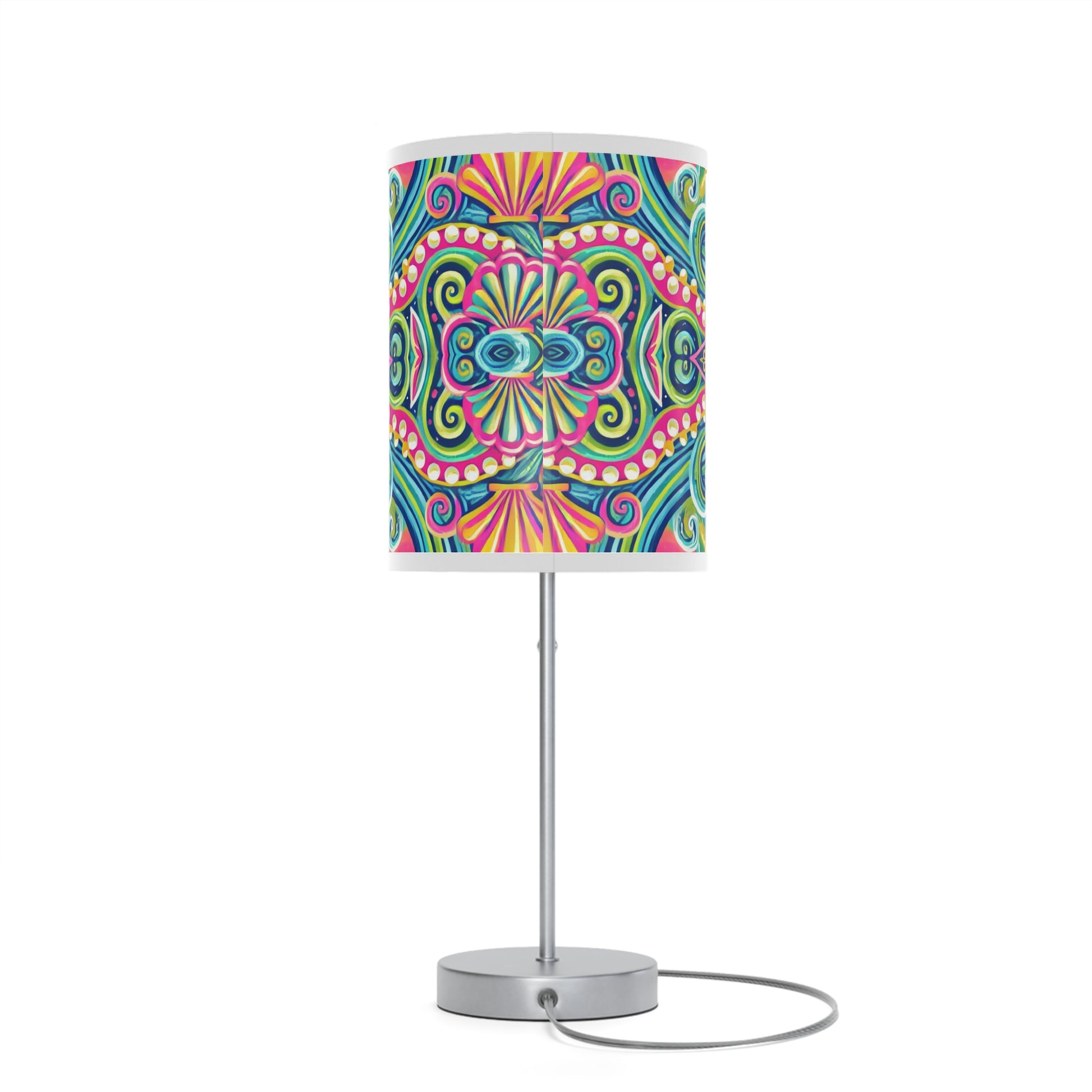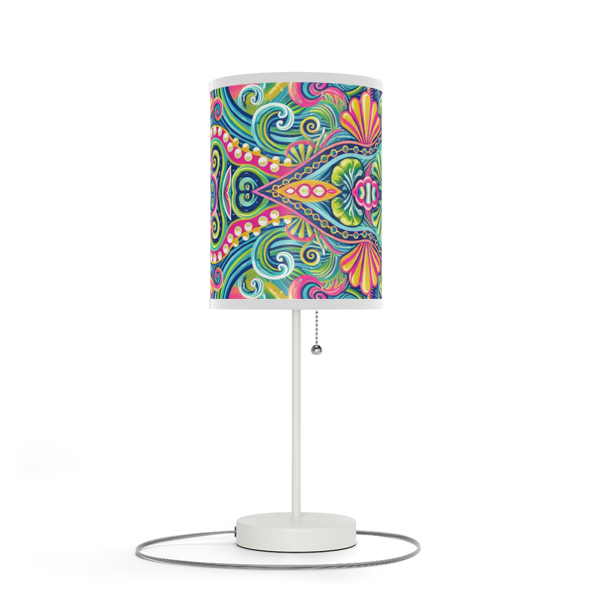 This unique table lamp stand features a steel base that comes with a classy finish in silver or white. The shade of the lamp is available in multiple different trim colors to accent our exclusive kaleidoscope design, Kaleido Bay, a colorful and highly popular tropical scene available on many products.