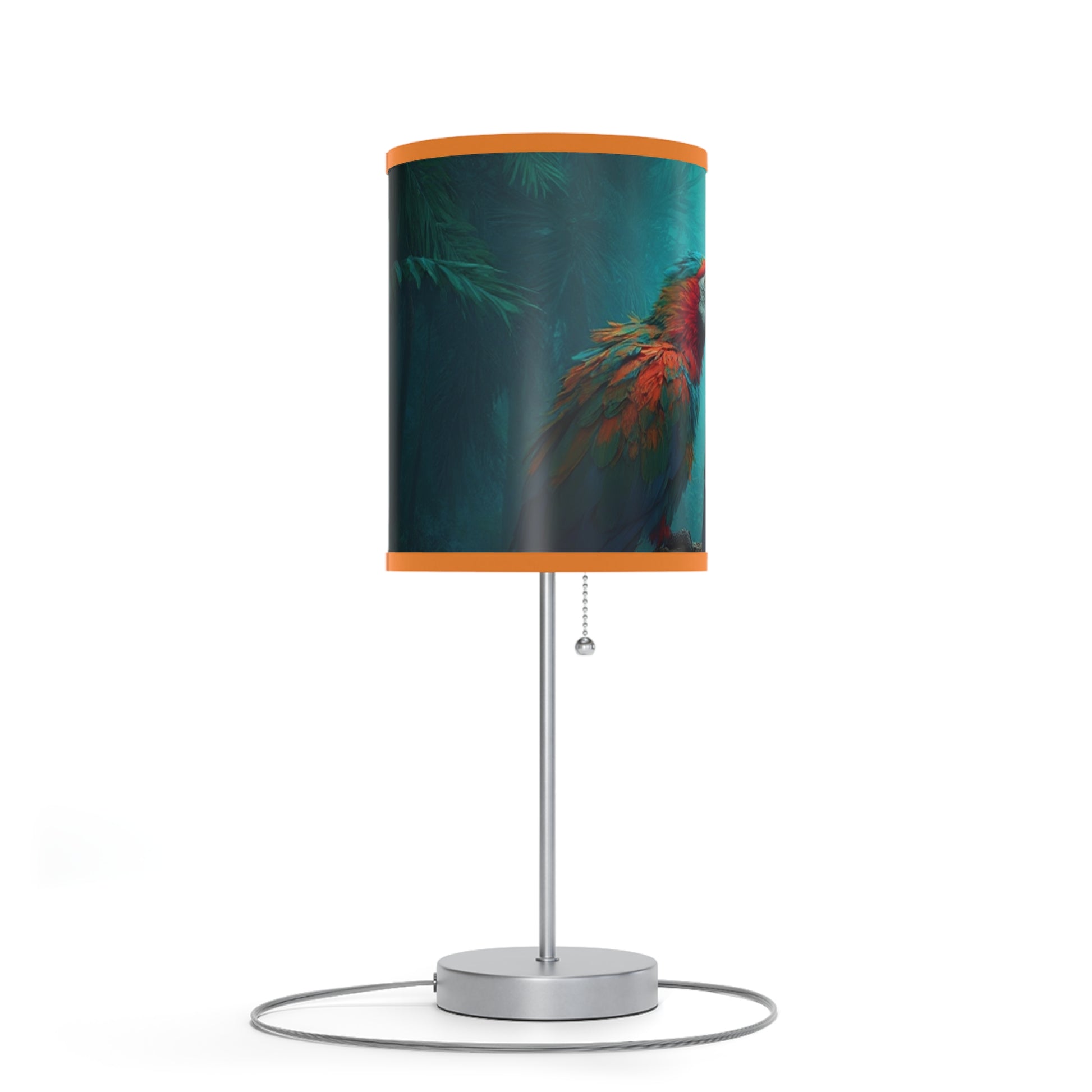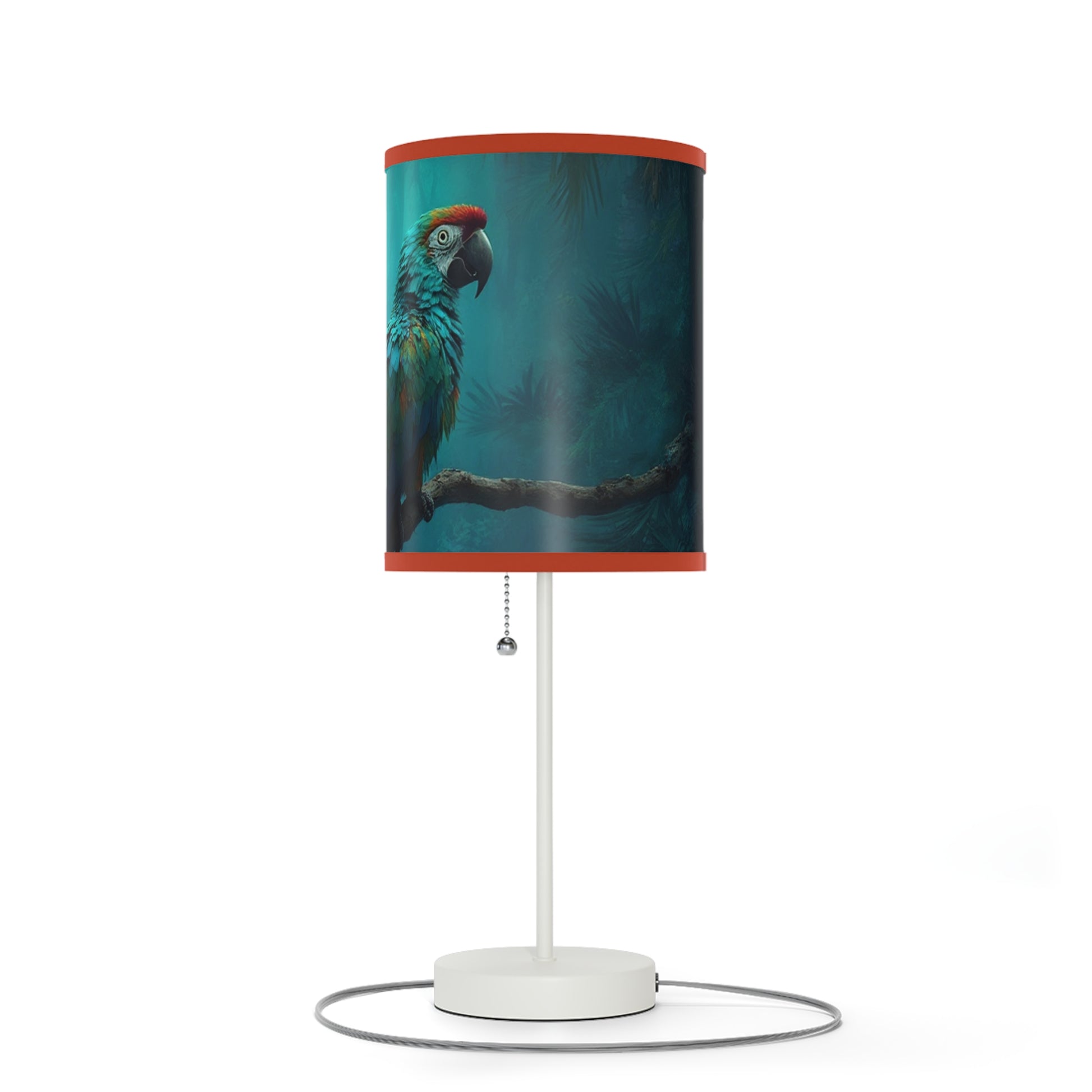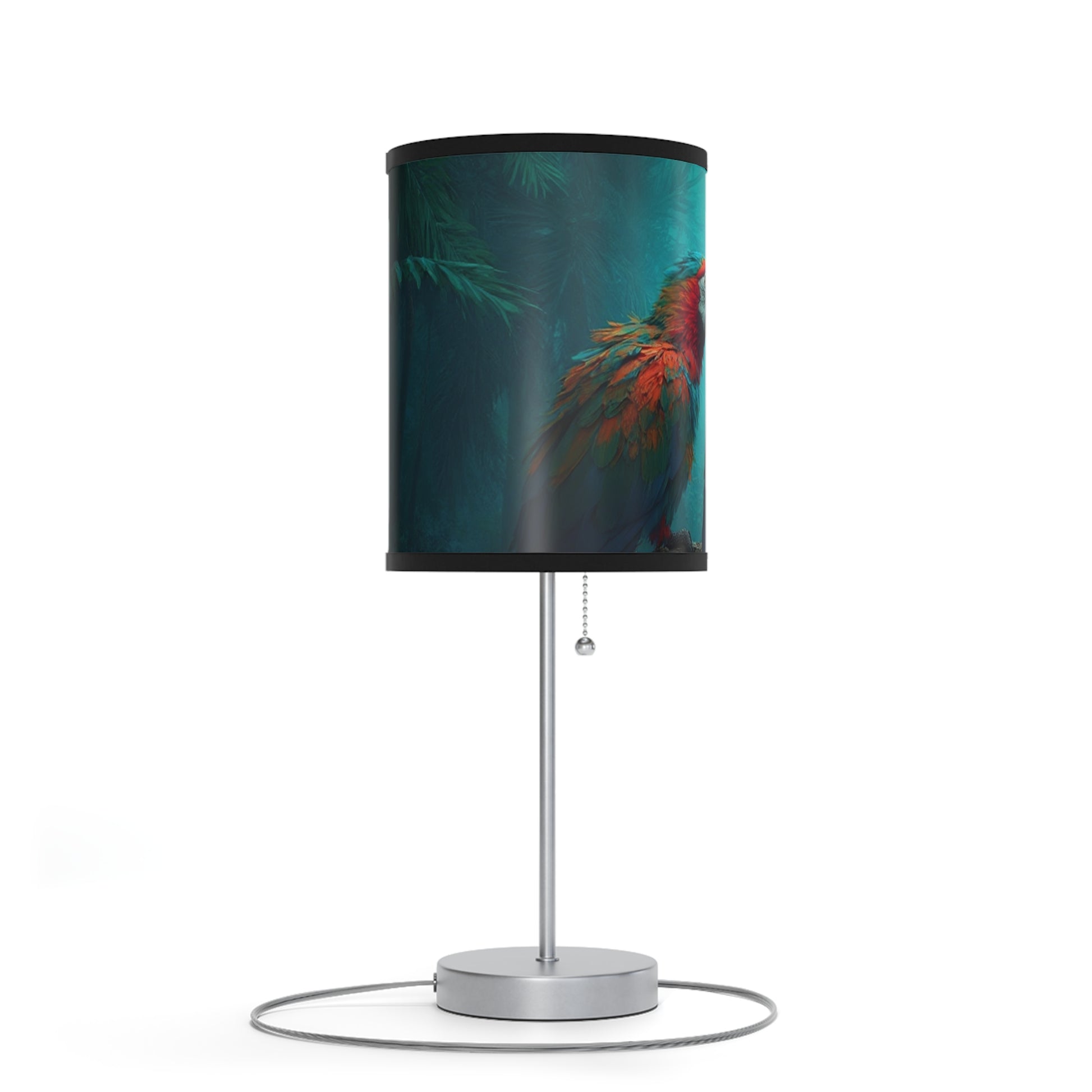 This unique table lamp stand features a steel base that comes with a classy finish in silver or white. The shade of the lamp is available in multiple different trim colors to accent our design of two parrot friends in a rainforest, evoking feelings of a dreamy tropical destination.