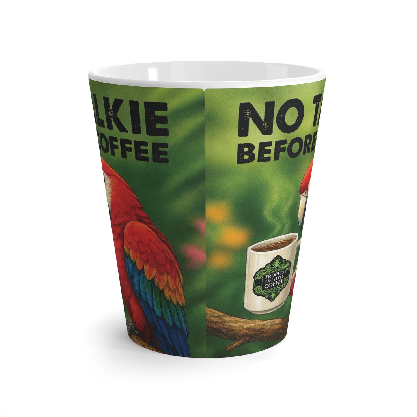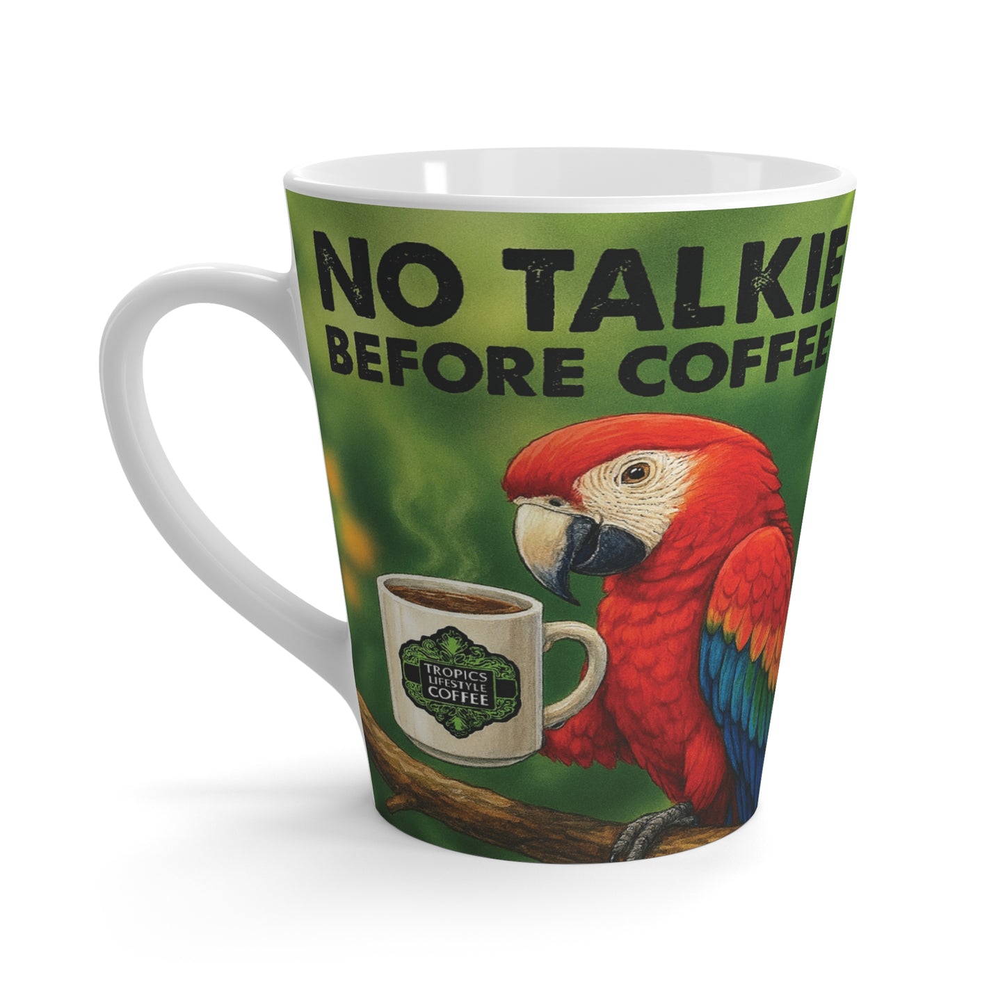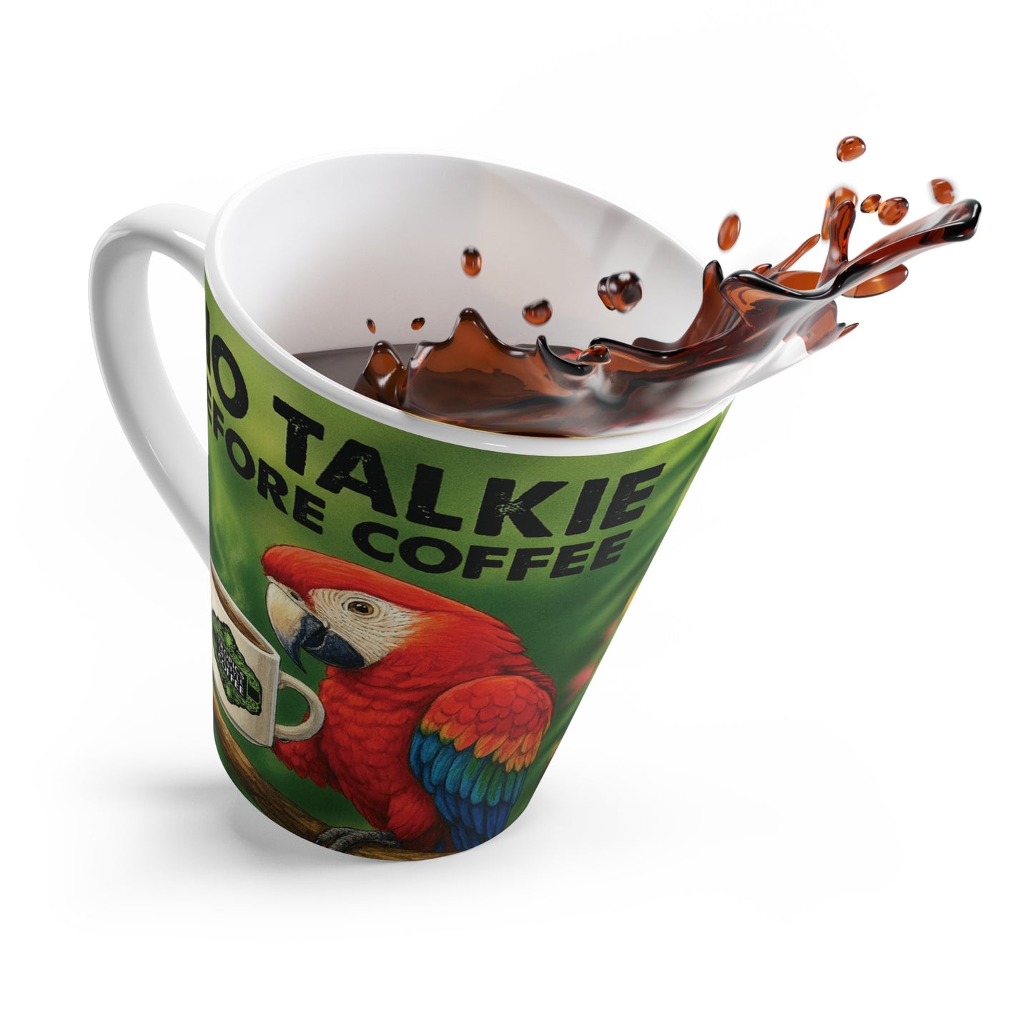 Latte White Mug - No Talkie Before Coffee, Red Parrot