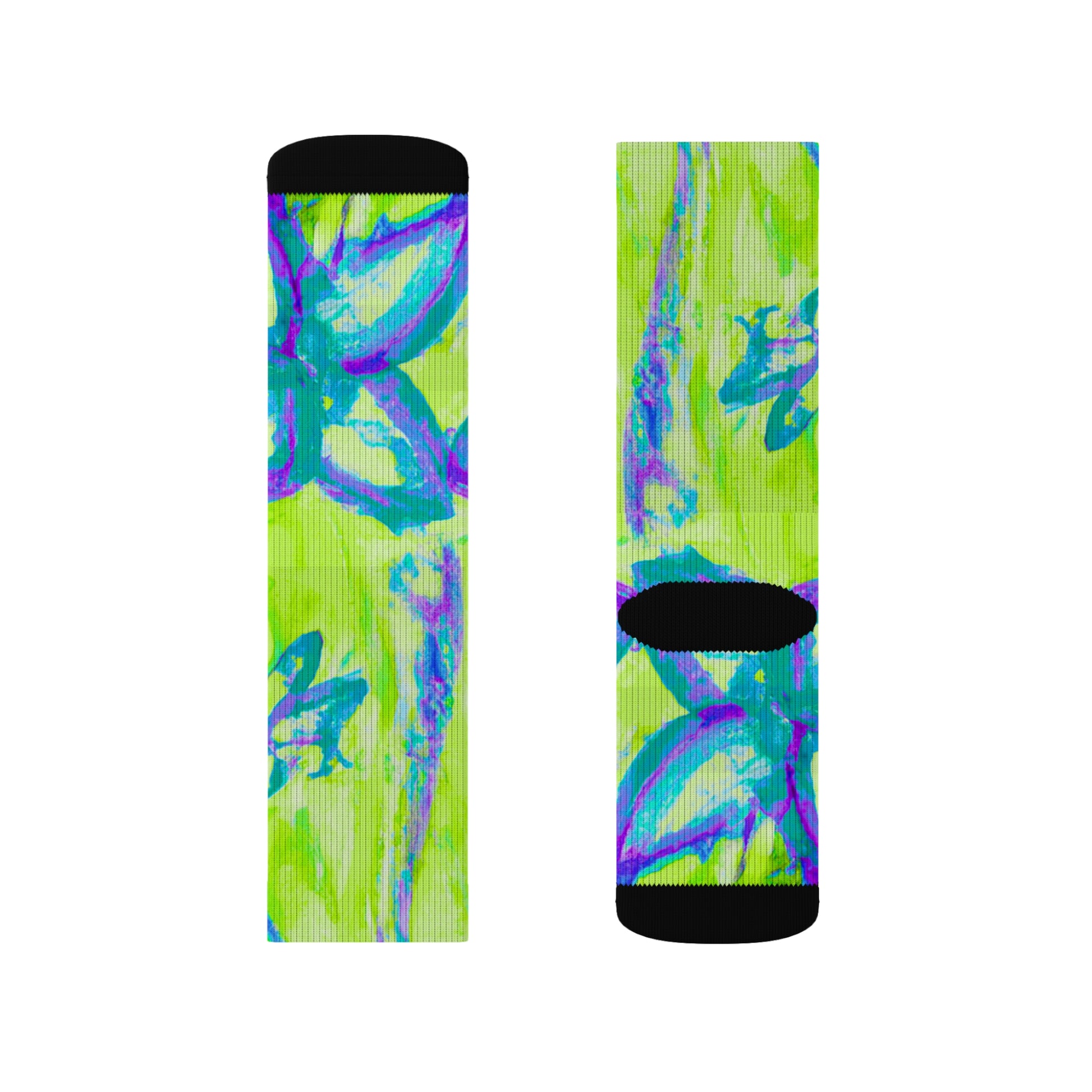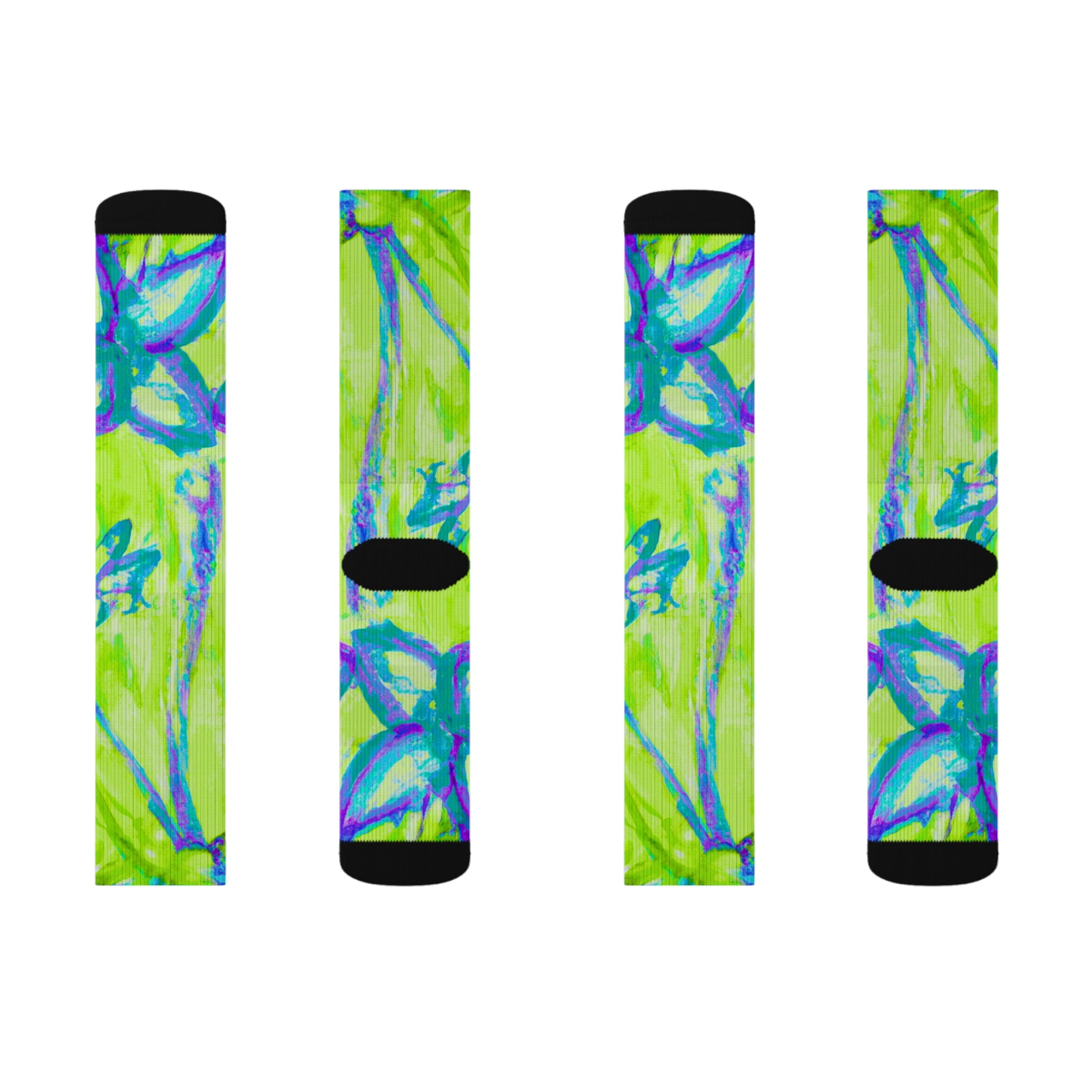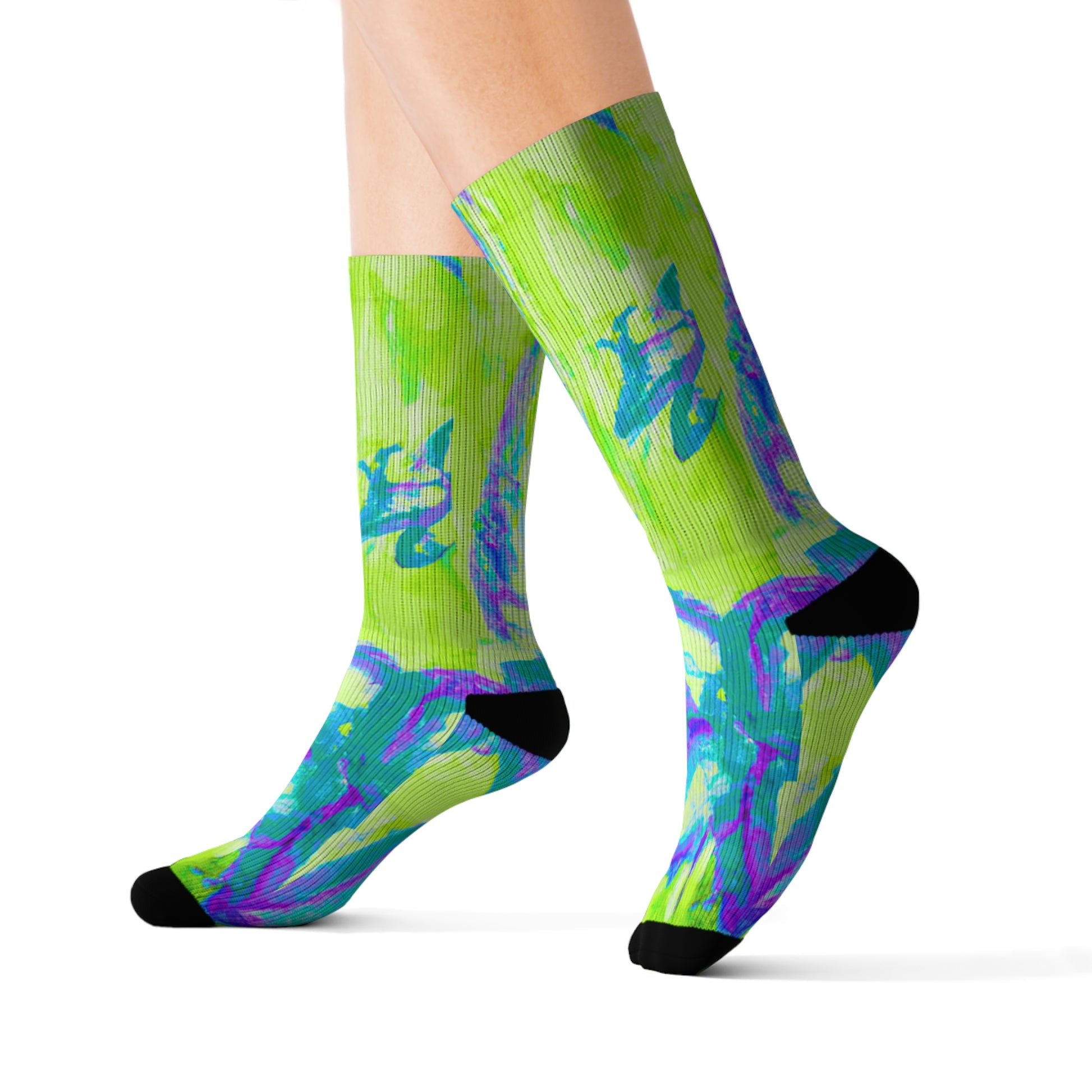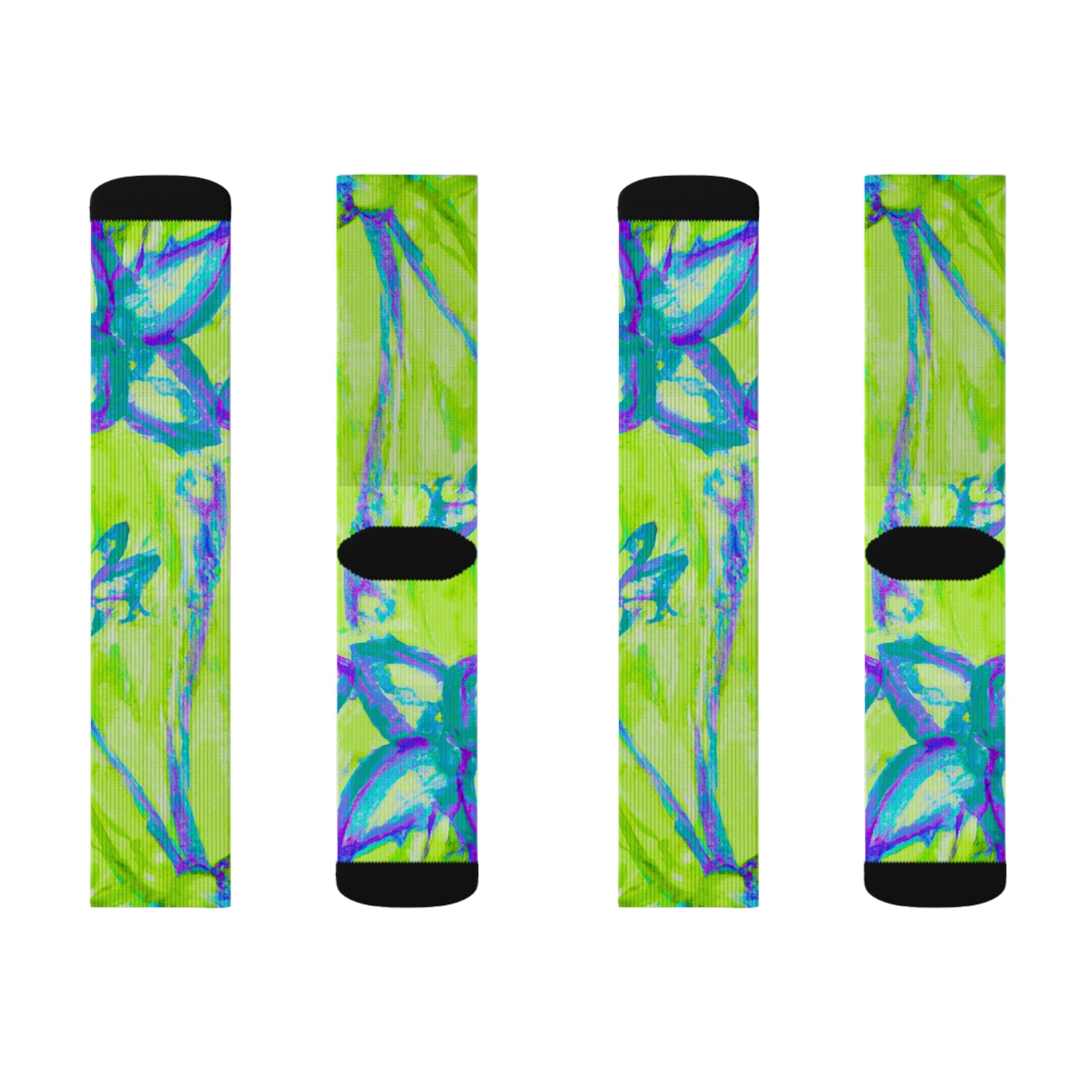 Lime Tropical Doodles Sublimation Fleece-Lined Socks - Colorful Palm Tree/Flower Design