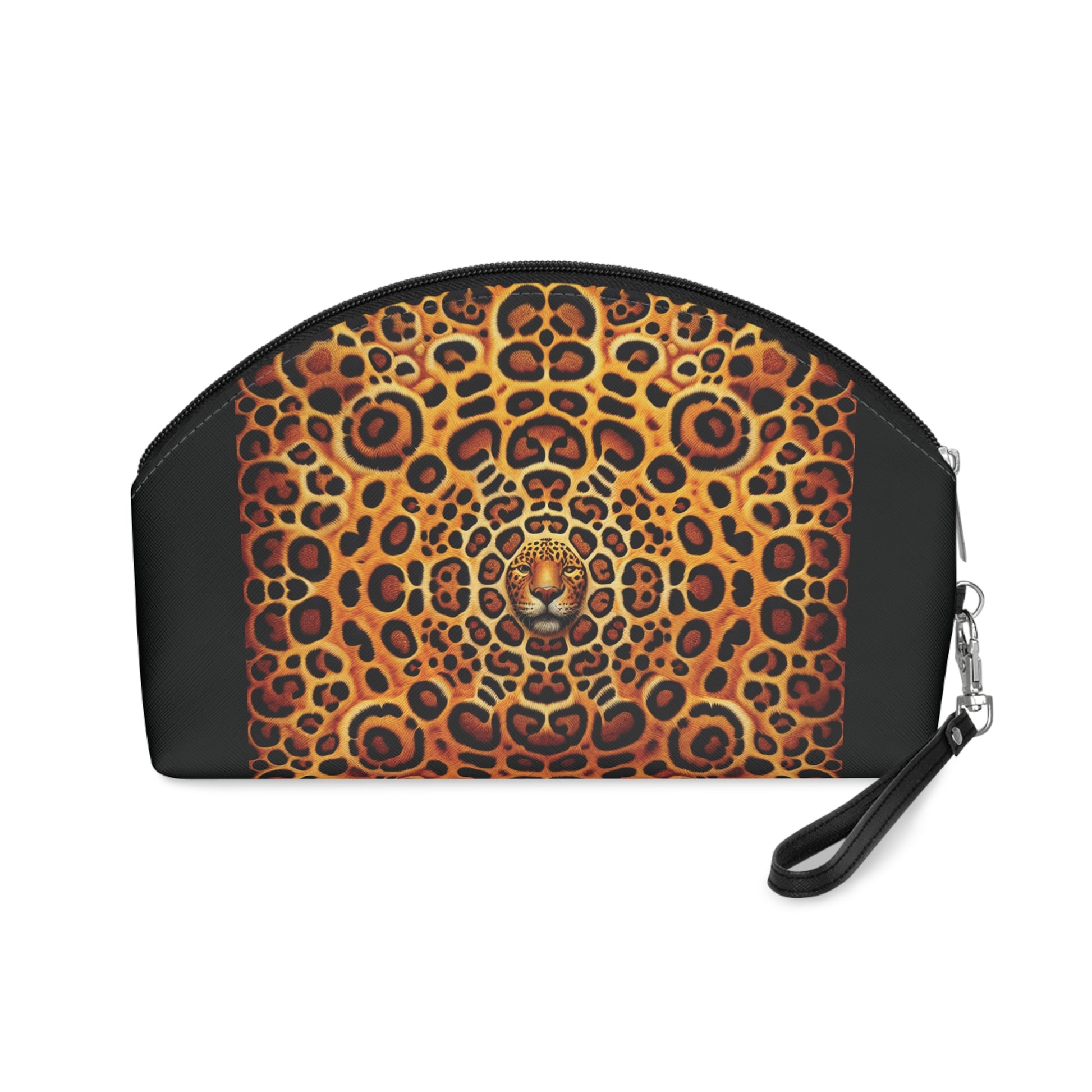 There's more to this makeup bag than meets the eye. Its main purpose is to store cosmetics, but it's often used to carry travel essentials like cables, headphones, medicine, hygiene products -- or even art supply cases. What a beautiful multi-purpose bag you'll be reaching for again and again. Has zipper for safety, and a removable leather strap for comfort. Design is kaleidoscope jaguar spots looking very royal!