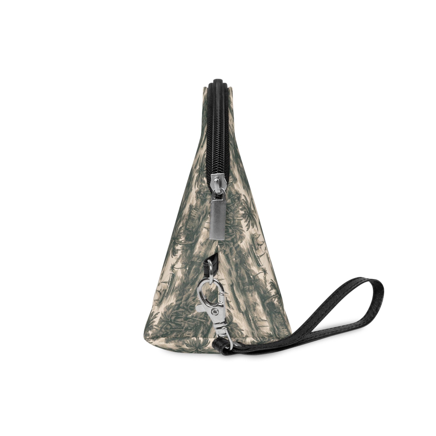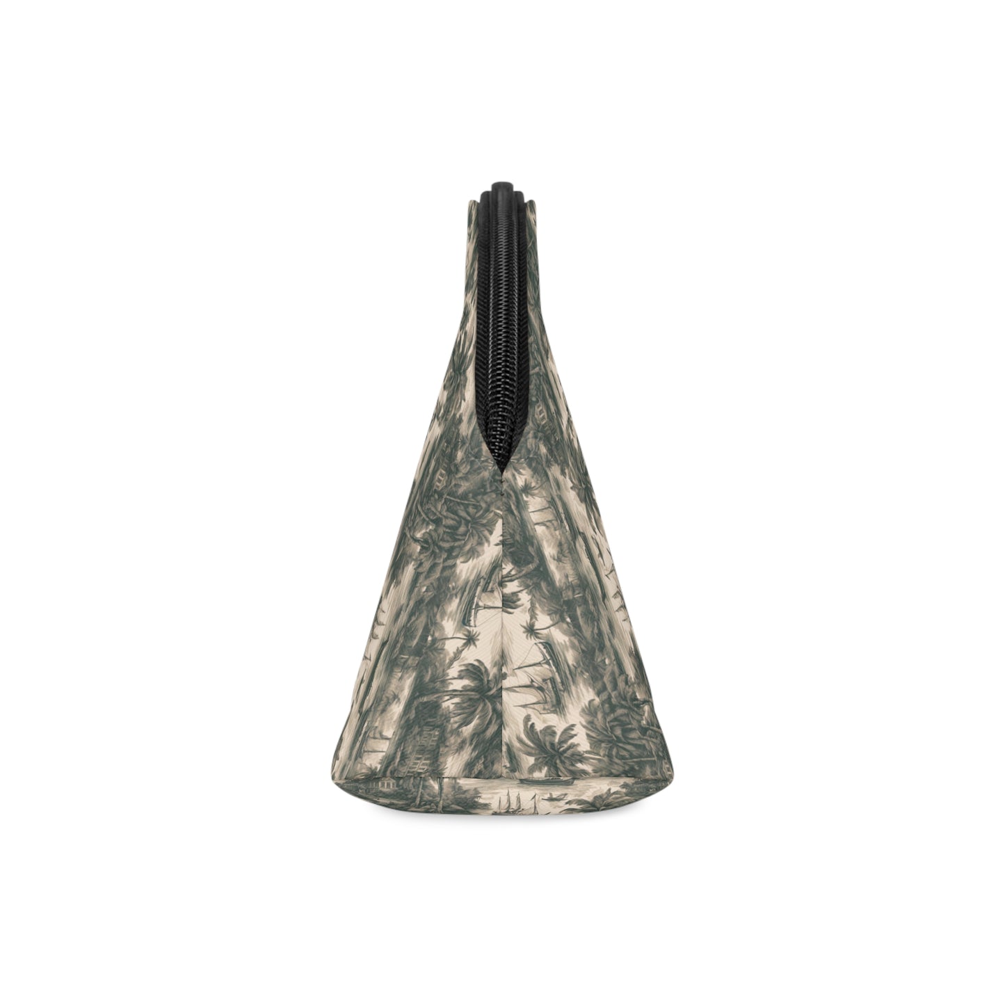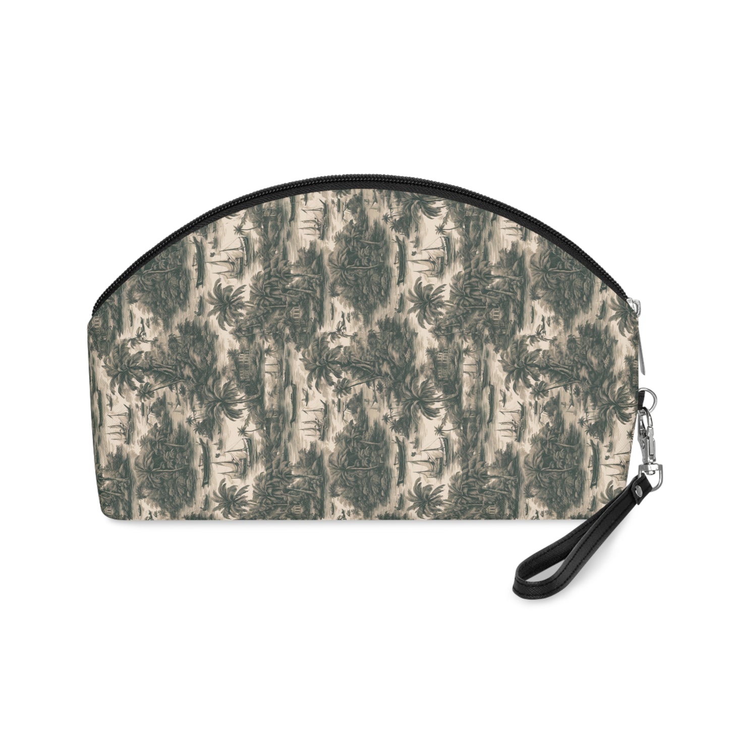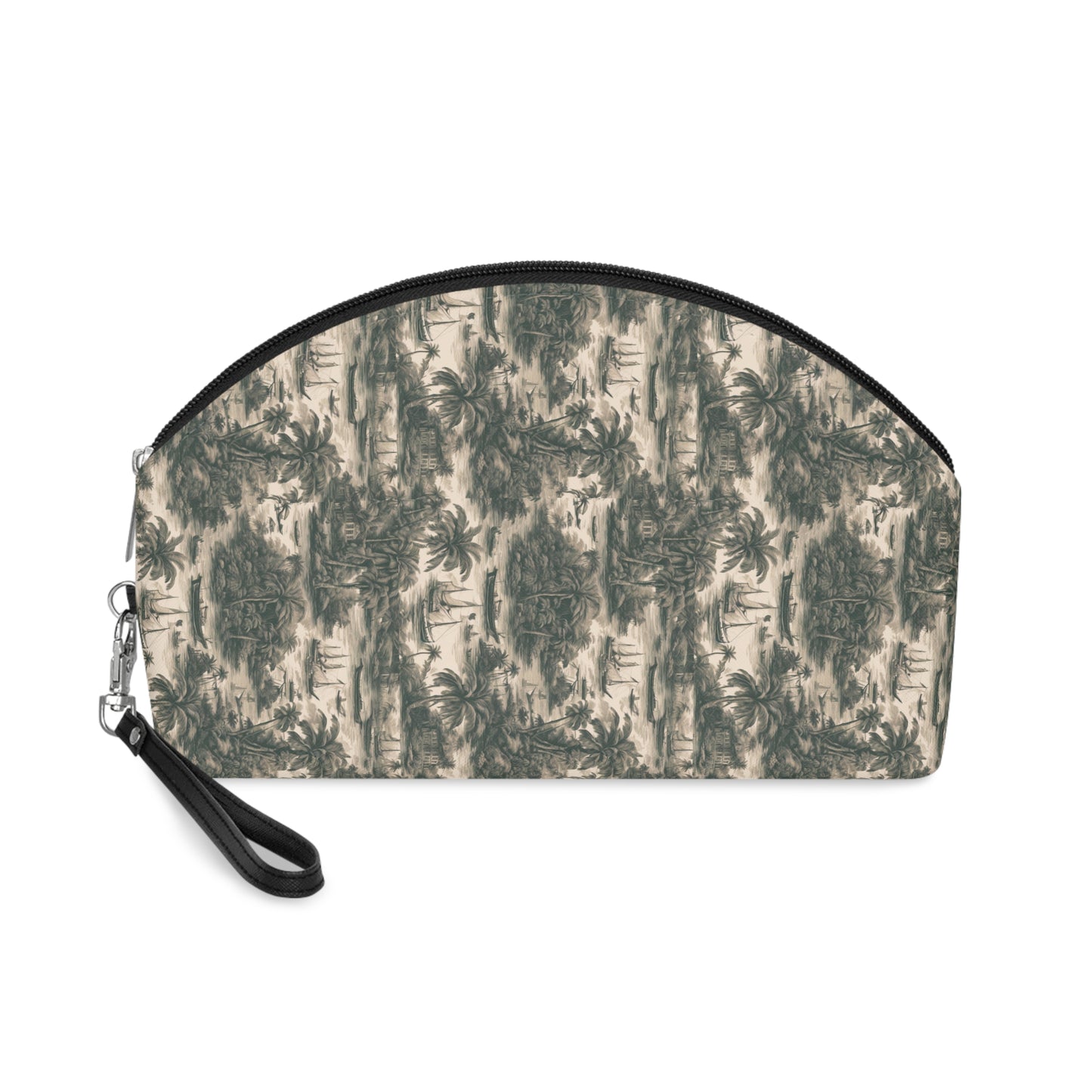 There's more to this makeup bag than meets the eye. Its main purpose is to store cosmetics, but it's often used to carry travel essentials like cables, headphones, medicine, hygiene products -- or even art supply cases. What a beautiful multi-purpose bag you'll be reaching for again and again. Has zipper for safety, and a removable leather strap for comfort. Features our exclusive Tropical Toile #1, black design showcasing a tropical toile landscape that will draw compliments with its minature palm trees, boats, placid oceans, exotic islands and so much more!