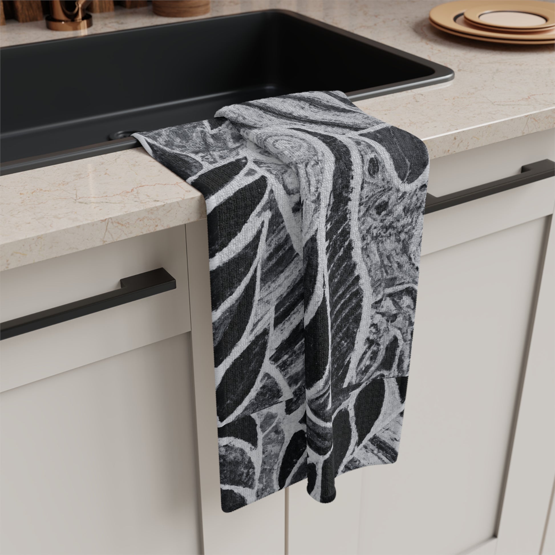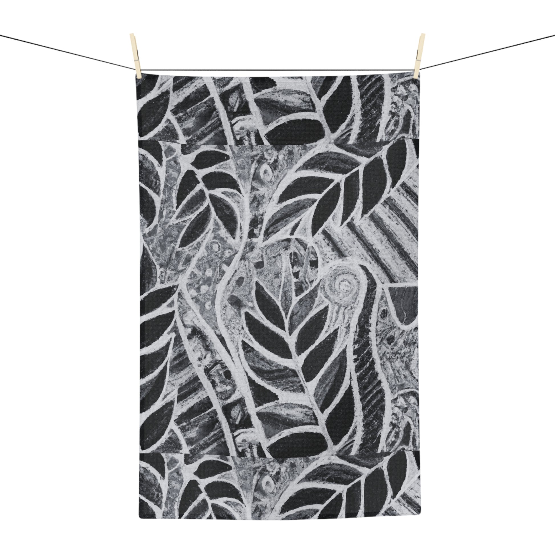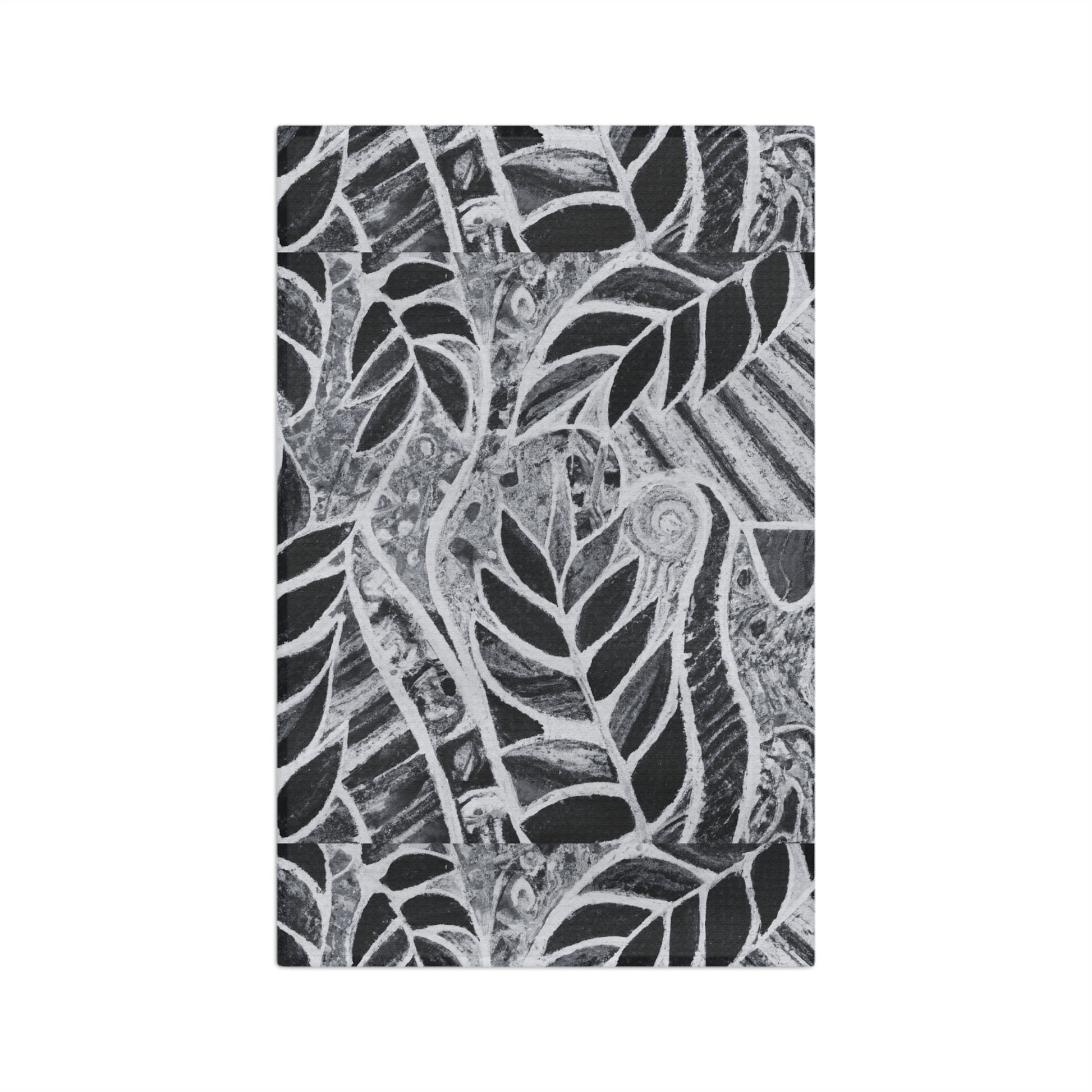 A soft, quick-drying microfiber tea towel printed with a hand-drawn monochrome foliage pattern for "the minimalist" evoking Amazon rainforest vibes. The high-contrast leaf motifs and textured background bring a touch of artisan studio charm to everyday kitchen tasks. Light and highly absorbent, it slips into a busy routine—drying glassware, wiping counters, or hanging from a hook as a little bit of wall art when company comes. The sewn hem keeps the edges tidy through frequent use, and the single-sided print preserves the pattern’s bold lines while staying low-profile on the reverse. A practical piece that adds calm, sketchbook-style botanical energy to small morning rituals or quiet weekend baking sessions.